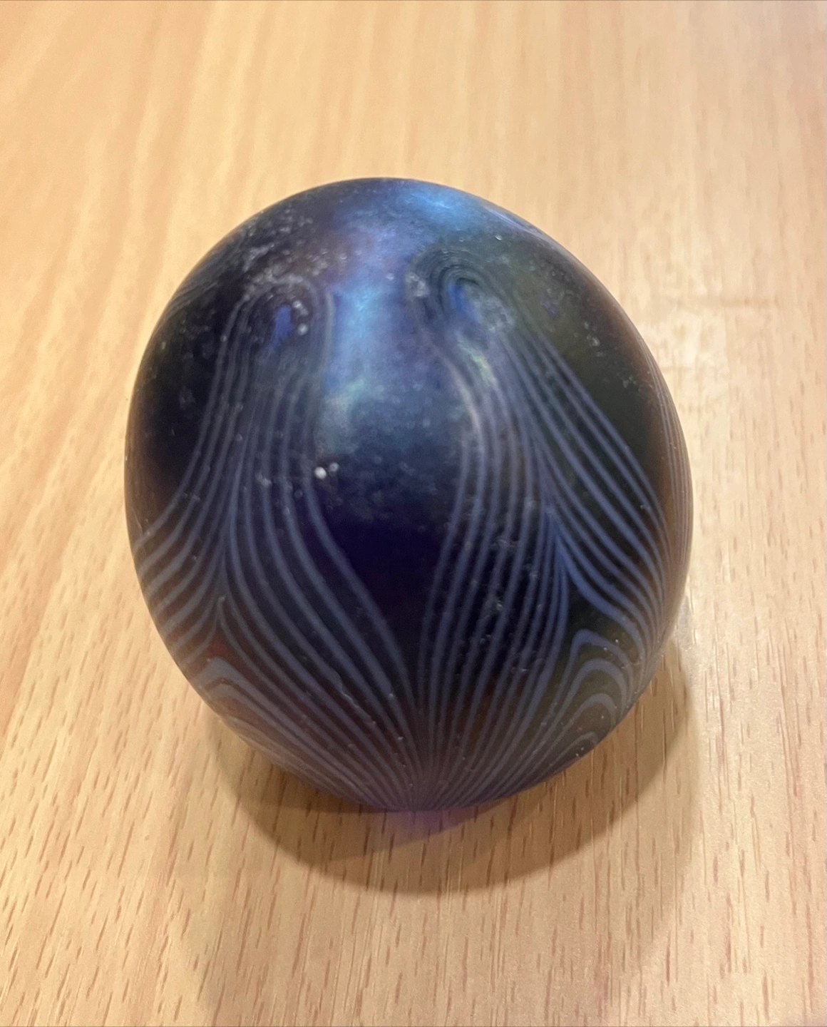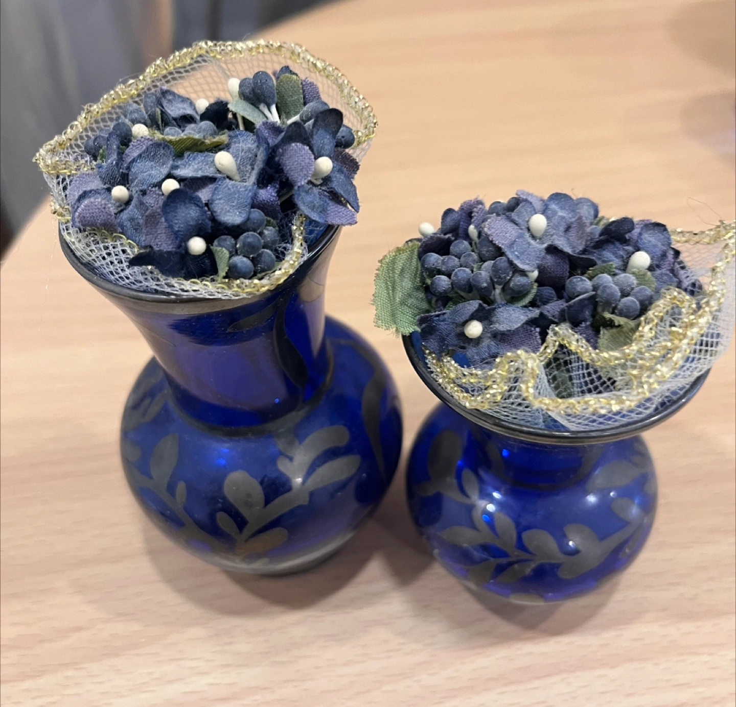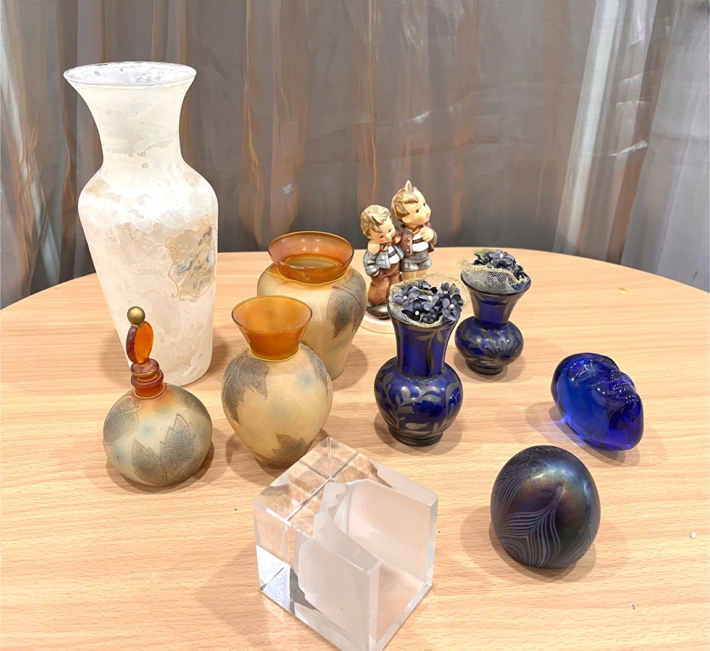 Small decorative cobalt blue glass vases. Features etched detailing. Topped with faux floral arrangements. Valenti decorative cube frosted and clear glass (candle holder. Egg shape paper weight iridescent murane. A Swedish Verni Vallient mini sculpture blue glass, Brains. Flower vase with painted cherub. A Hummel figurine of two pals.