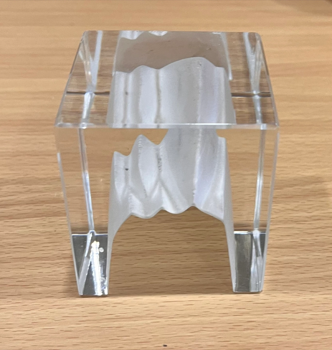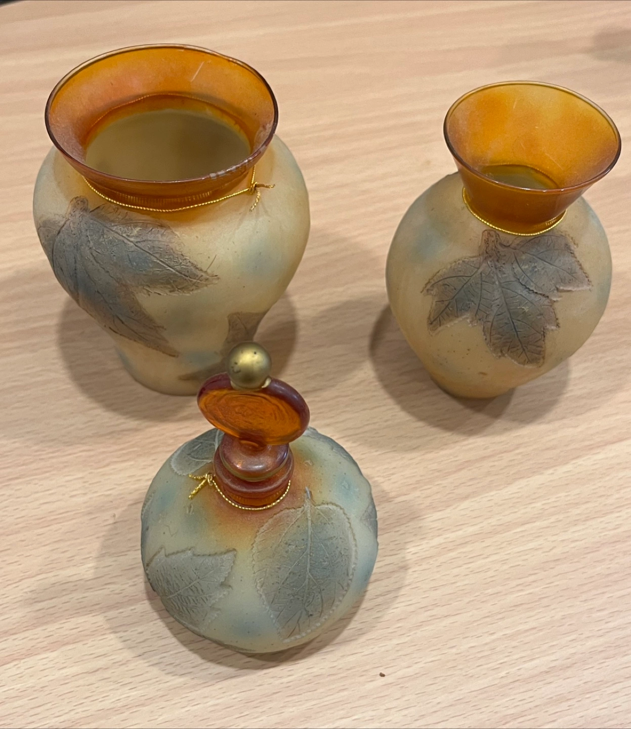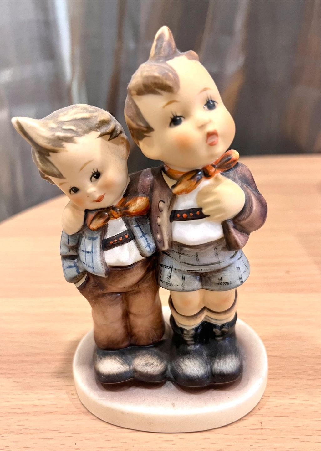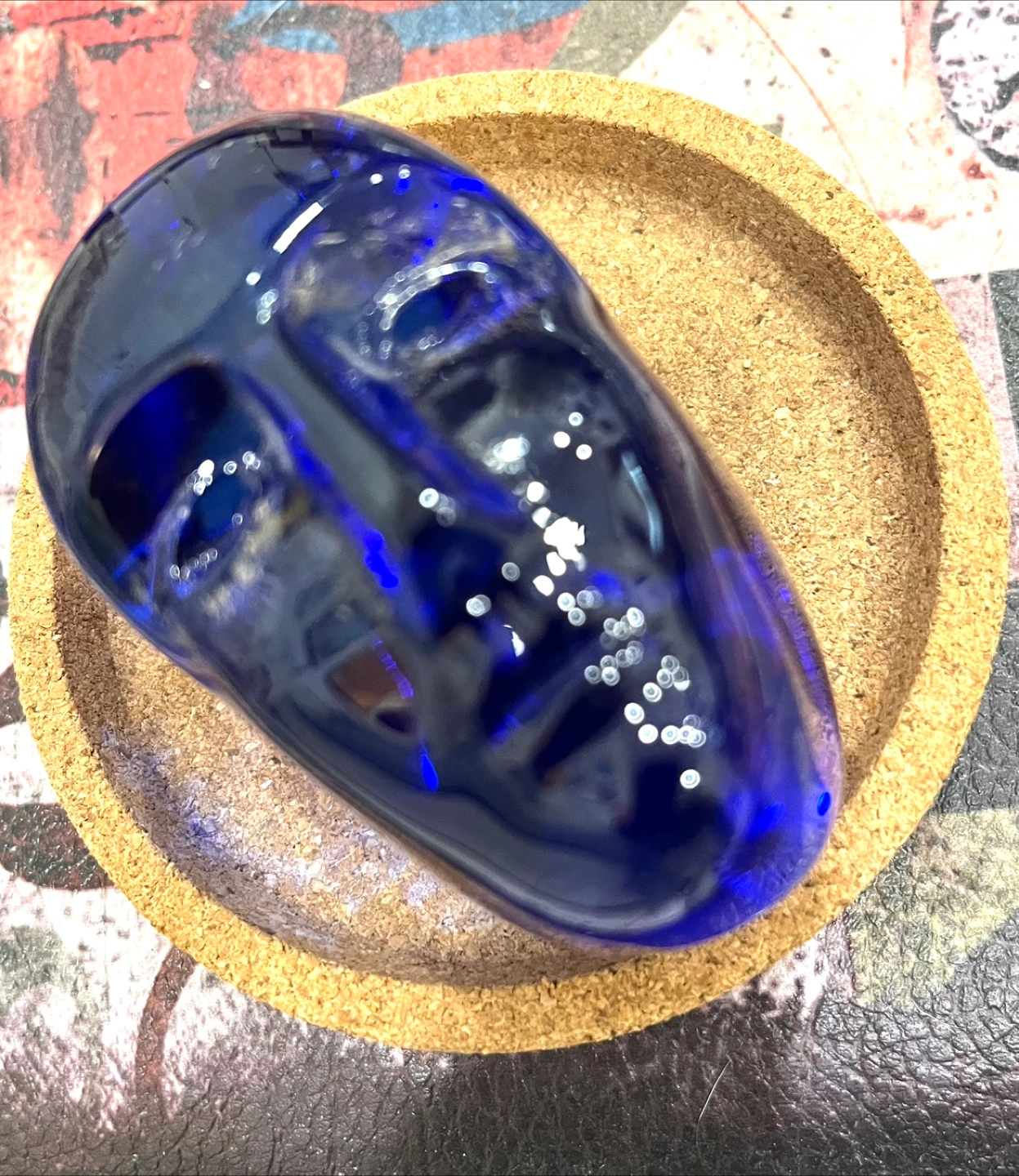 Small decorative cobalt blue glass vases. Features etched detailing. Topped with faux floral arrangements. Valenti decorative cube frosted and clear glass (candle holder. Egg shape paper weight iridescent murane. A Swedish Verni Vallient mini sculpture blue glass, Brains. Flower vase with painted cherub. A Hummel figurine of two pals.
