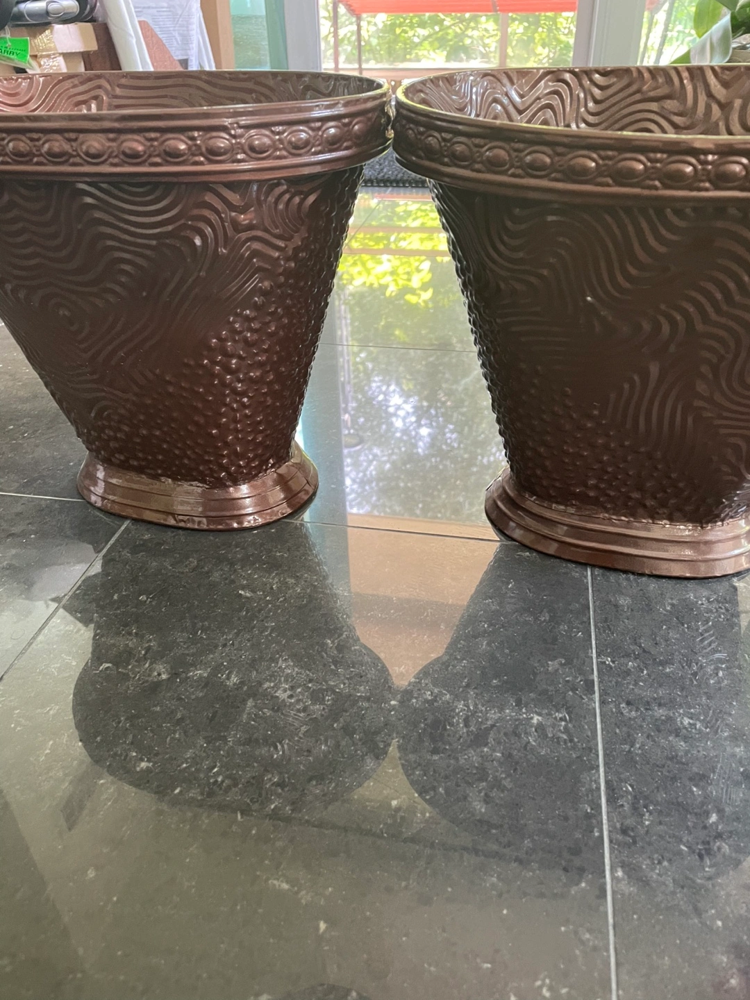 Two dark brown decorative planters. Unique textured design. Oval shape, wide top, and narrow base. Suitable for indoor or outdoor use. $10 each or $18 for 2.