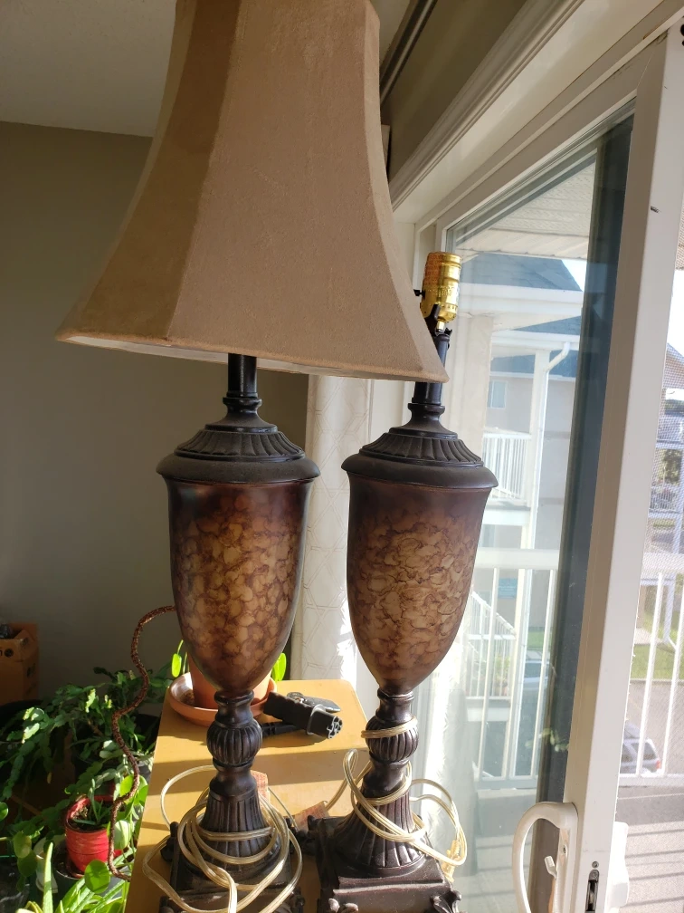 Here's a pair of decorative table lamps that could be a great addition to your home! They feature a unique design with a brown and bronze colour scheme. The lamps are in good condition and ready to brighten up any room