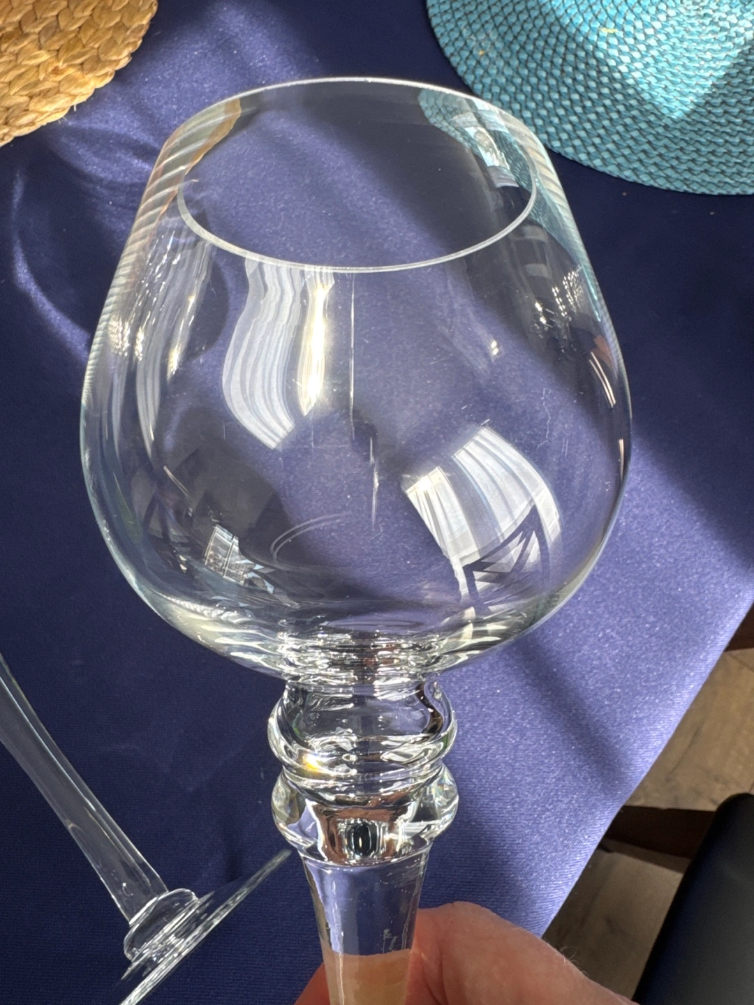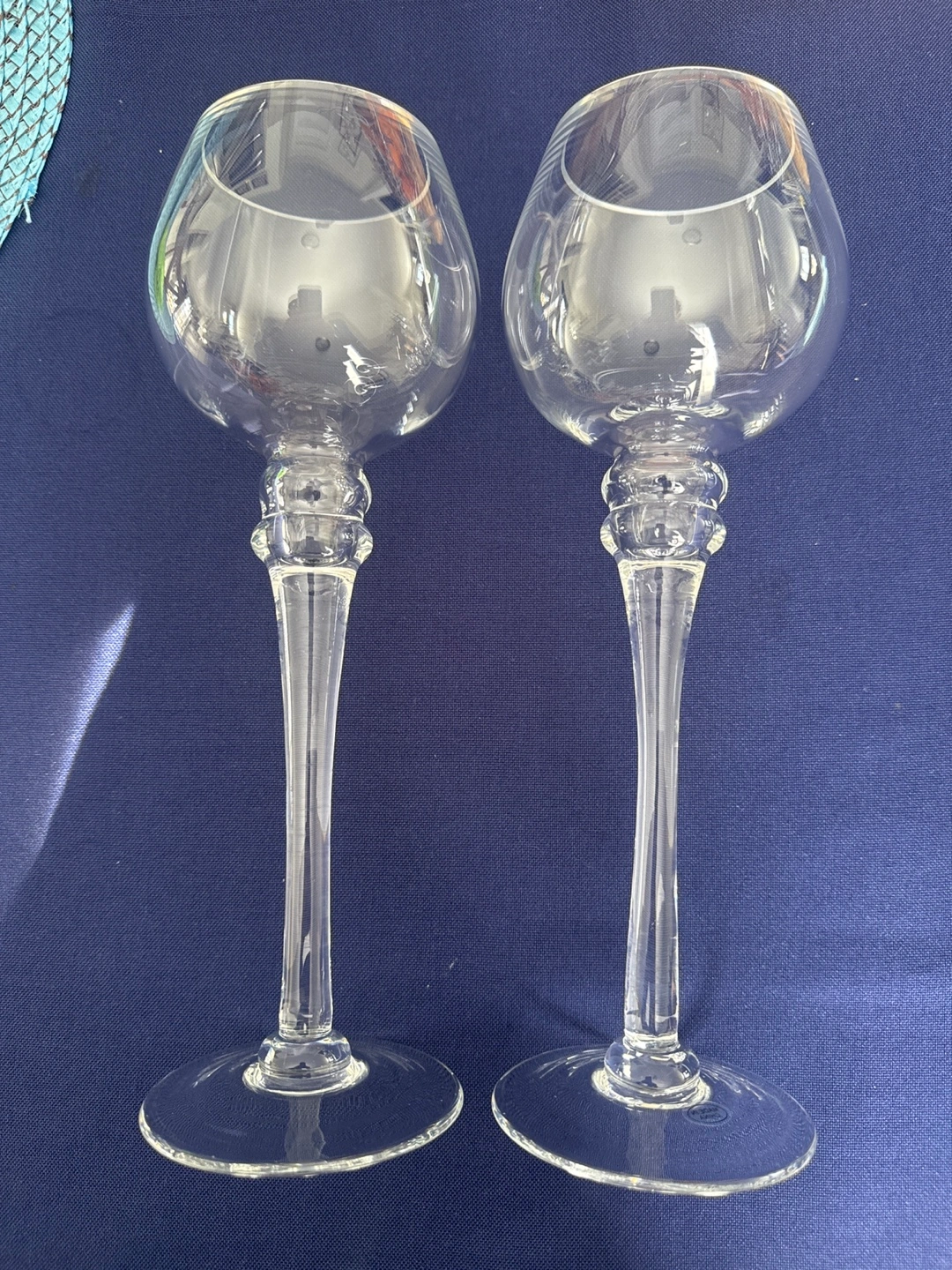 Set of two tall clear glass candle holders. Elegant design, perfect for centerpieces or home decor. Long stems and wide bowls. Excellent condition. Only used for staging home.