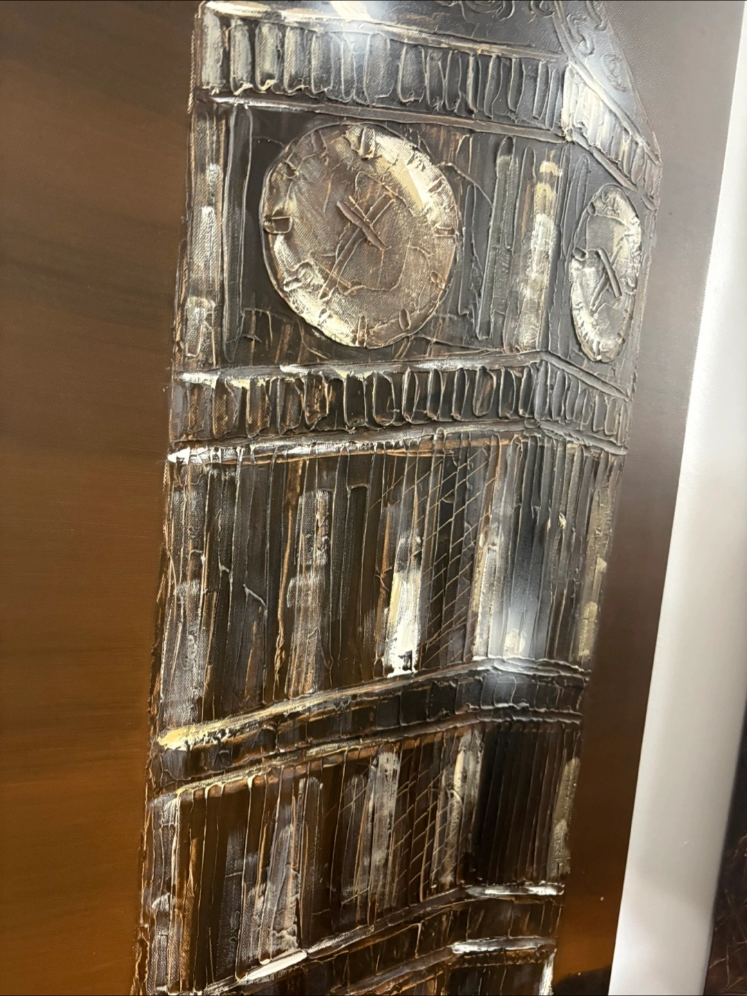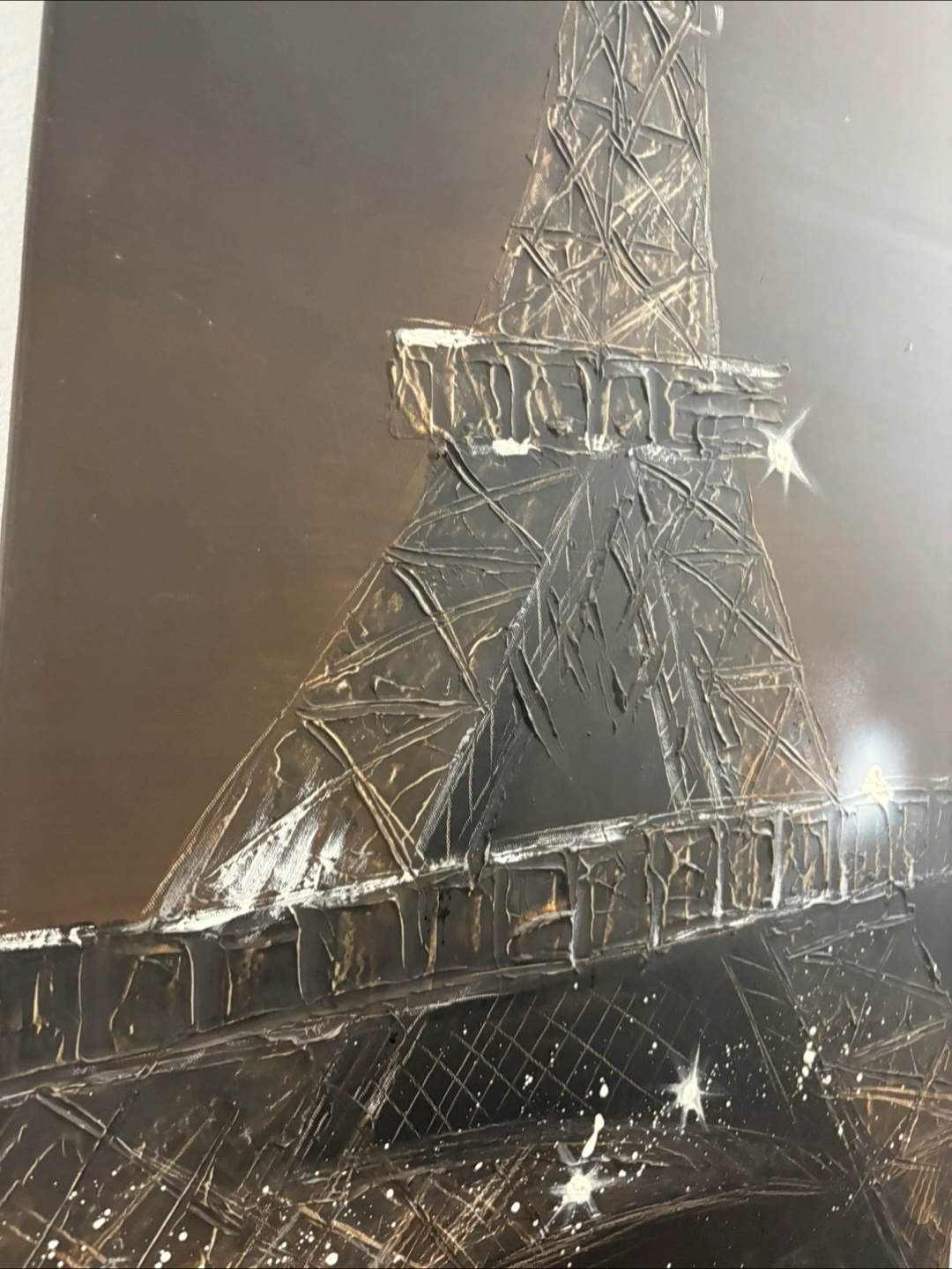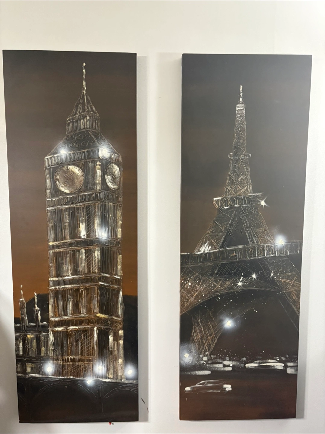 Two stunning Large original oil paintings. One depicts Big Ben at night, the other the Eiffel Tower. Dark background, textured paint. Modern art style. Great for adding a touch of European flair to your home.