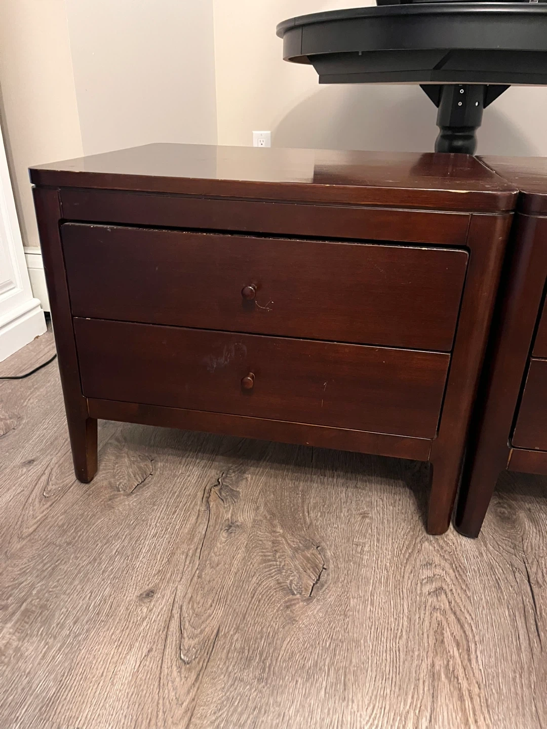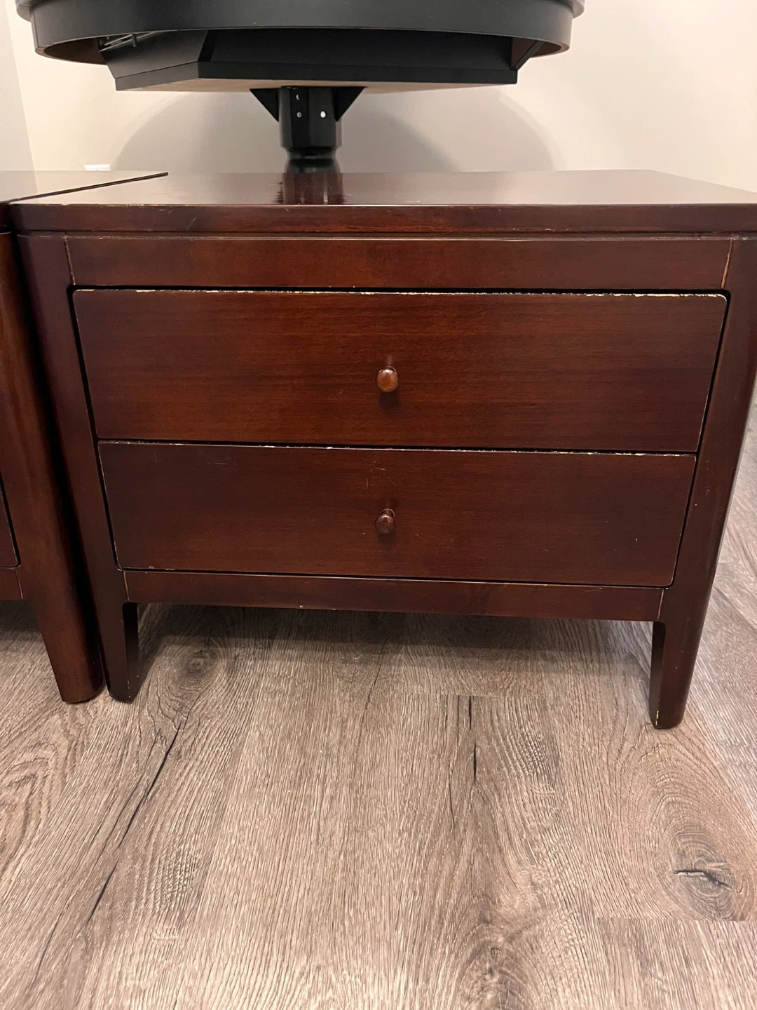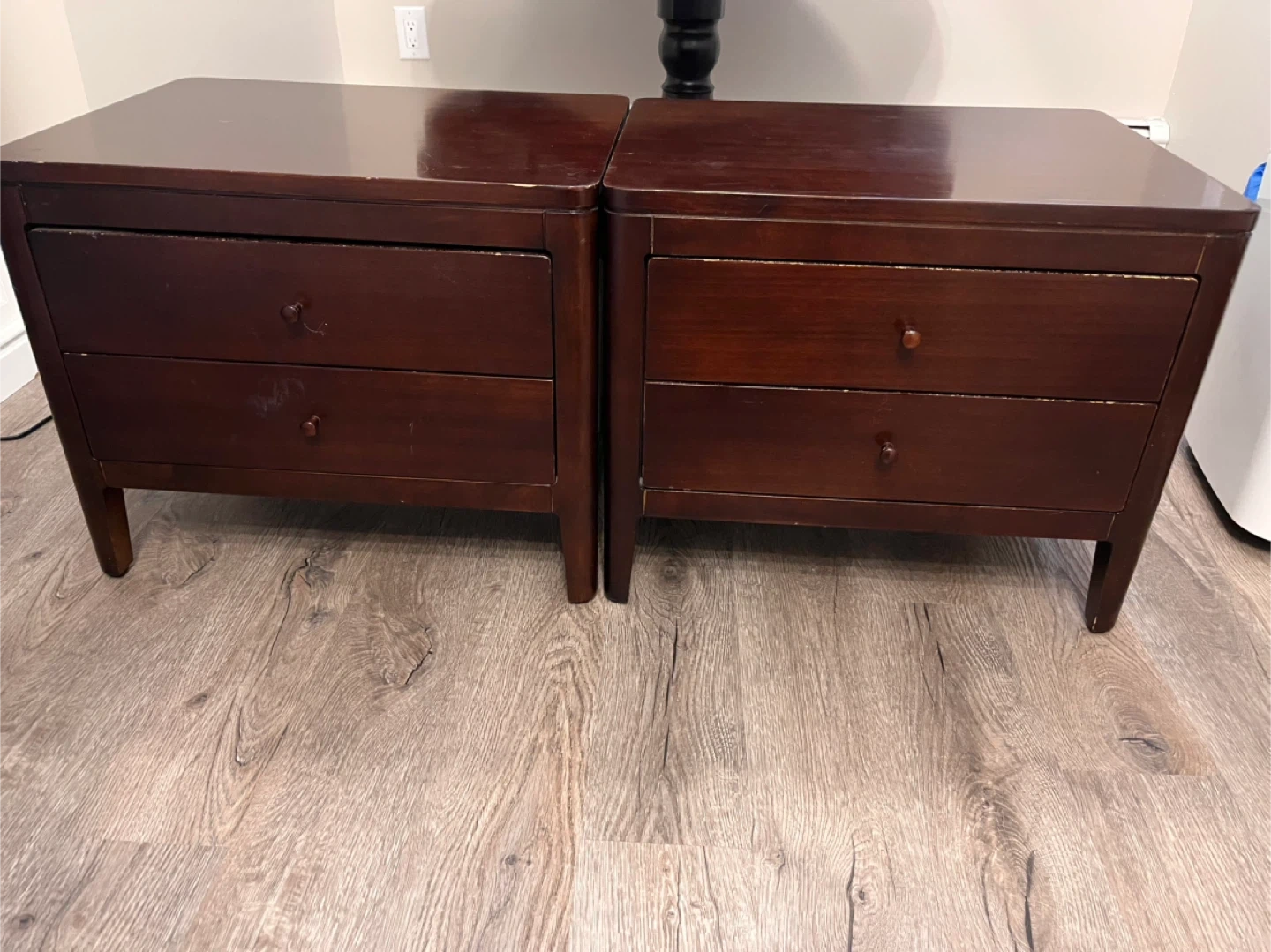 Selling a pair of classic mahogany nightstands, perfect for adding a touch of elegance to any bedroom. They each feature two drawers, providing ample storage space. Please note that these nightstands are used, which gives them a unique character and charm. The nightstands are solid and quite heavy. The drawers are in immaculate condition, as are the runners. * Material: Mahogany * Number of Drawers: 2 per nightstand * Condition: Used Looking for a touch of class? These nightstands might be just the ticket. And remember, if the ad is up, they're still available! Based on similar listings, a reasonable price for these nightstands in used condition is between $100 and $200. Given their condition, I've priced them to sell. Offers welcome.