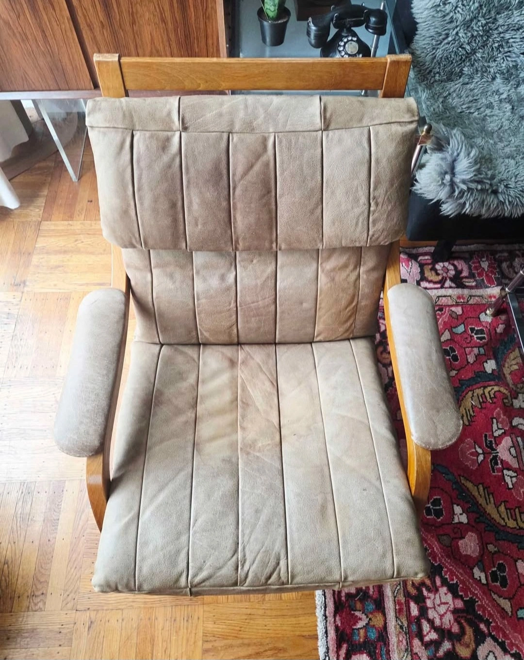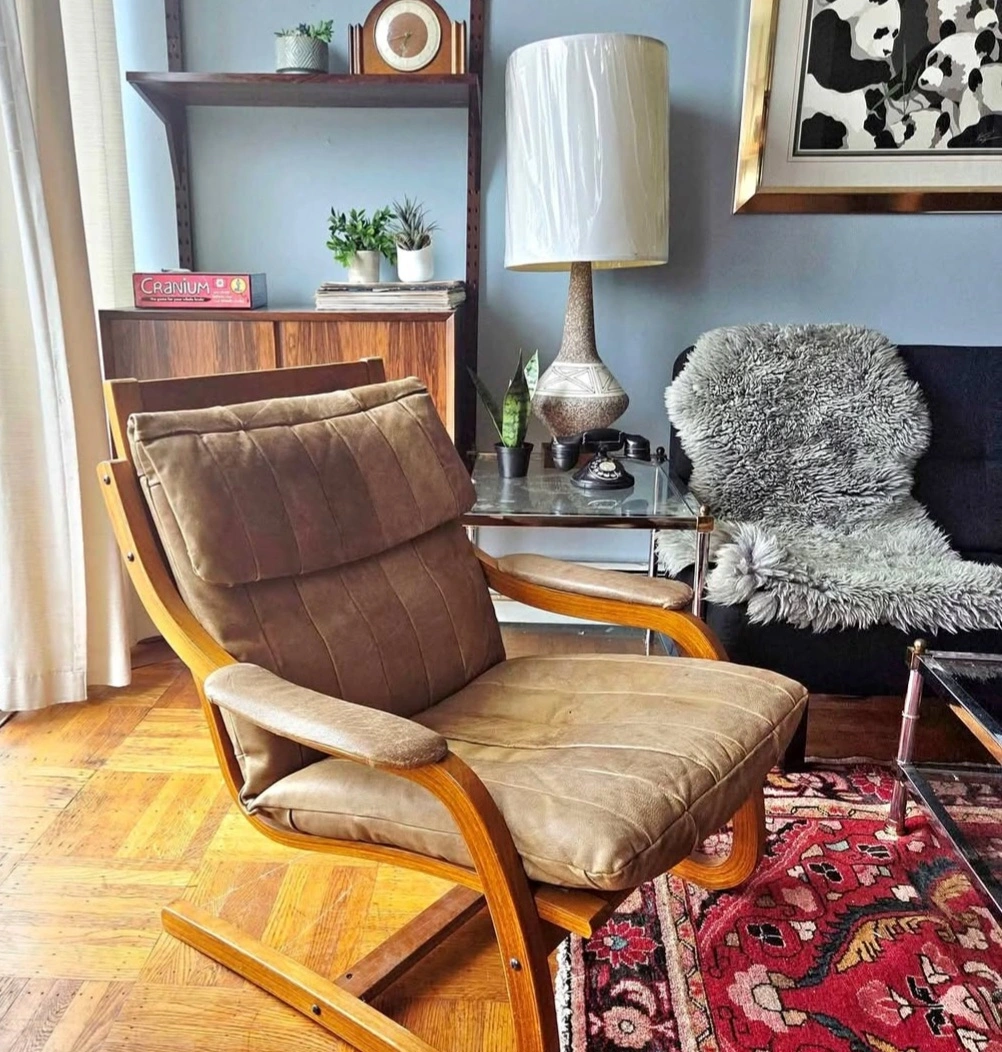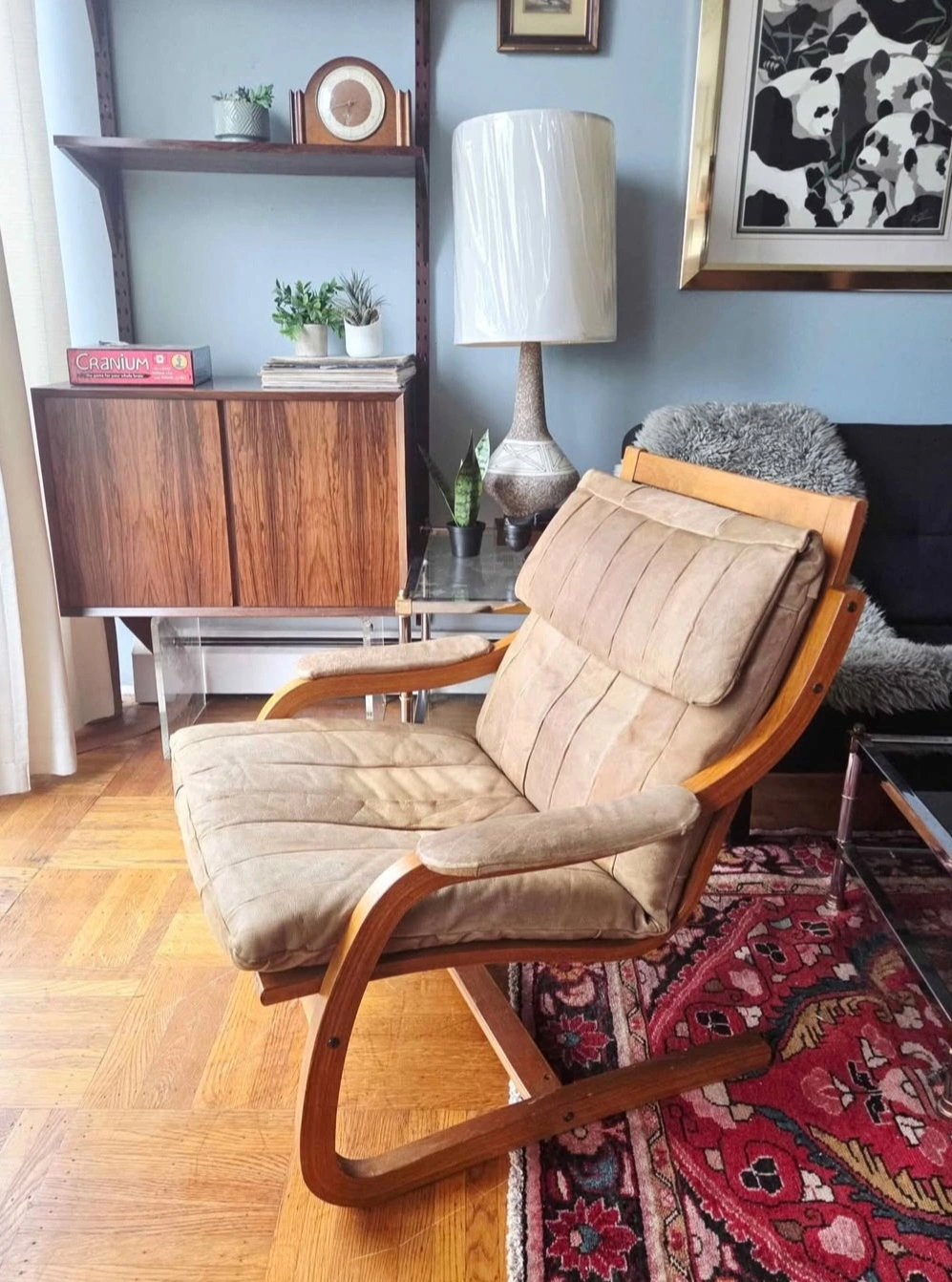 Pair Of MCM Bentwood Cantilever Accent Chairs (Price Per Chair) 2 available. Vintage Scandinavian bentwood cantilever armchair upholstered with beige genuine leather. The bentwood frame is in outstanding condition; the leather upholstery is showing discoloration but has not incurred any tares. Dimensions: 30.25"(w) × 30.25"(d) × 32.25"(h) The height of the seat is approximately 15". All in inches Pick up in downtown Vancouver or delivery may be arranged for a reasonable fee. Follow us on Instagram: https://www.instagram.com/west.end.trends Tags: retro vintage antique 1940s 1950s 1960s 1970s mcm mid century modern furniture Danish Denmark Sweden Scandinavian Norway Norwegian ekorness Herman Miller Eames falcon leather bentwood teak walnut beech lounge recliner cantilever accent cb2 eq3 west elm pottery barn crate and barrel structube article Scandinavian scandi modern Knoll westendtrends furniture vanvaluevintage