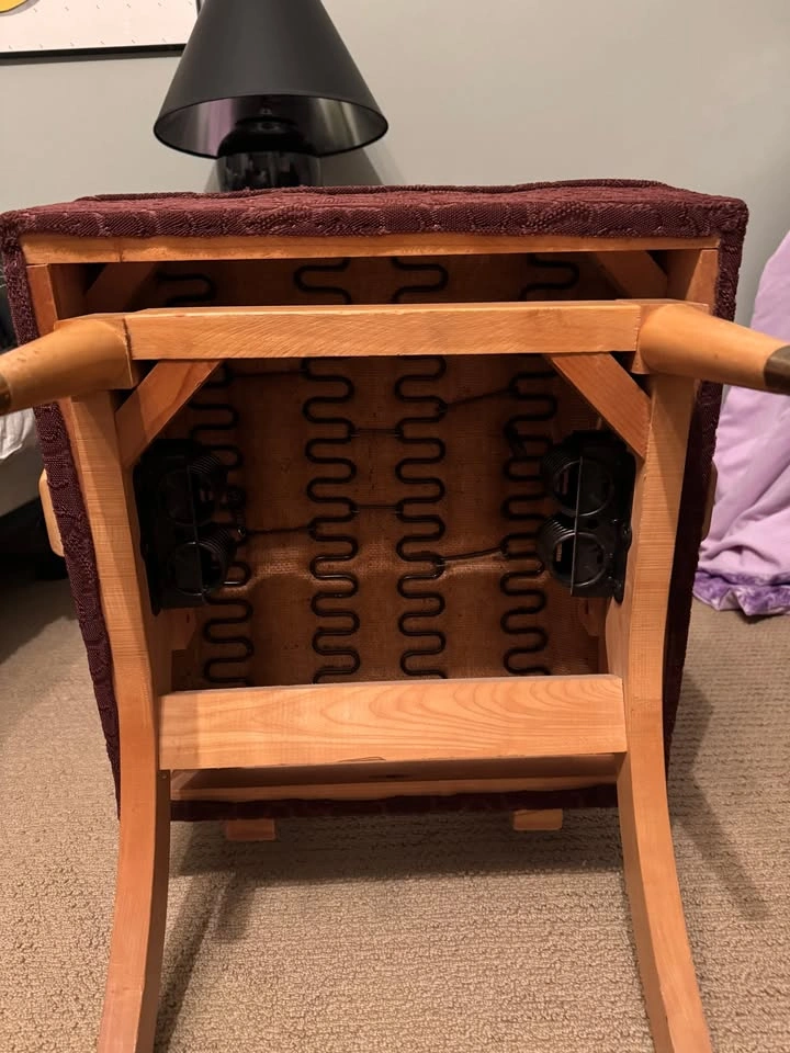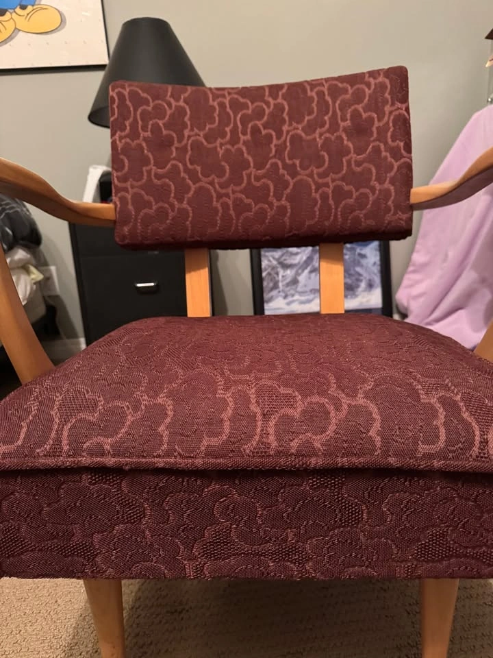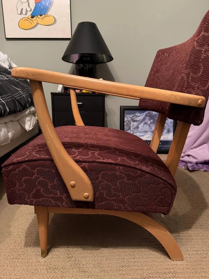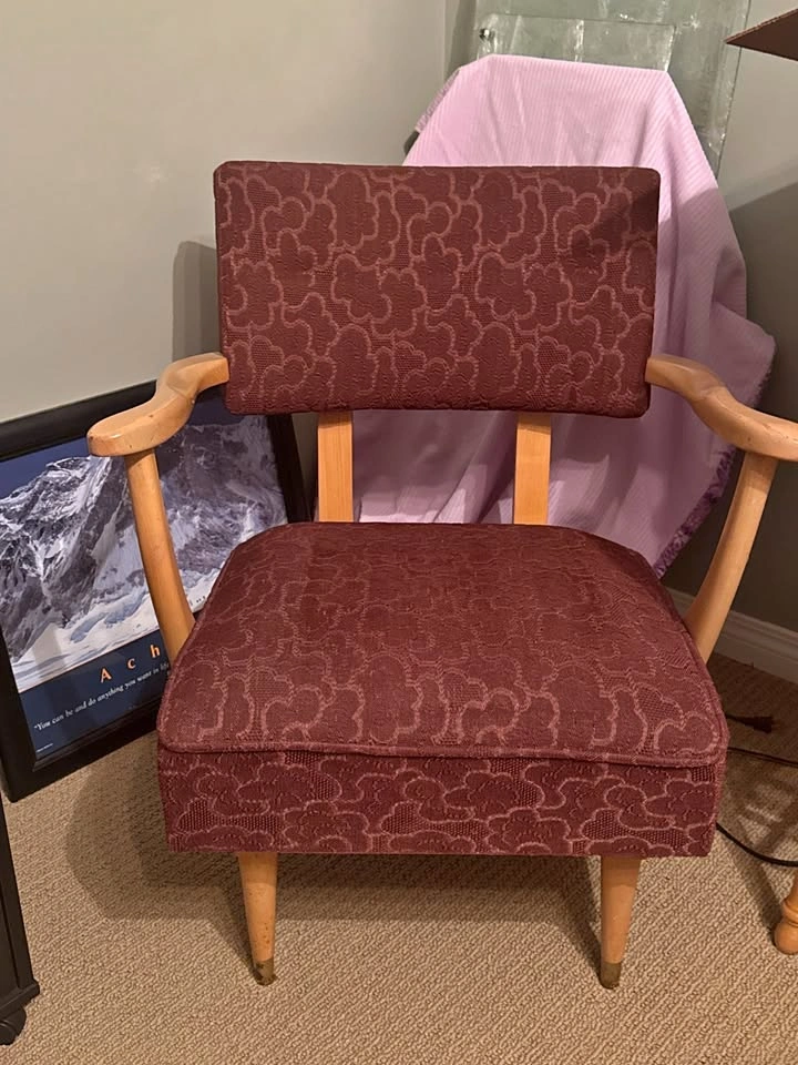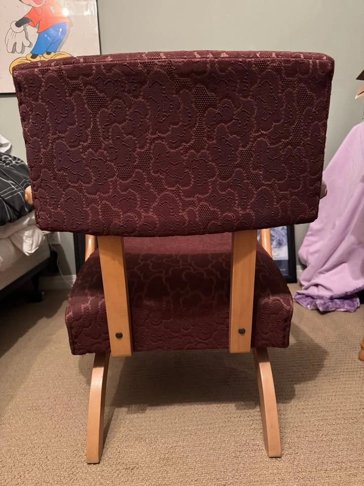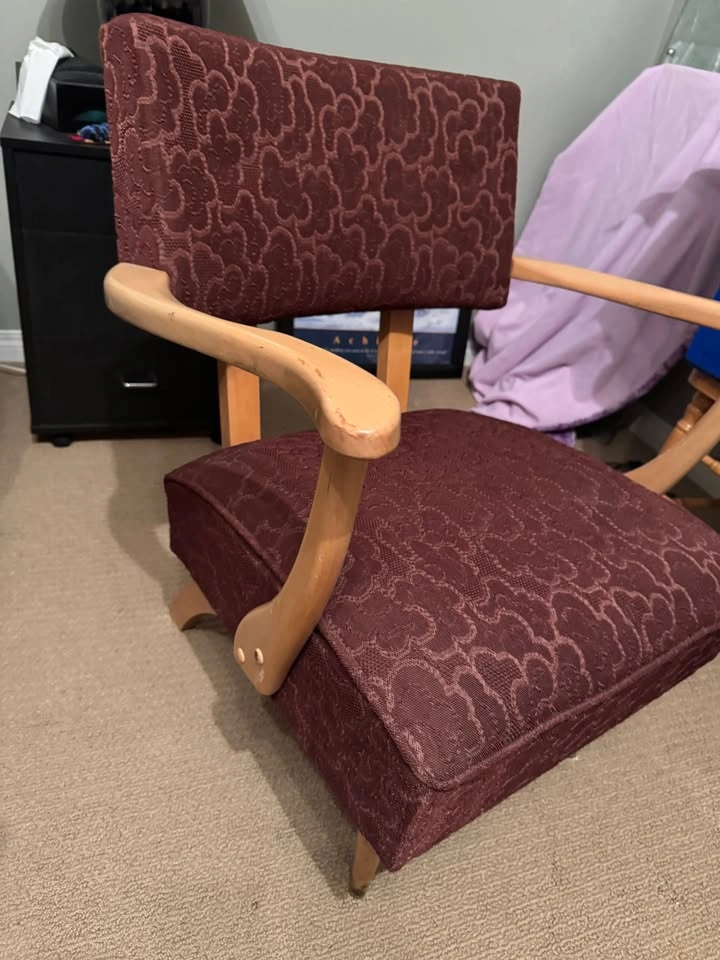 Beautiful matching pair of authentic mid-century modern accent rocking chairs from the 1950's/60's. * Solid blonde wood arms and tapered legs with original brass caps * Original deep burgundy textured patterned upholstery (never reupholstered) and wood in excellent condition * Comfortable, sturdy, and well cared for - these have been in the family since new Hard to find in matching pairs, especially with original fabric intact. Perfect for a mid-century retro room or statement chairs. Approx. Dimensions: Overall: 26"w x 32"h x 28"d Seat: 21" w x 28"d x 5.5"h Asking $900 for the pair. Note: Open to reasonable offers; please NO lowballs. (these are true vintage originals, one family-owned). If the ad is up, they are still available. Pickup only (in Wabamun, Alberta).