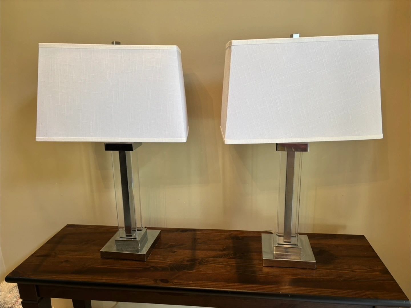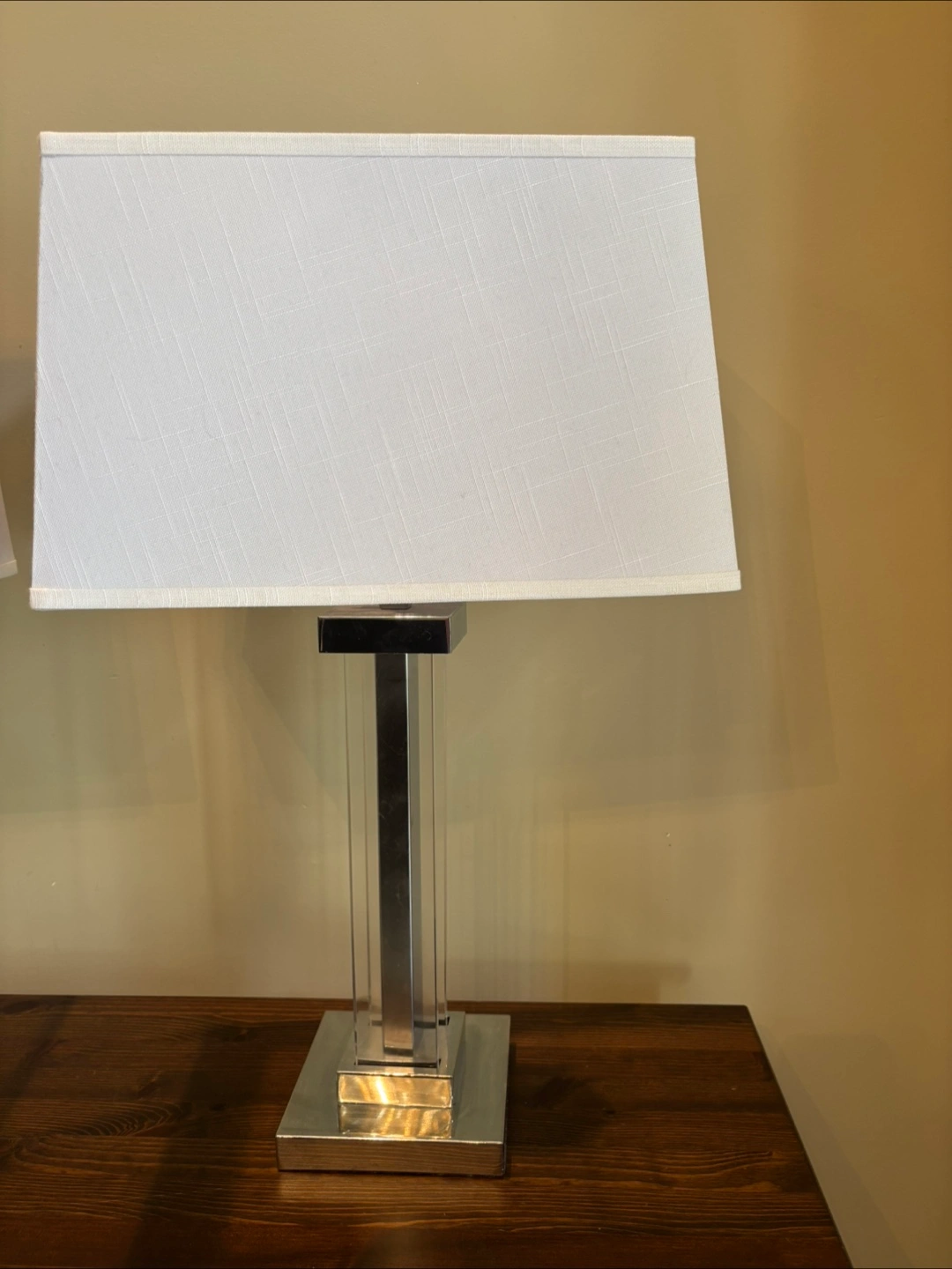 Elegant pair of table lamps. Chrome-finished bases. Clear crystal accents. White rectangular shades. Perfect for a living room or bedroom.