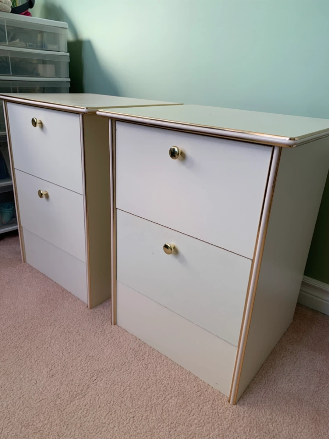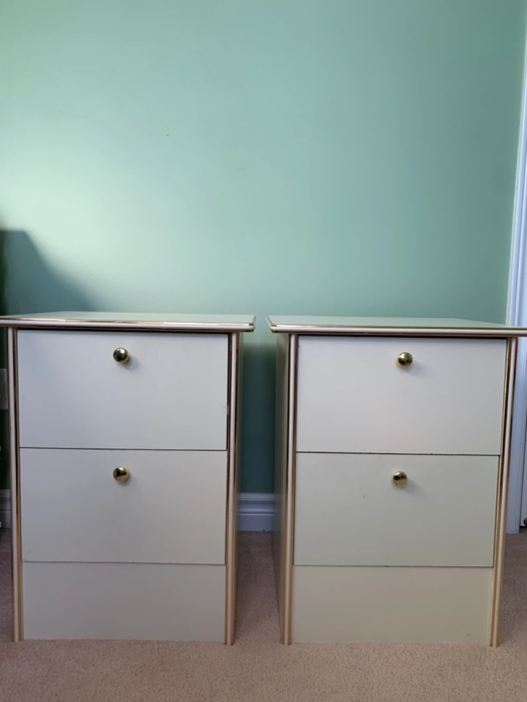Selling a set of two cream-coloured nightstands with two drawers and gold coloured knobs and trim. They're in good shape and ready for a new home. The back is fully intact. $20 for both sold as a pair Pick up in Markham