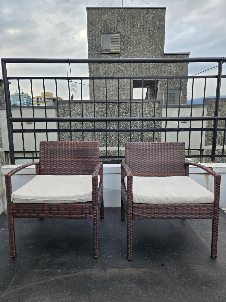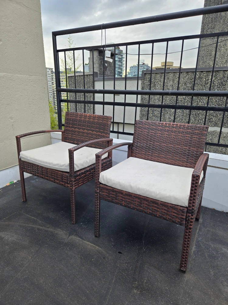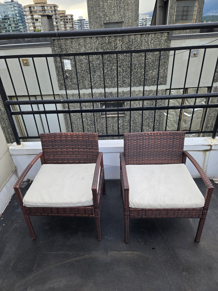 Pair Of Patio Chairs Arm Chairs With Cushions (Price Per Chair) Delivery Available. Pick up in downtown Vancouver or delivery may be arranged for a reasonable fee. Tags: retro vintage antique cast iron wrought iron woven wicker cane rattan hallway table entryway table tv bench boho bohemian black gold copper brass bronze cb2 eq3 west elm pottery barn crate and barrel structube article urban barn moes Scandesign rove concept living room dining room plant stand patio arm chairs westendtrends furniture vanvaluevintage