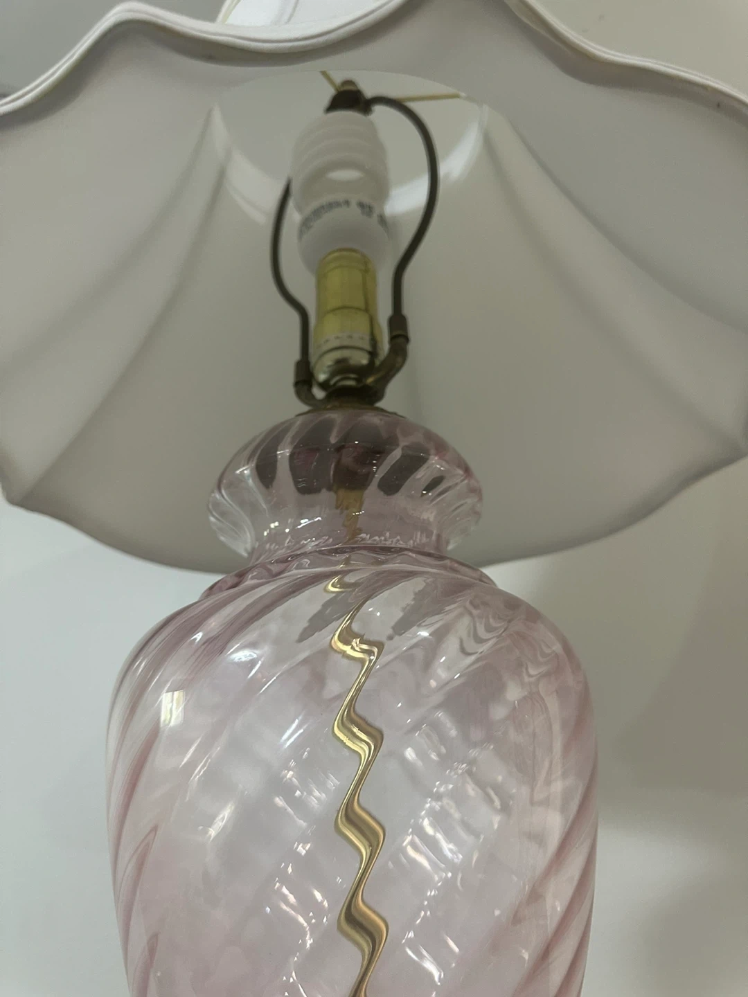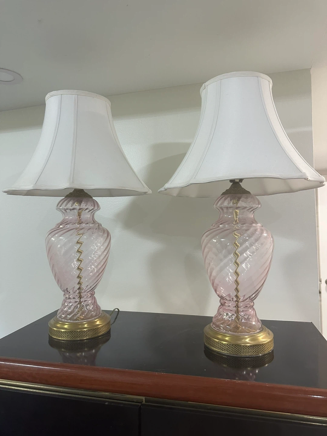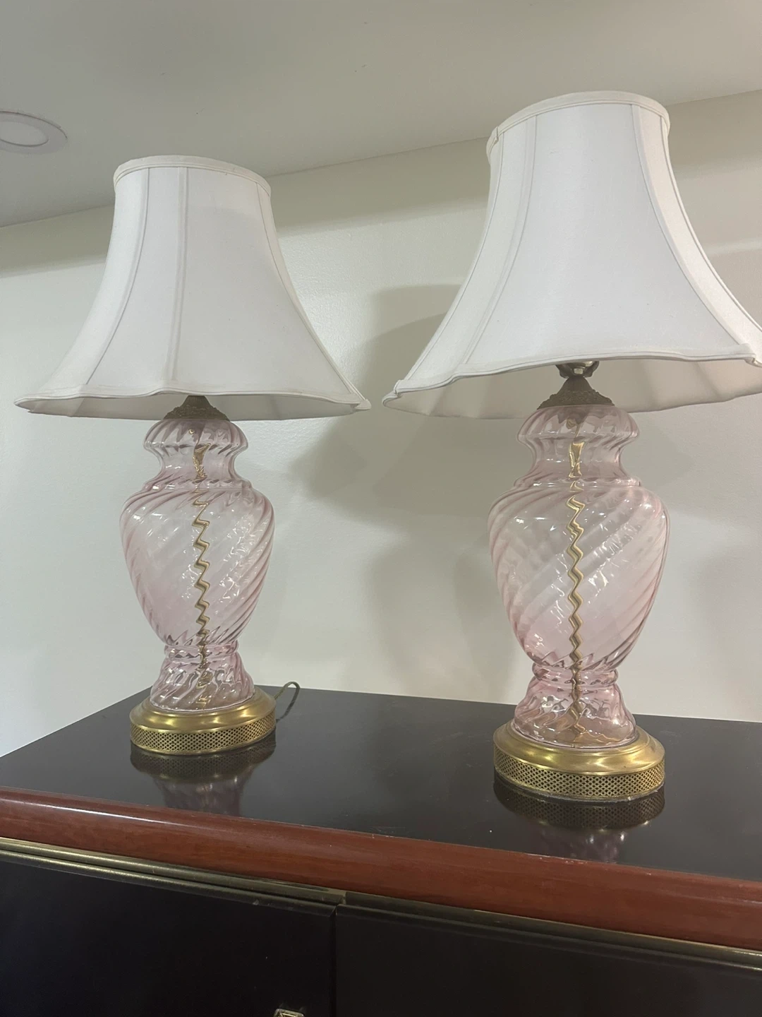Selling a perfectly working pair of elegant pink glass lamps with a beautiful swirl design and gold accents. They would be a lovely addition to any room!