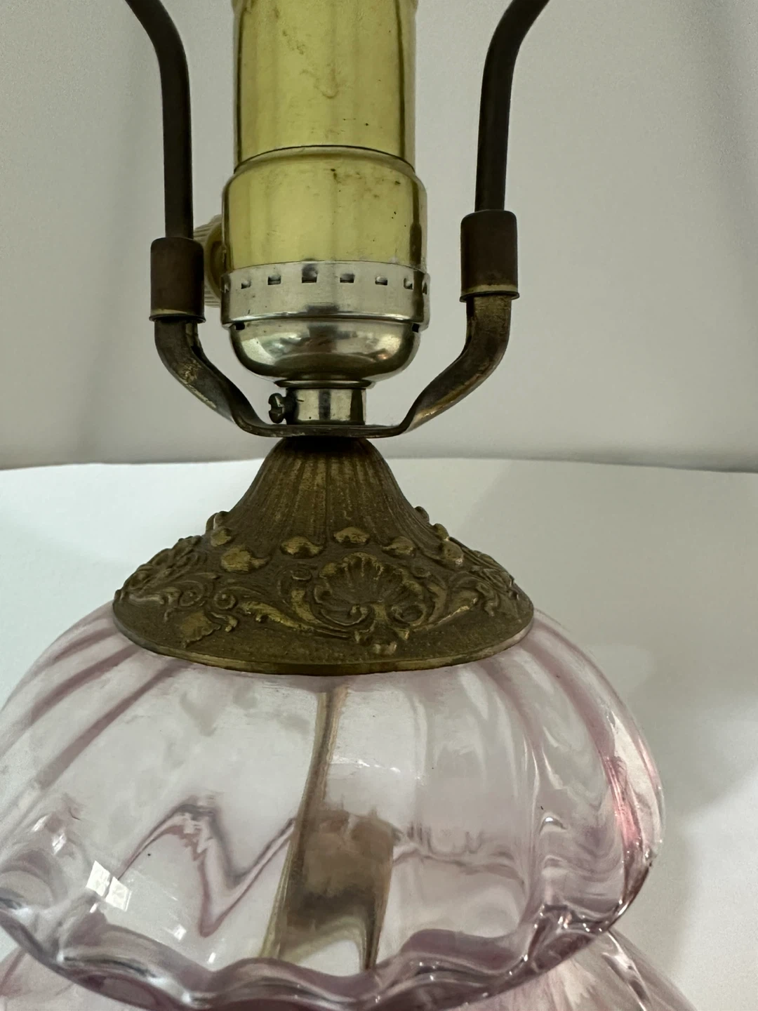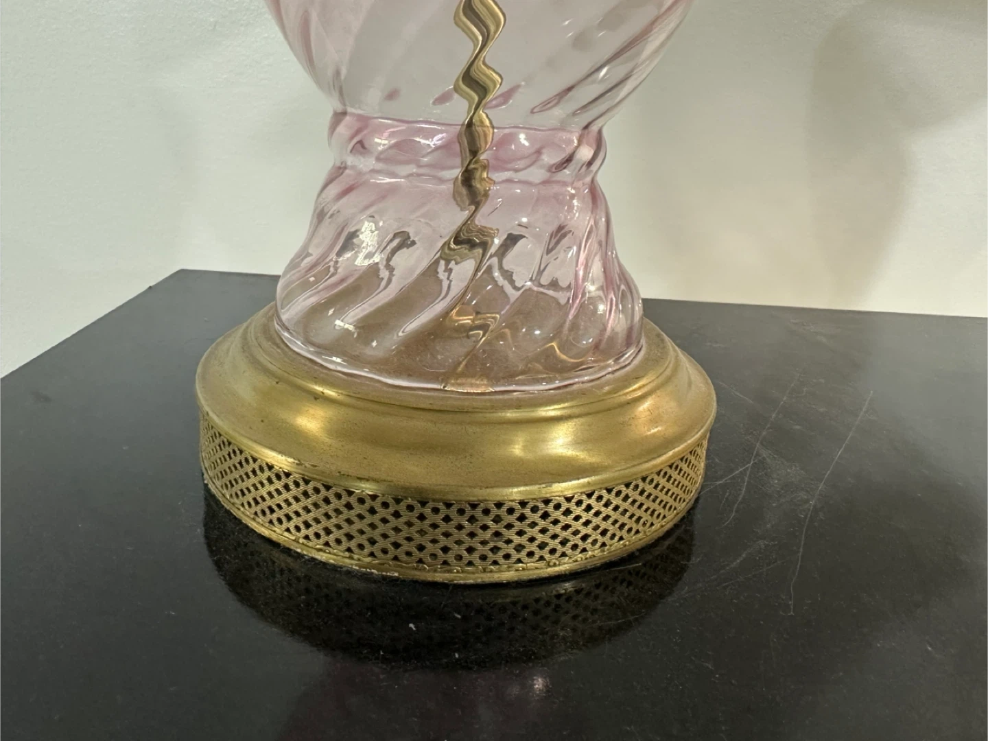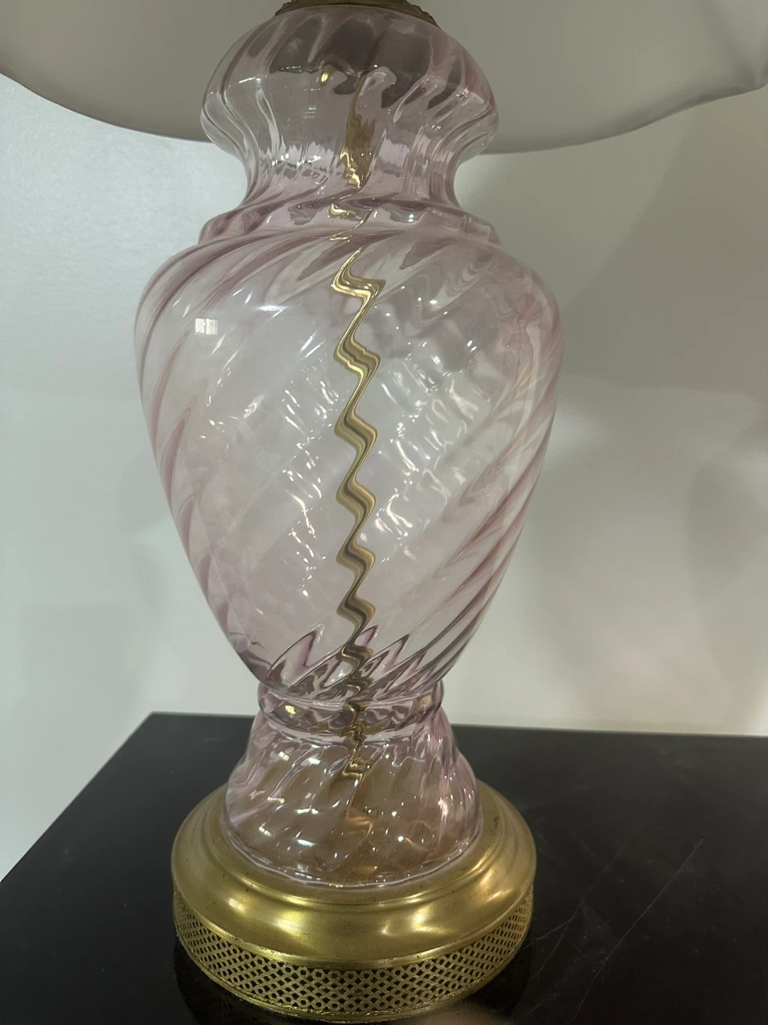 Selling a perfectly working pair of elegant pink glass lamps with a beautiful swirl design and gold accents. They would be a lovely addition to any room!