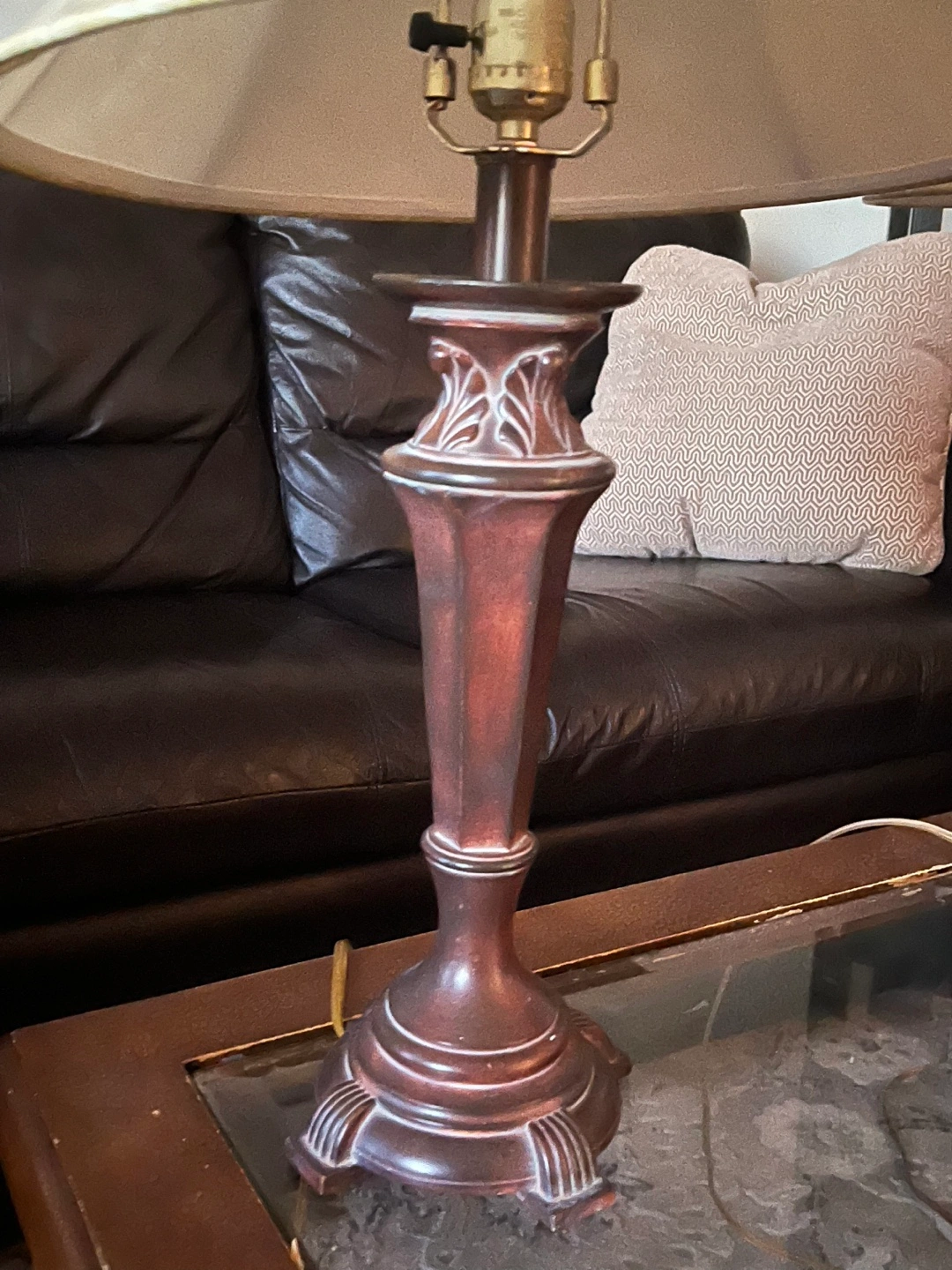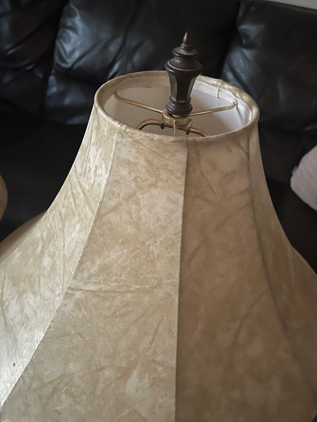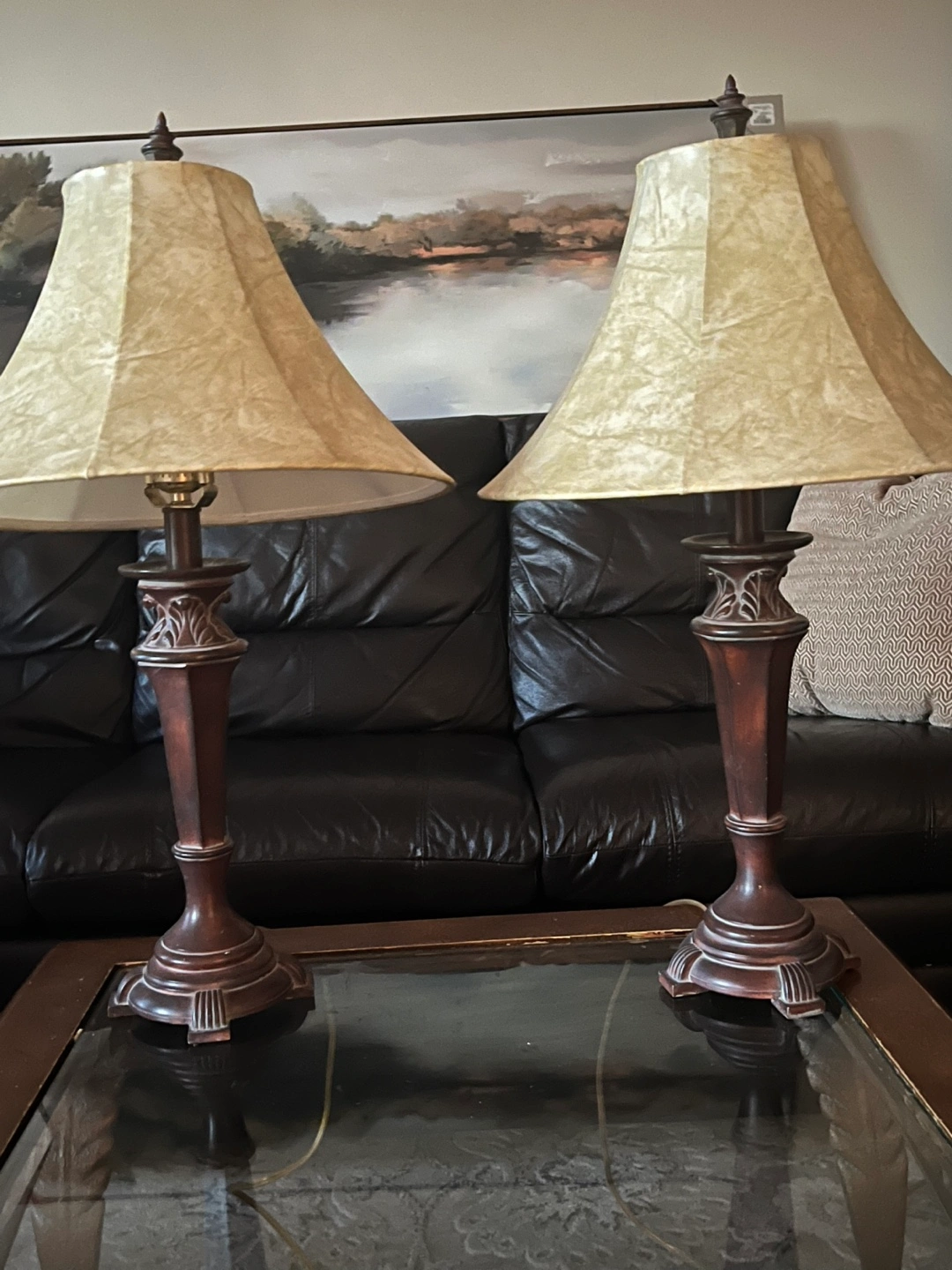 Selling a pair of table lamps. They feature a classic design with a dark wood-toned base and a textured, light-coloured shade (not fabric) Easy to clean. They'd be a nice addition to any living room or bedroom