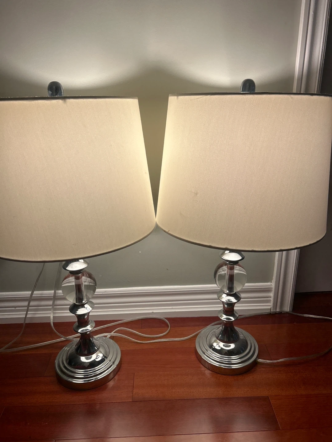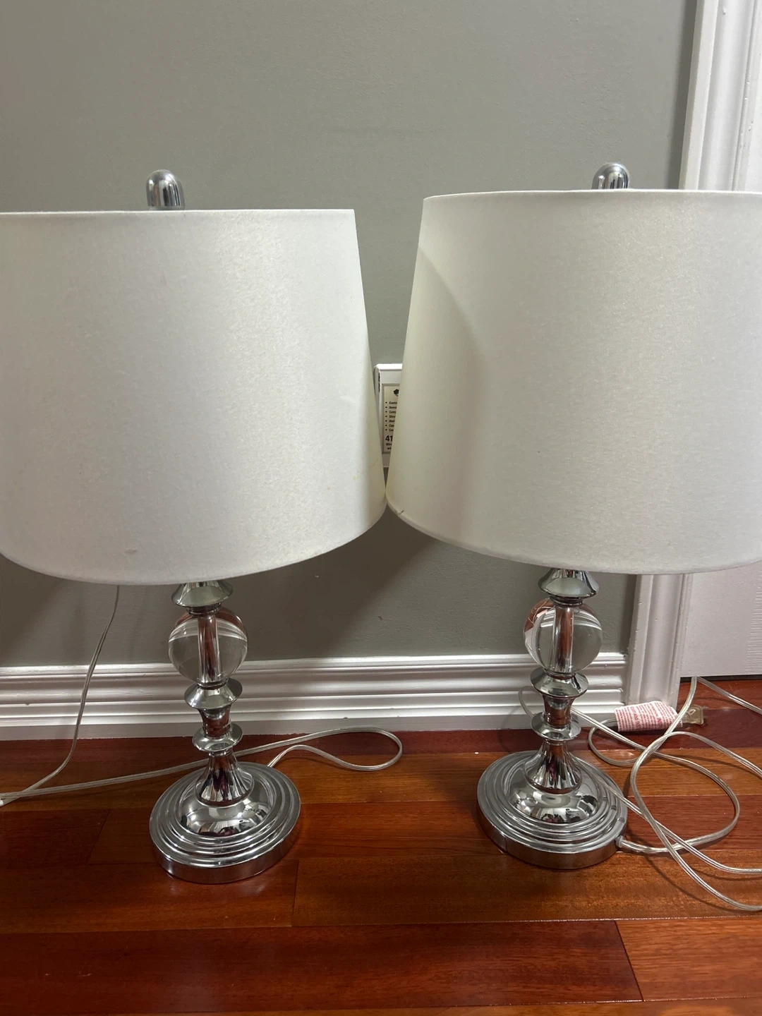Selling a pair of table lamps! They feature a chrome base with crystal-like accents and simple white lampshades. These lamps would look great in any room and provide a soft, ambient light