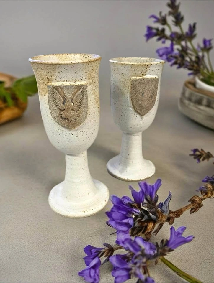 Enhance your dining experience with this pair of elegant natural ceramic goblets. Featuring a distinctive crest design. Very Hygge. 7” and 6.5” respectively.