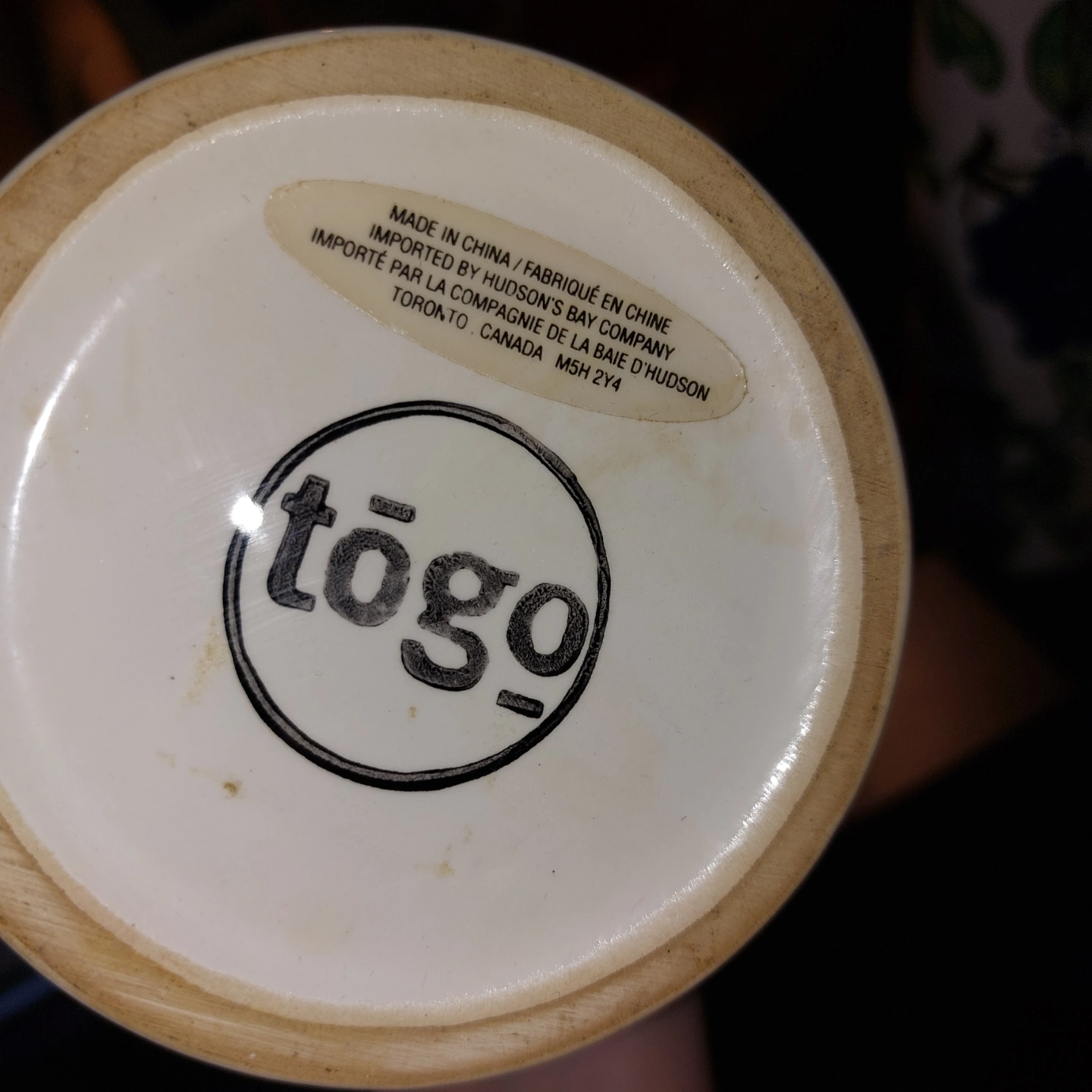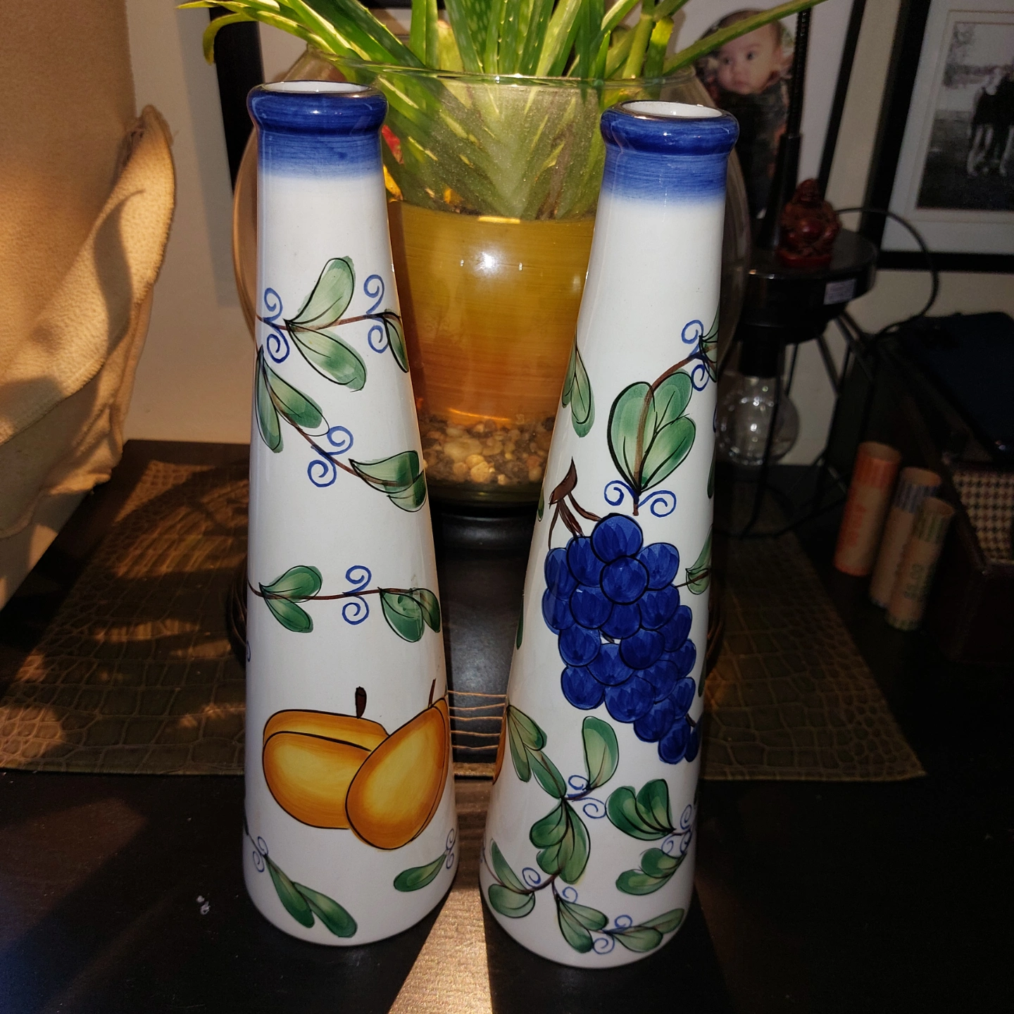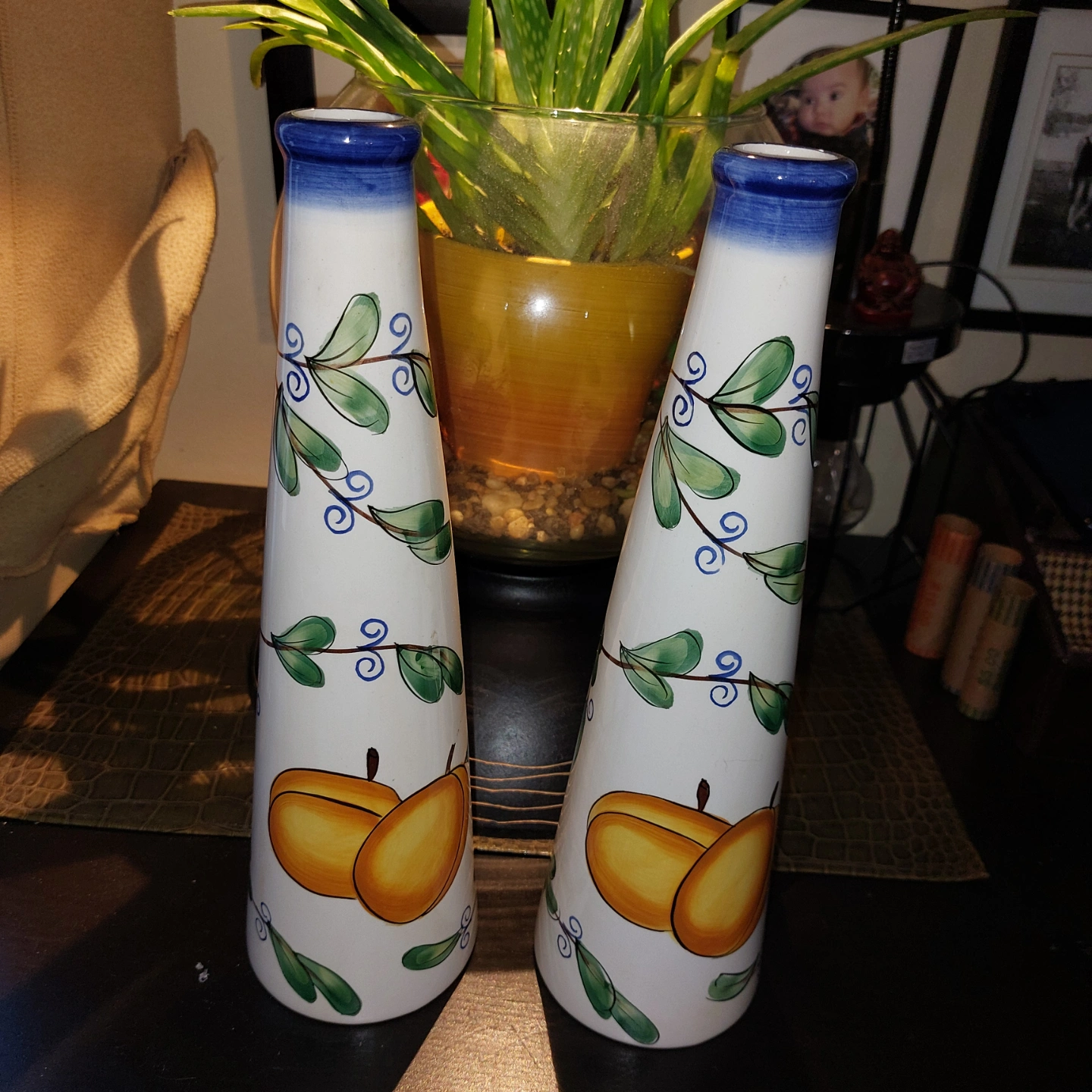PU: CARLTON/SHERBOURNE AREA Set of two vintage TOGO decorative ceramic vases. Tall and slender design. Feature hand-painted fruit and leaf motifs. Blue and green accents. Excellent Condition Imported by Hudson's Bay Company. $20 each
