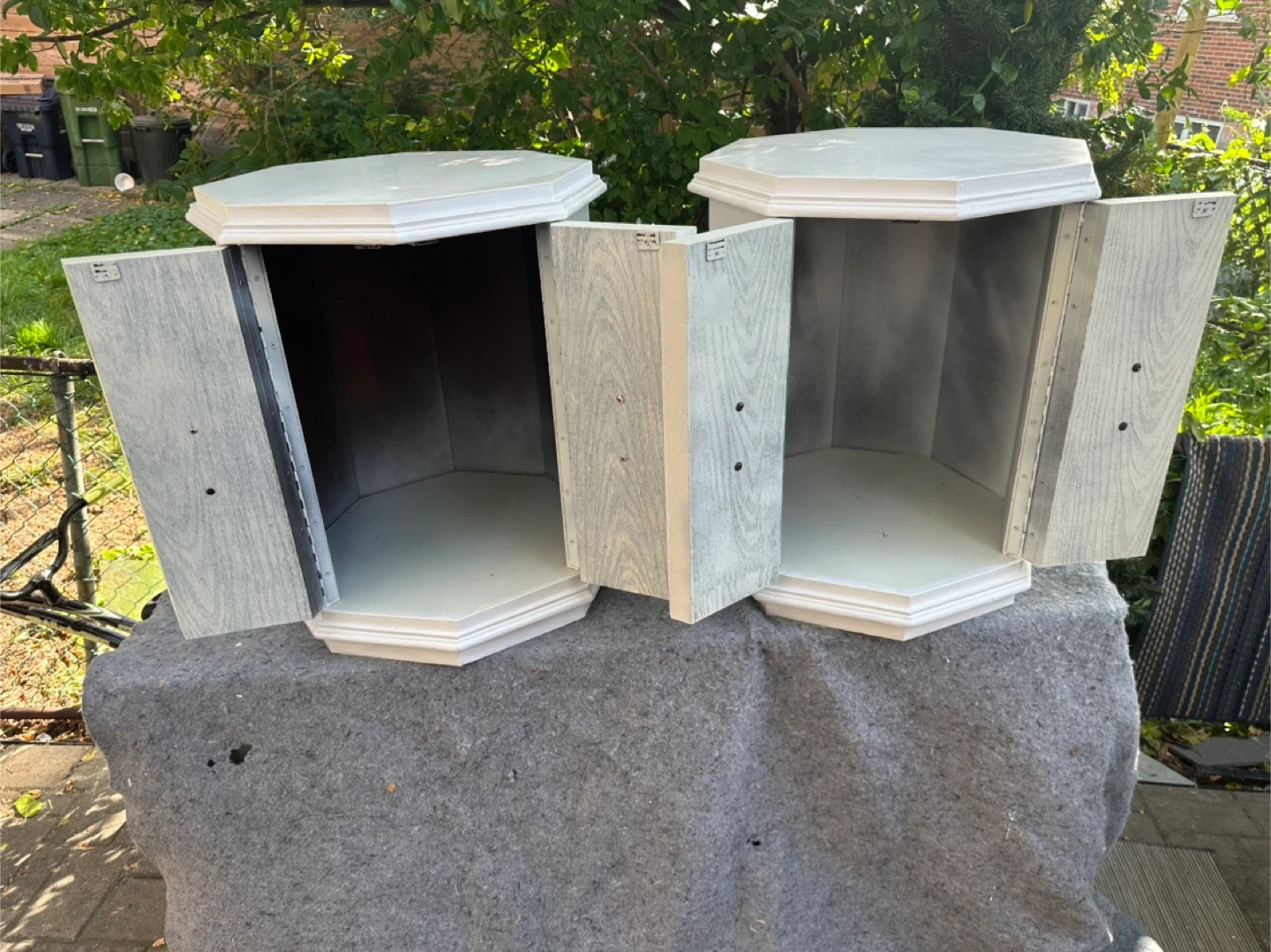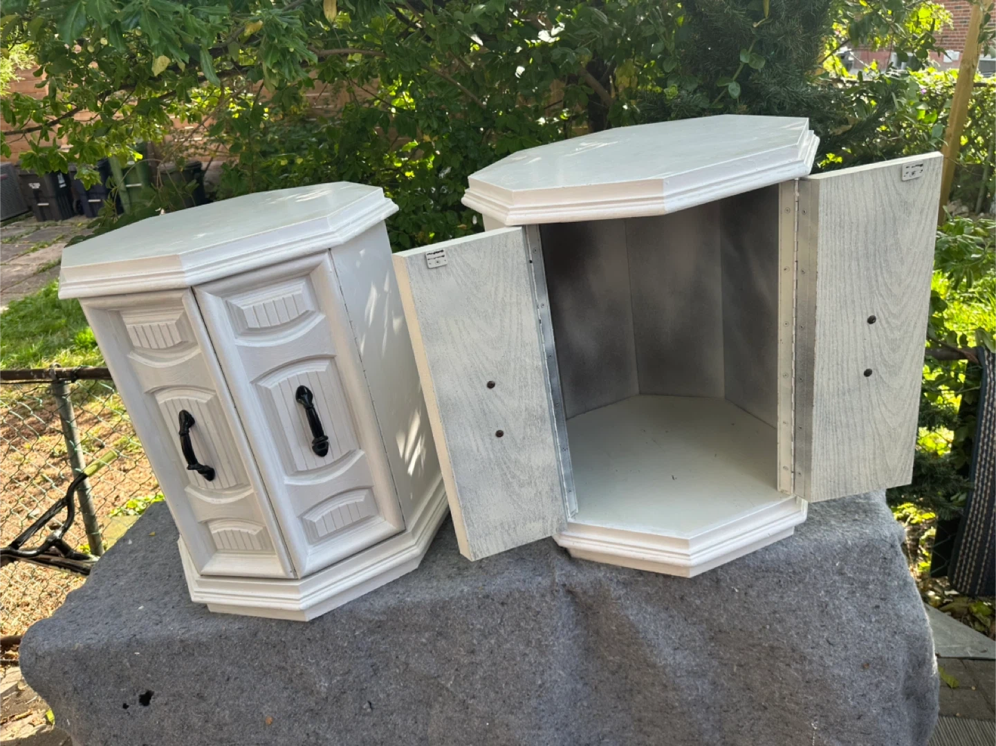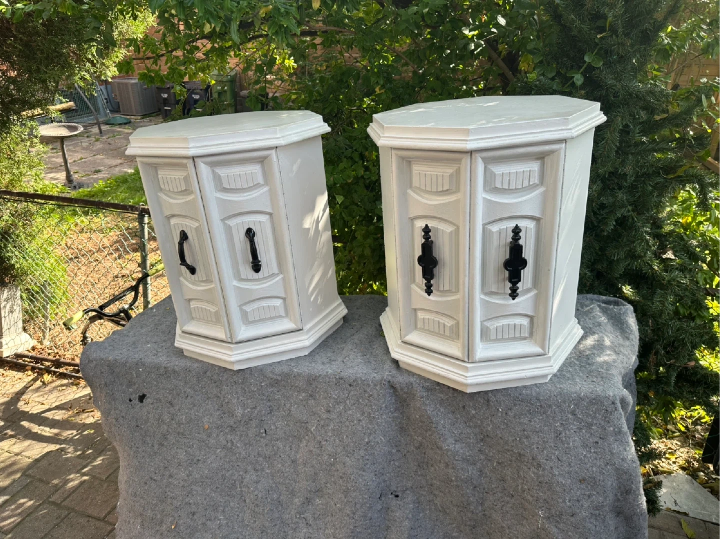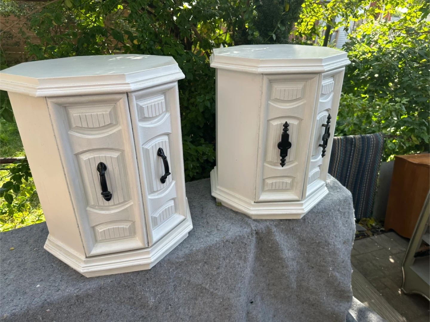 Selling a pair of charming white octagon-shaped side tables. They feature a cabinet design with doors and black handles. Perfect for adding a touch of elegance to any room! Diameter 20 inches Height 23 inches $40 each or $65 a pair