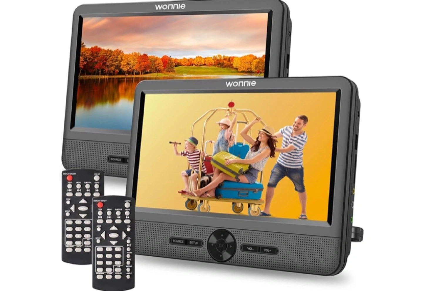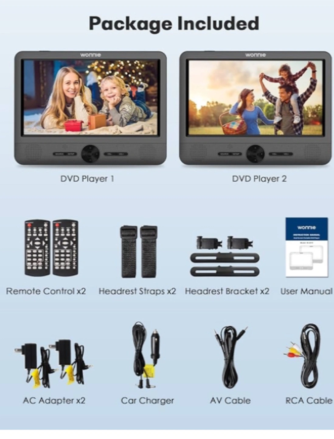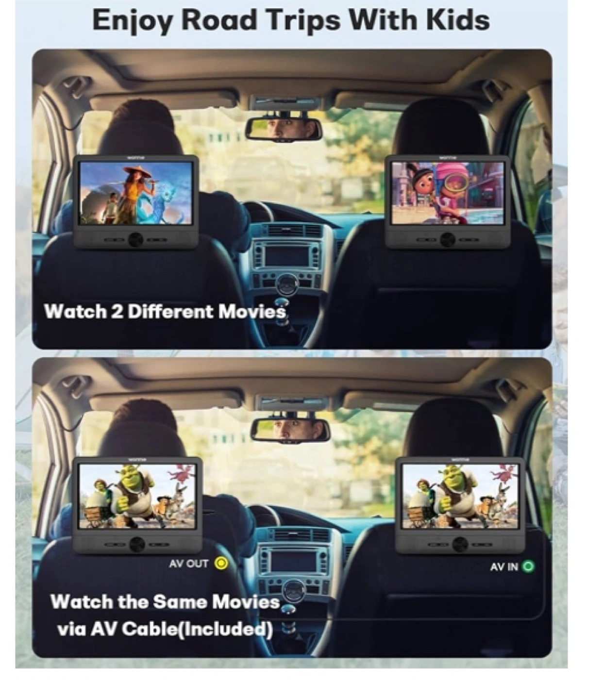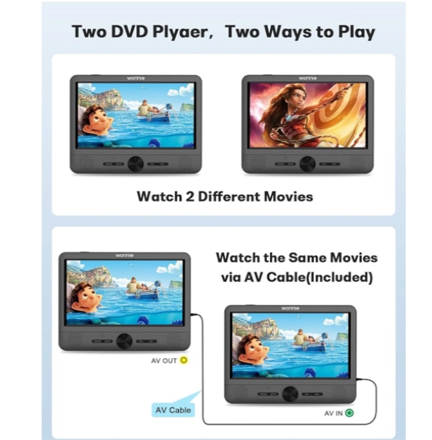 WONNIE 10" Car DVD Players Portable DVD Player Dual Screen Play Two Different or The Same Movie with 2 Headrest Mount, 5 Hours Rechargeable Battery, Last Memory, AV Out&in, Support USB/SD/Sync TV
