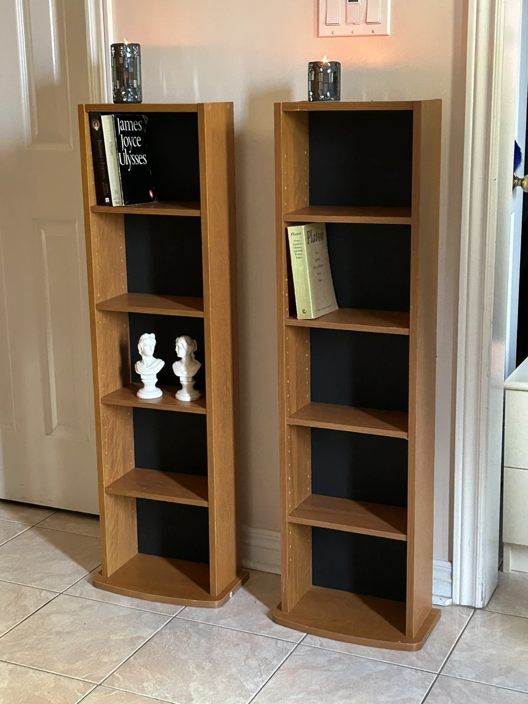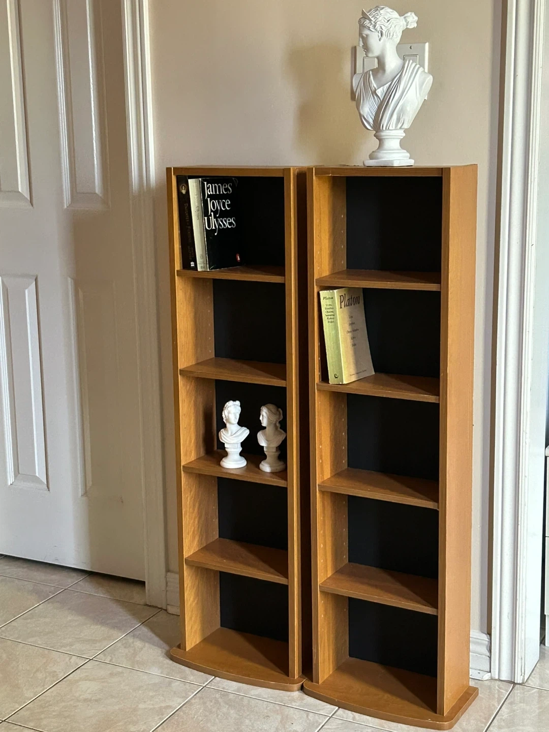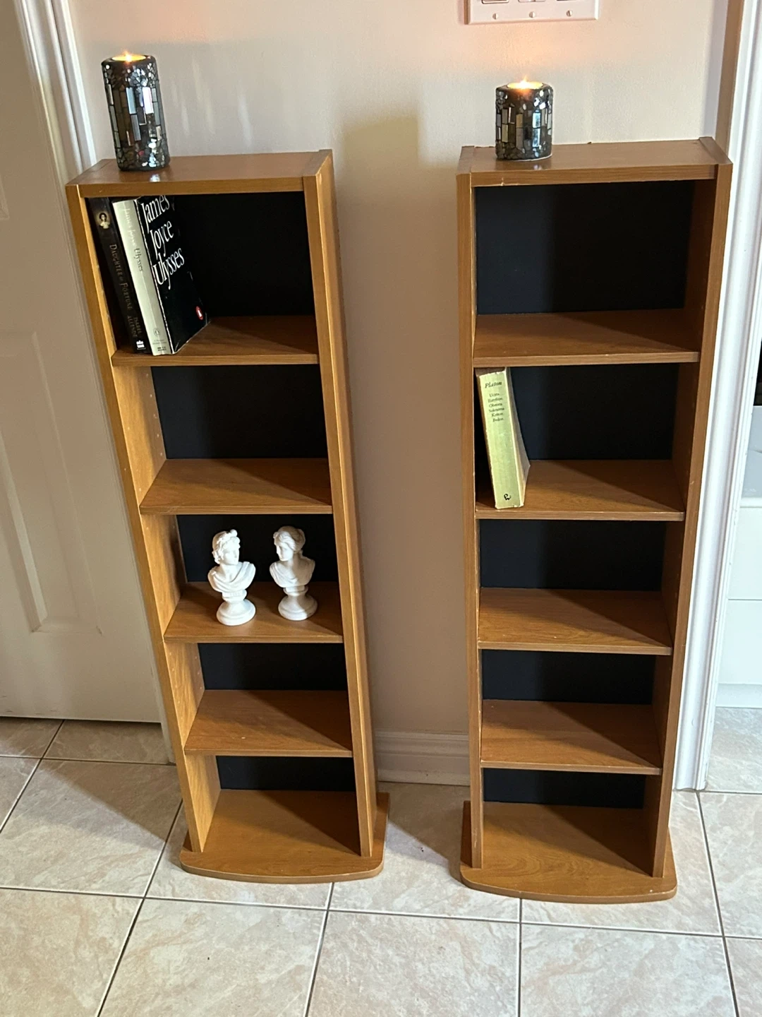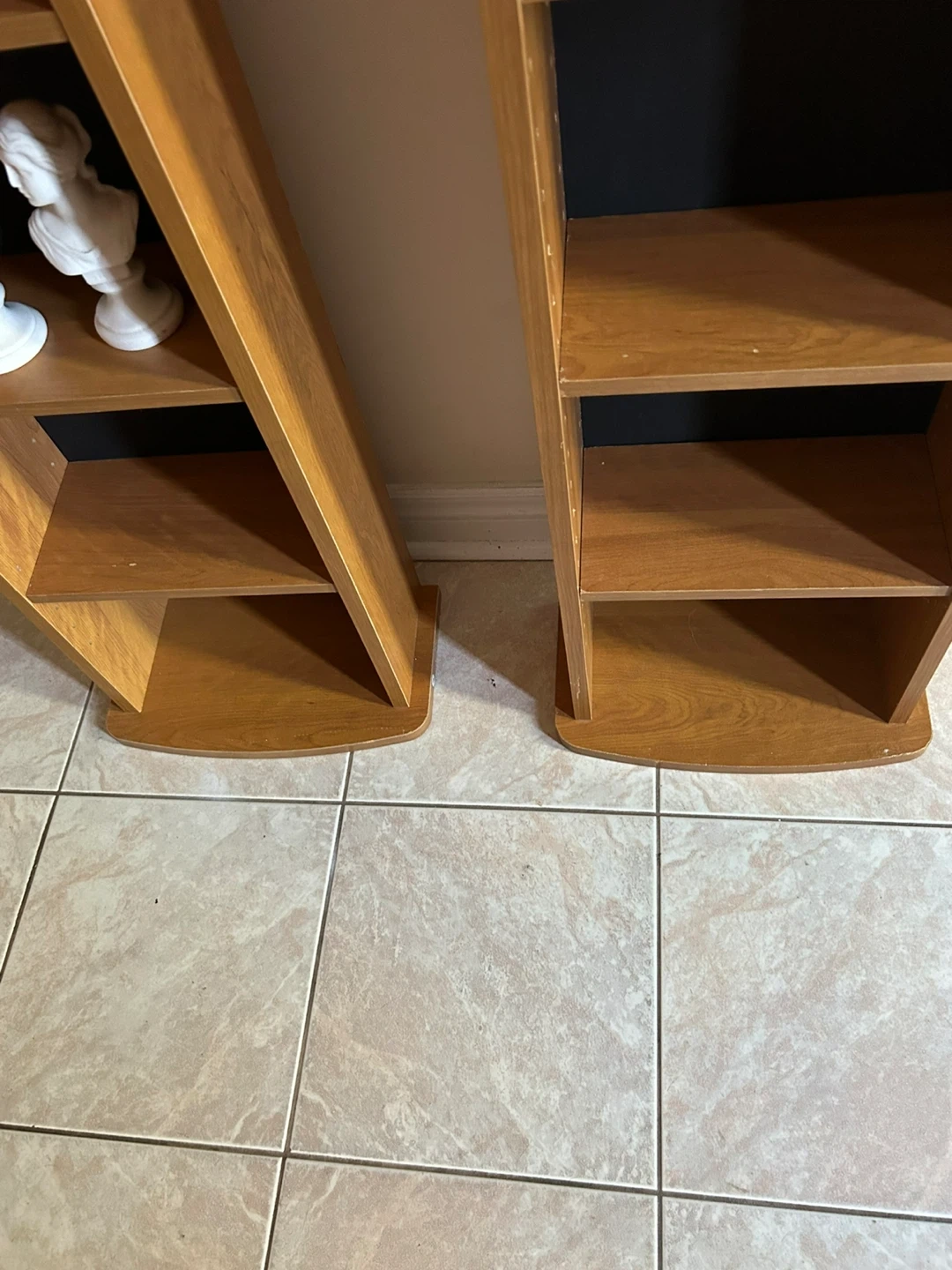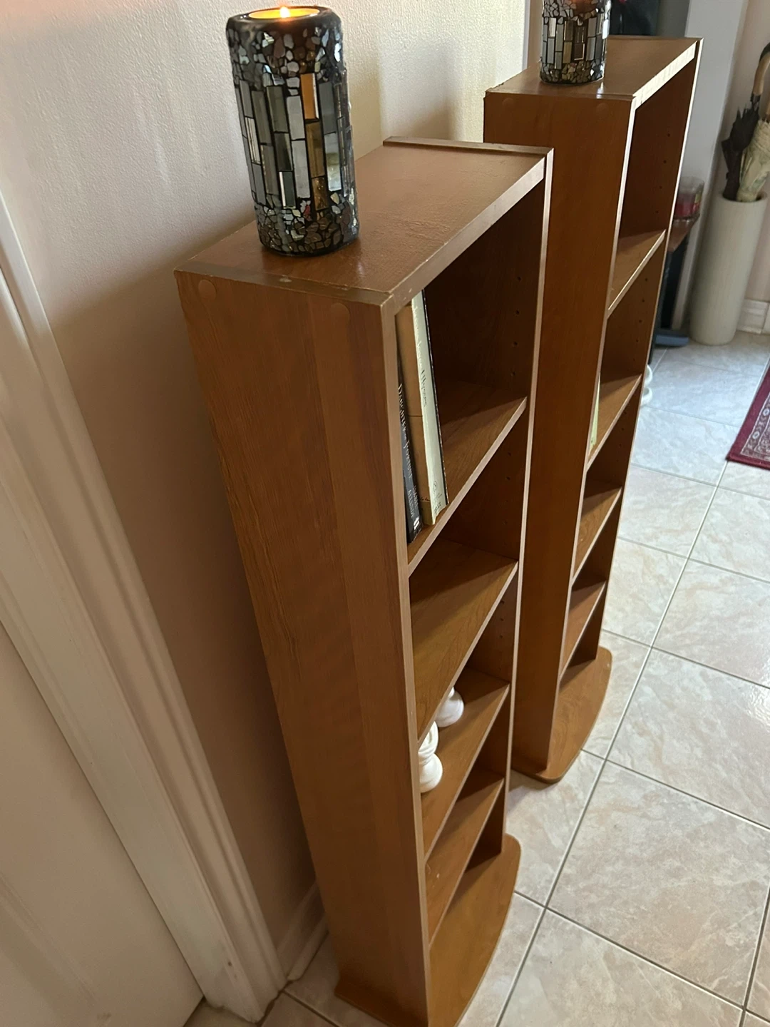 Selling a pair of wooden bookshelves. They're in good condition and ready for a new home! Perfect for displaying your favourite books or decorative items