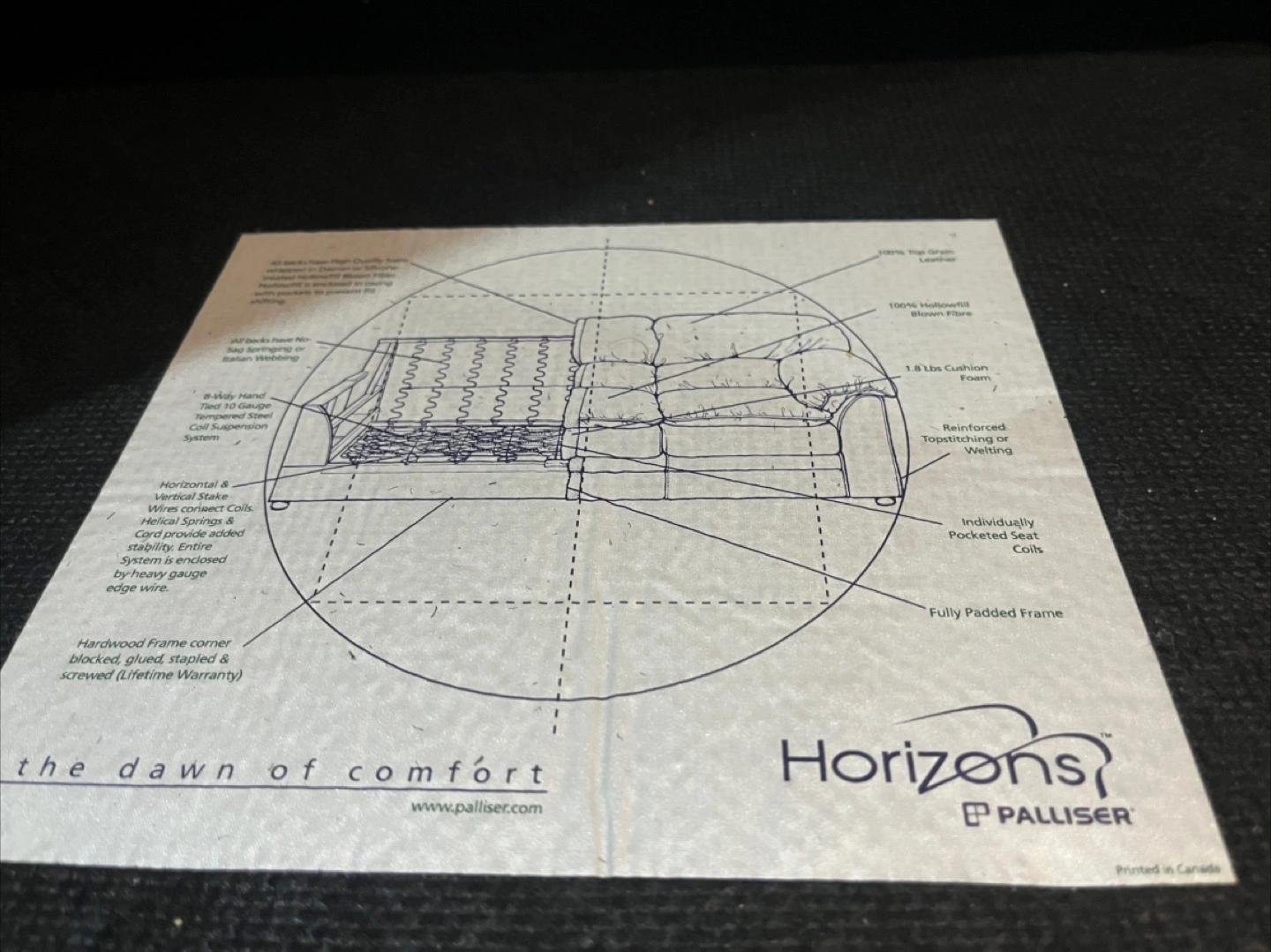 Looking to sell a Palliser Horizons sofa. It's a comfy piece with a fully padded frame and individually pocketed seat coils. The frame is hardwood and blocked, glued, stapled & screwed for lifetime warranty. The top grain leather and 100% Hollowfill blown fibre cushions make it extra cozy!