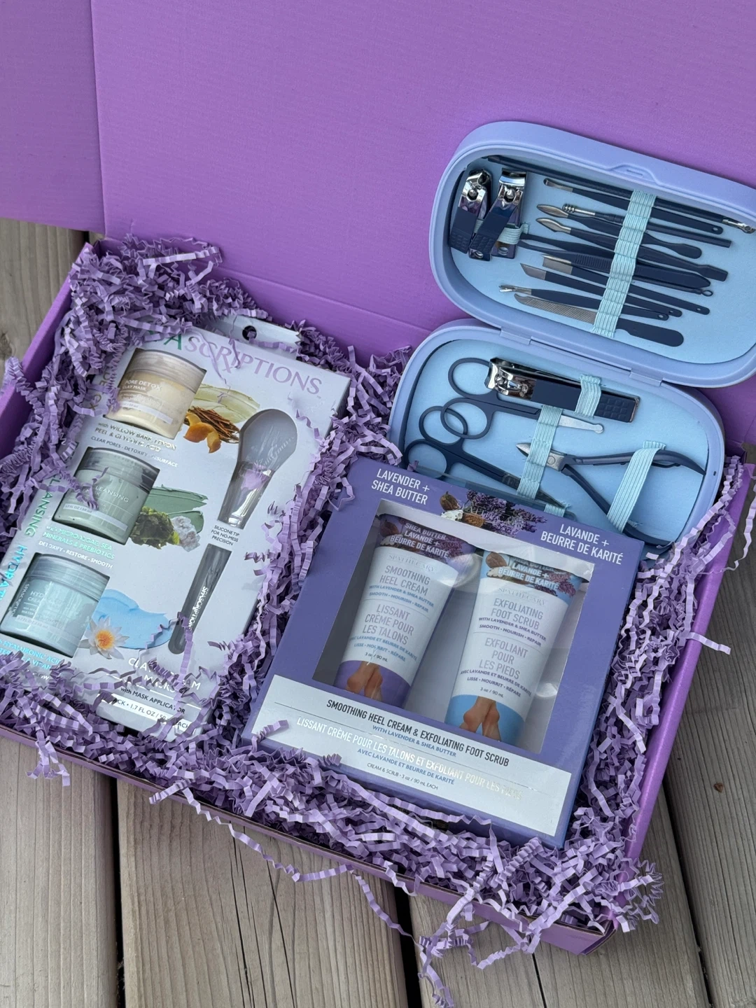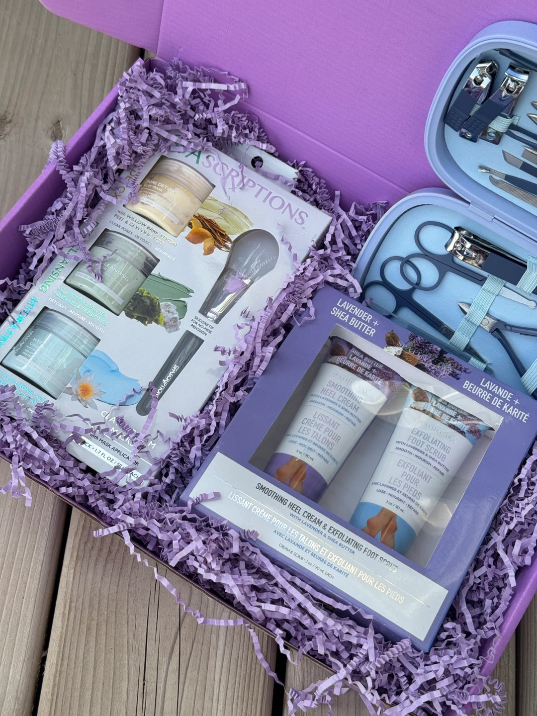 I'm selling a brand new Asptotions beauty gift set! It includes a smoothing heel cream, exfoliating foot scrub, a nail care set, and a facial mask application set. The box is included, making it perfect for gifting!