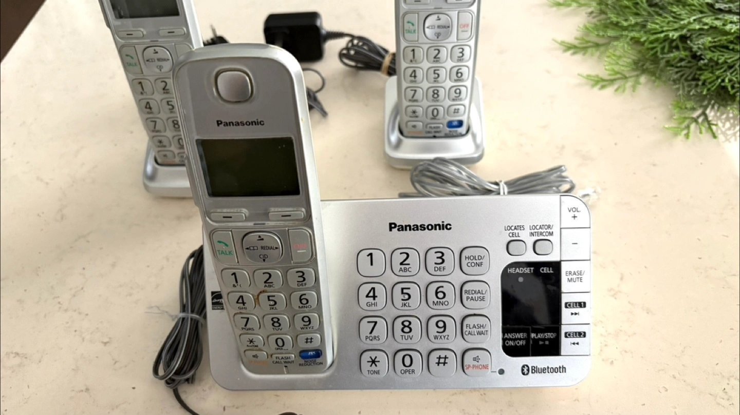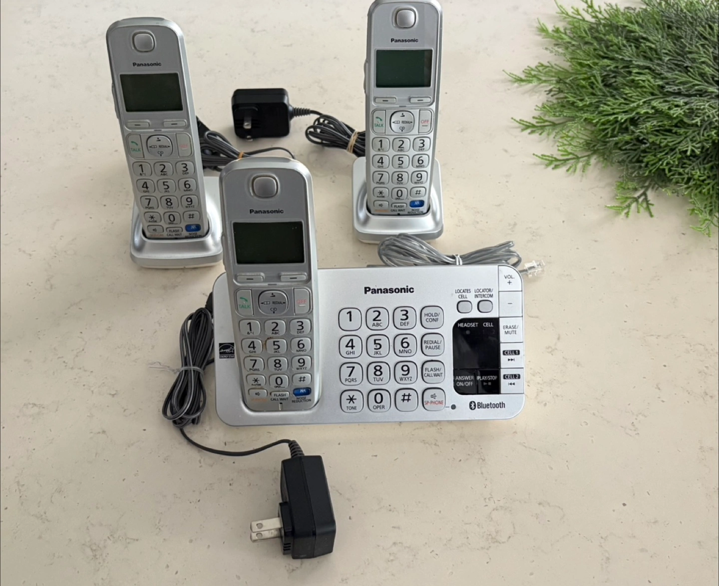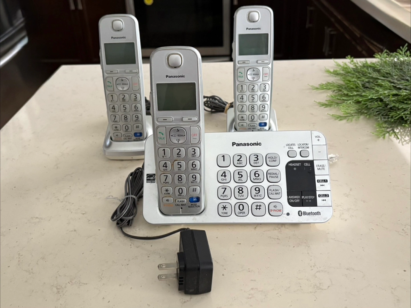 Selling a Panasonic cordless phone system. It comes with 3 handsets and a base station. Includes all necessary chargers and cords. Perfect for a home or small business!