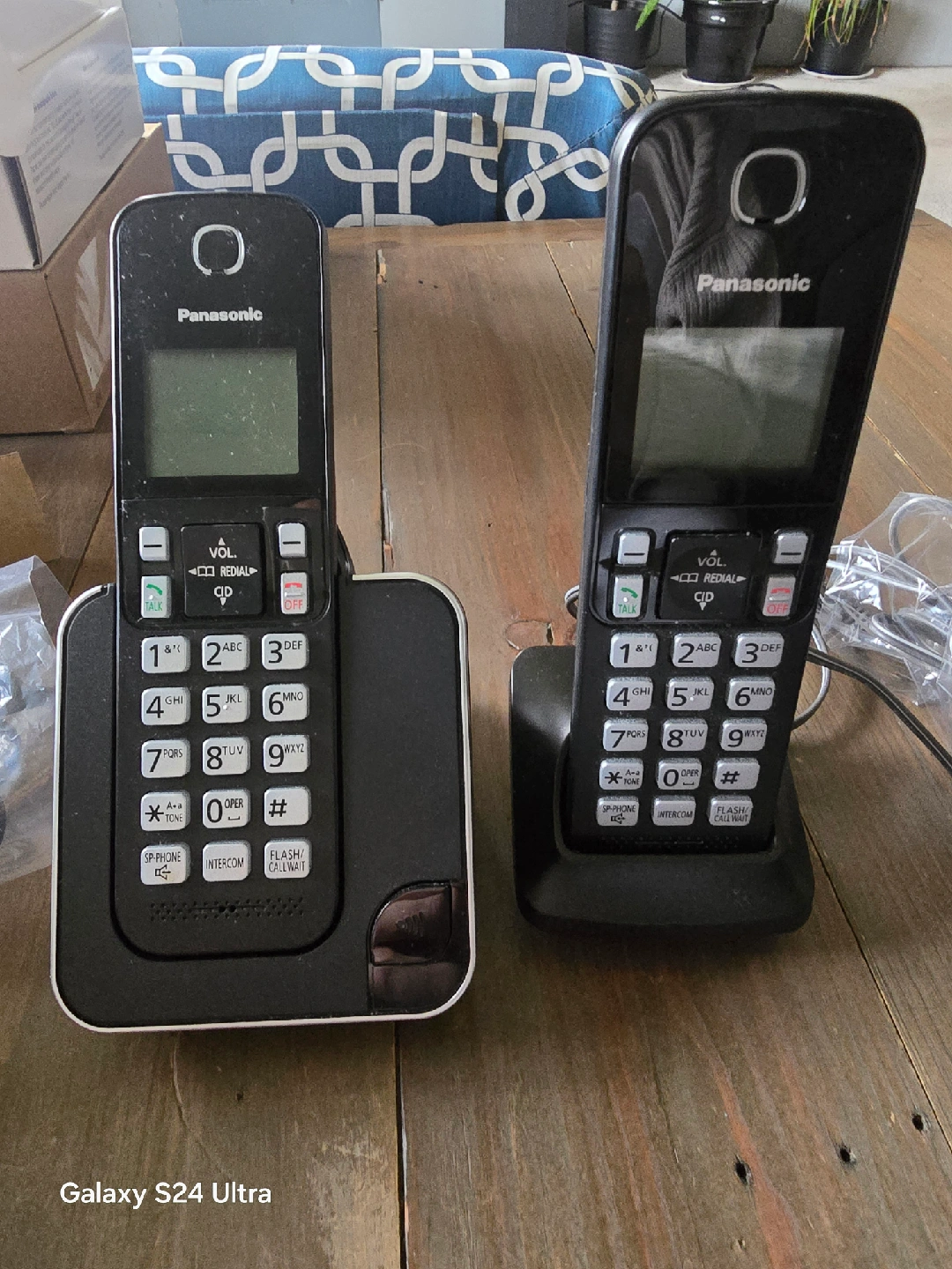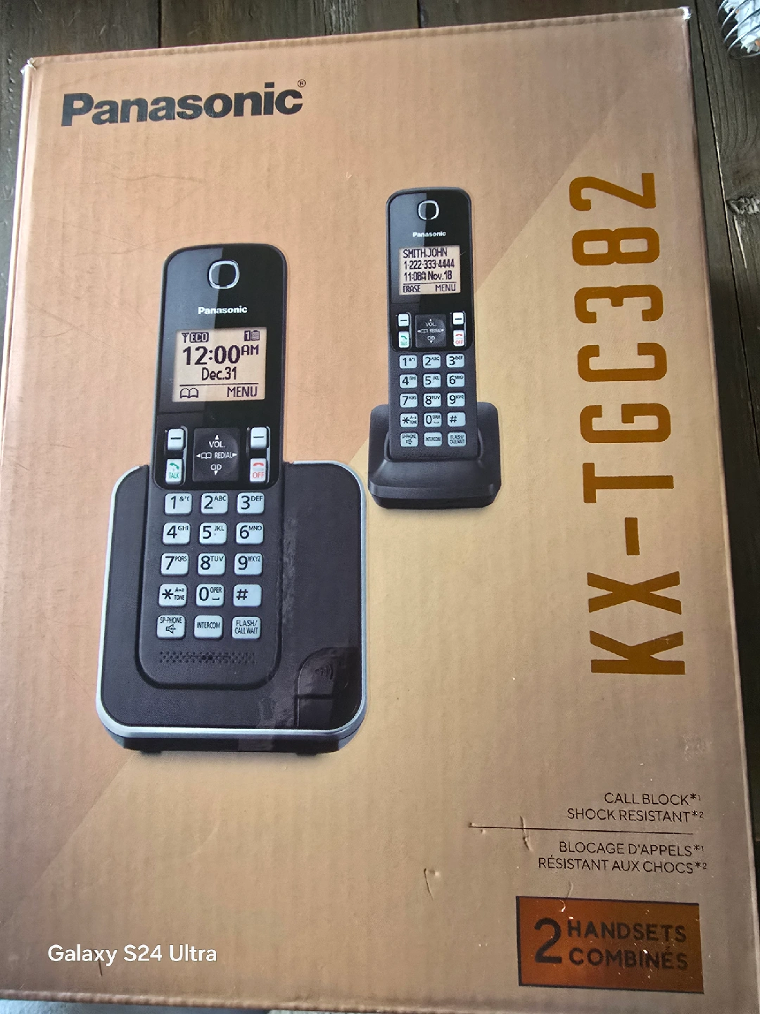 Selling a Panasonic KX-TGC382 cordless phone set with two handsets. It's in great condition and comes with the original box. The phone features call block and is shock resistant. Perfect for home or office use!
