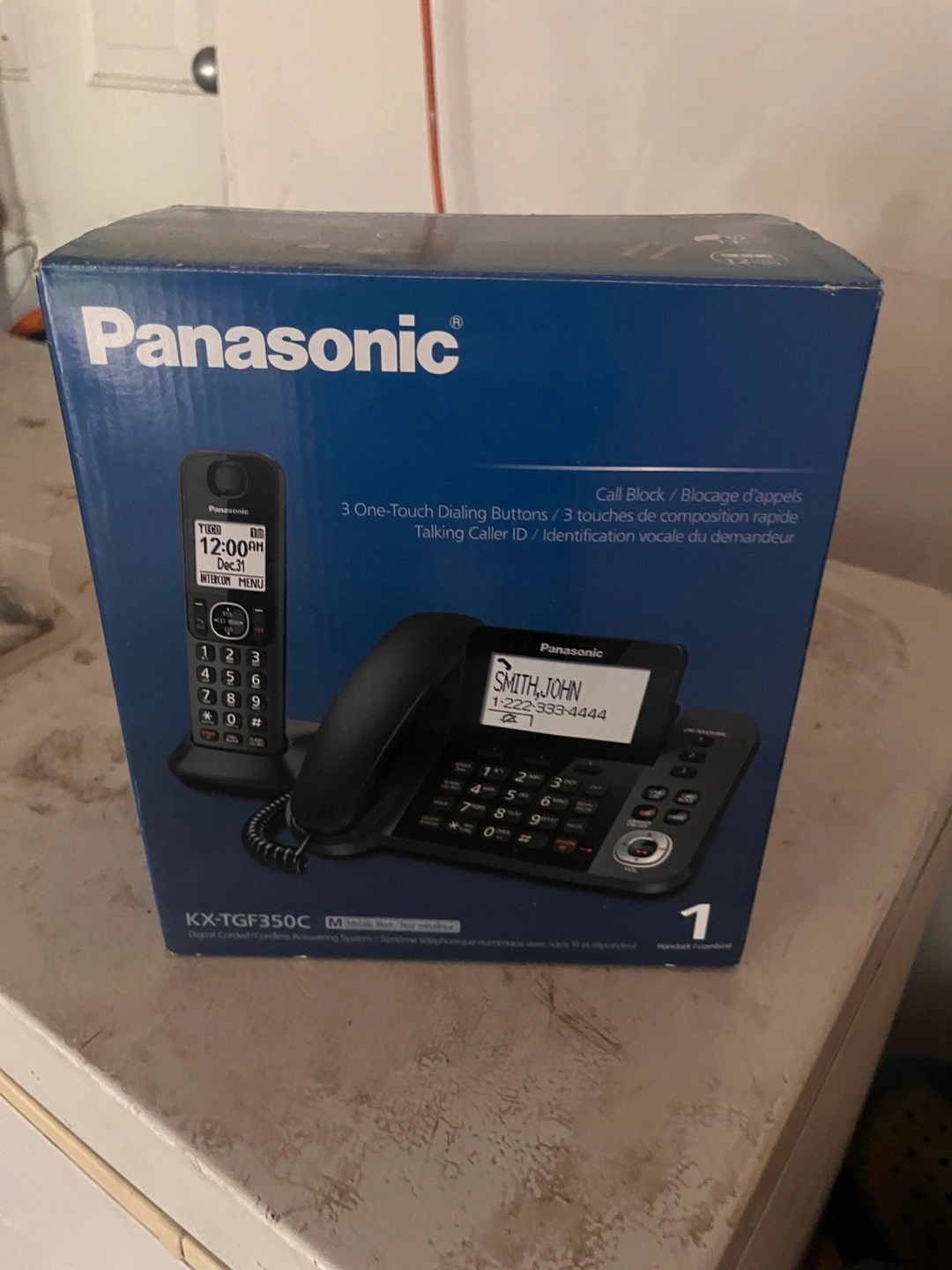New in box Panasonic KX-TGF350C digital cordless answering system. Features 3 one-touch dialing buttons and talking caller ID. Includes answering machine.