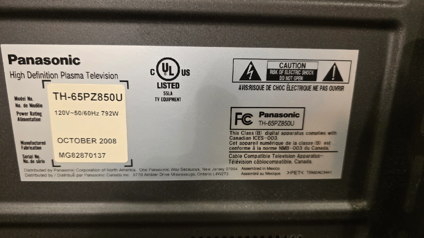 Selling a Panasonic TH-65PZ850U High Definition Plasma Television. This TV was manufactured in October 2008. It's a 65-inch model and operates at 120V~50/60Hz 792W. Perfect for a retro gaming setup or a vintage media room!