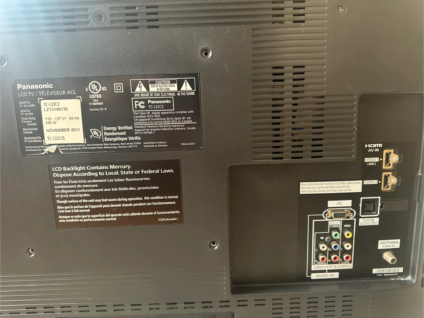Mississauga, Panasonic VIERA TC-L32C3 is a 720p LCD TV model from 2011 working in excellent condition No stand, No remote
