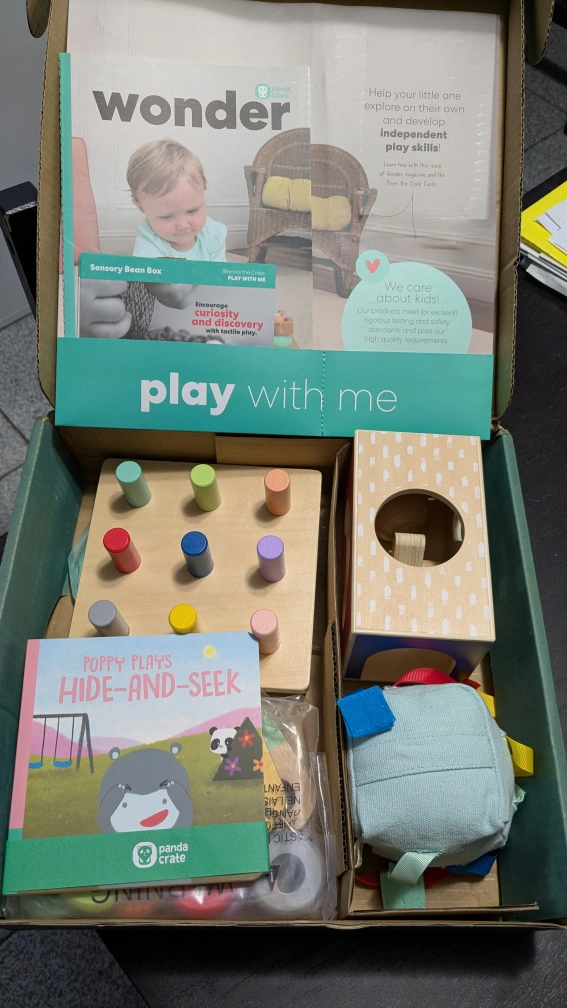 Selling a Panda Crate Sensory Bean Box from the 'Play With Me' series! It includes a variety of engaging toys designed to encourage curiosity and develop independent play skills. Comes with a Wonder magazine and the 'Poppy Plays Hide-and-Seek' book. Perfect for tactile play and helping your little one explore and learn!