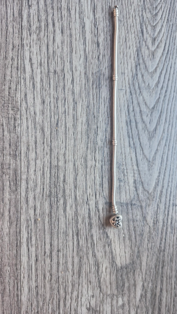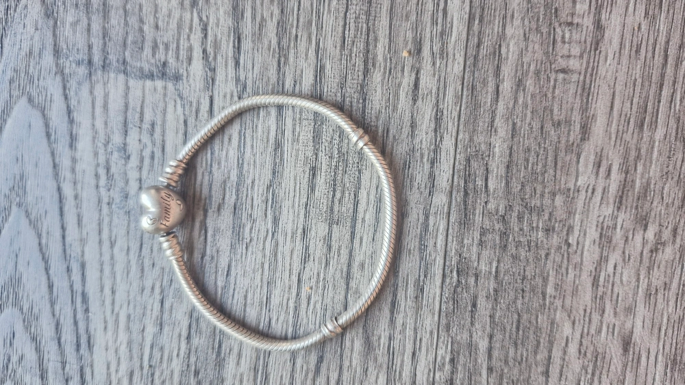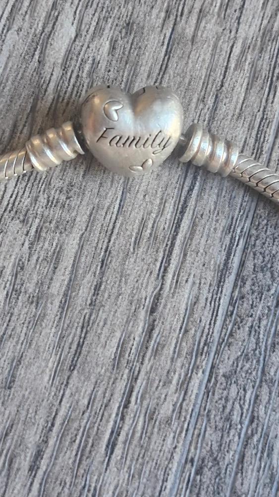 Selling a lovely Pandora charm bracelet in silver. It features a heart-shaped charm with the word 'Family' engraved on it. A beautiful piece to add to your collection!