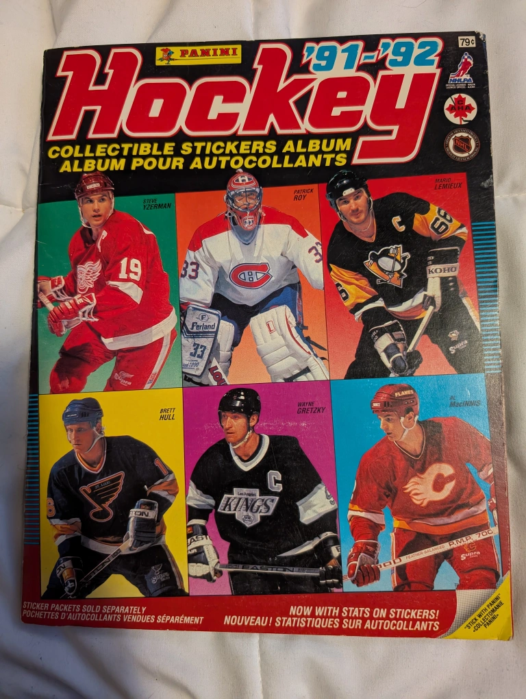 Selling a Panini Hockey '91-'92 collectible stickers album. Features classic players like Steve Yzerman, Patrick Roy, and Wayne Gretzky. A great piece for any hockey fan or collector! Has all stickers completed in good condition (I collected them myself).