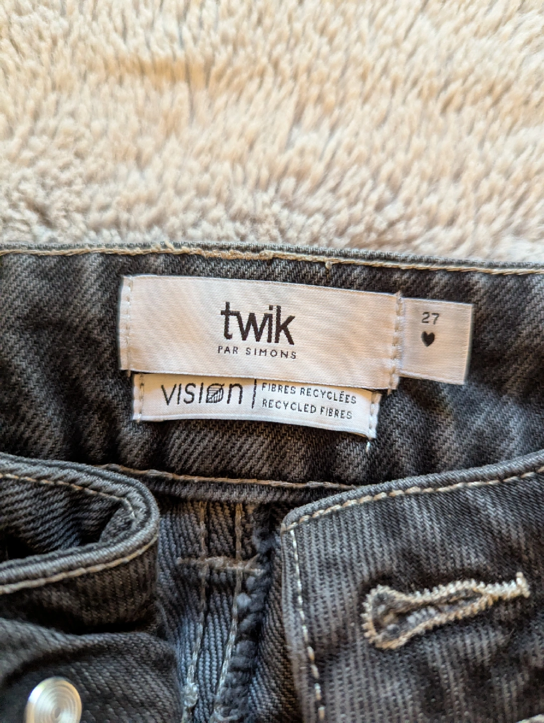 Je vends un pantalon Simons Twik Vision de taille 27. Il est en excellent état et fait de fibres recyclées! Parfait pour un look décontracté et confortable