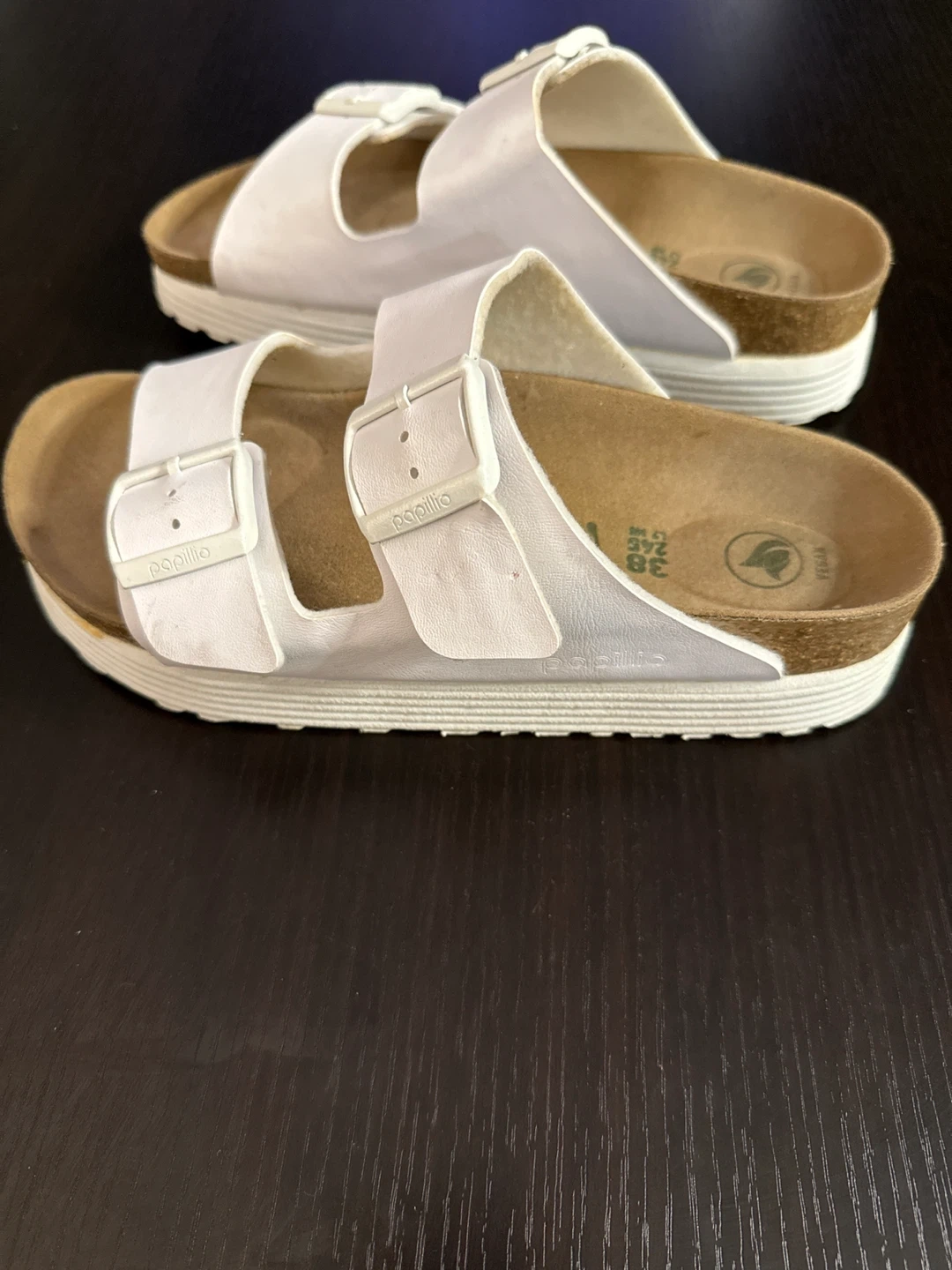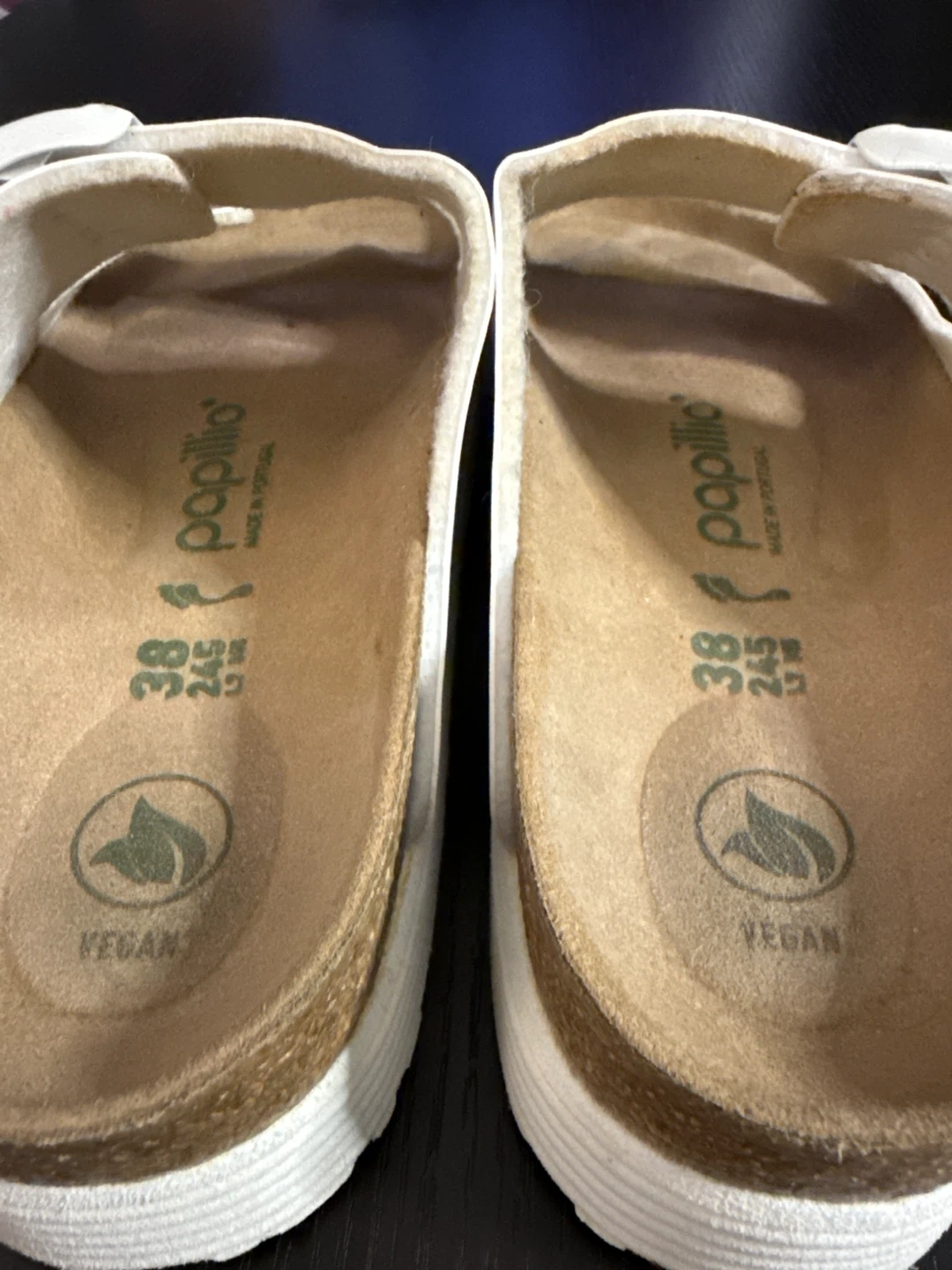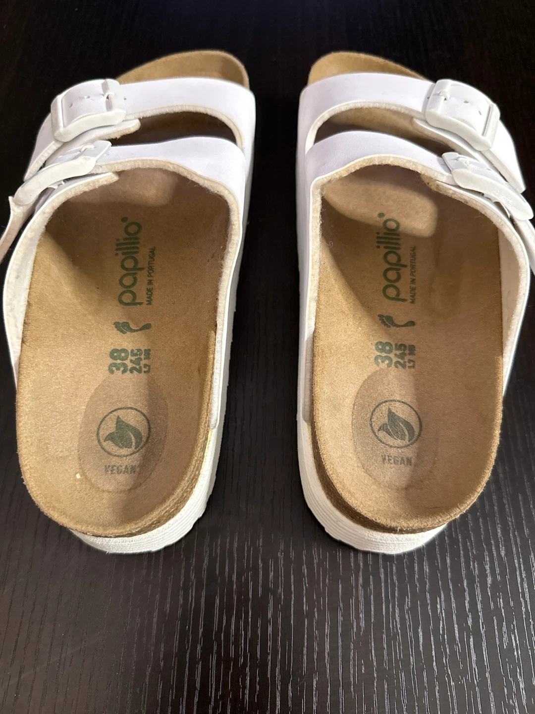 Selling a pair of Papillio by Birkenstock sandals in size 38 (US 7). They're white and in great shape! The footbed is vegan, and they're super comfy for everyday wear