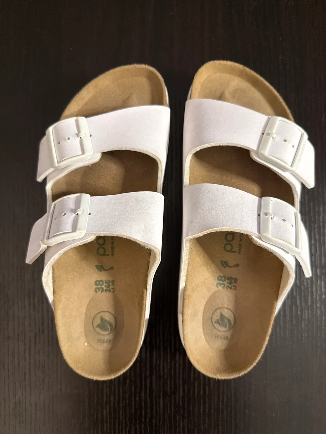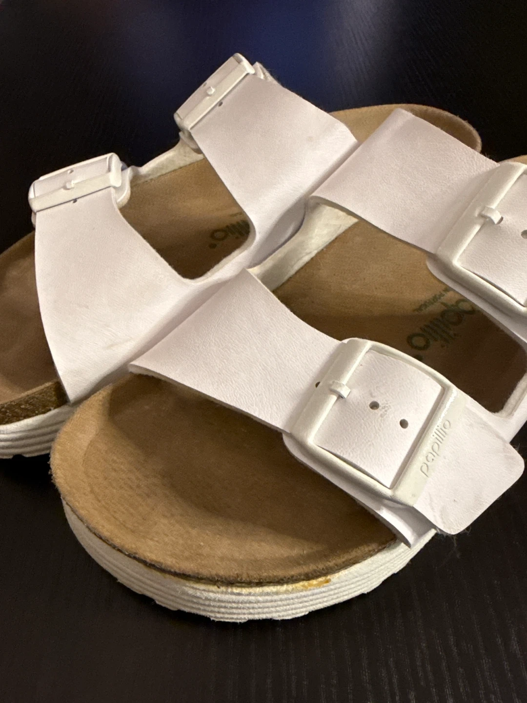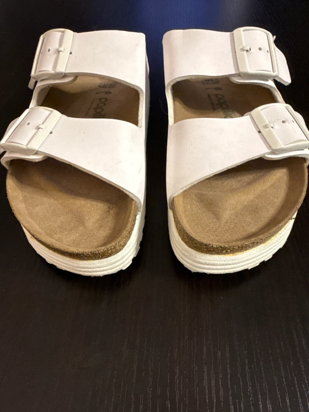 Selling a pair of Papillio by Birkenstock sandals in size 38 (US 7). They're white and in great shape! The footbed is vegan, and they're super comfy for everyday wear