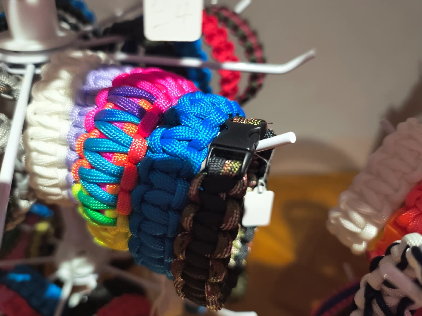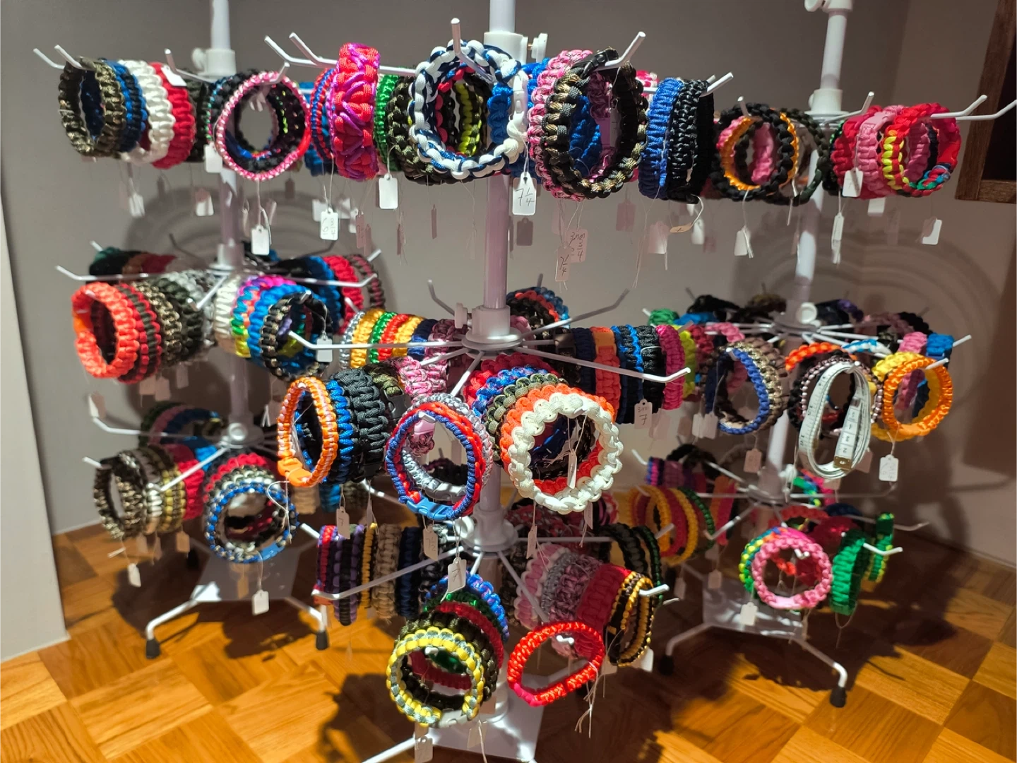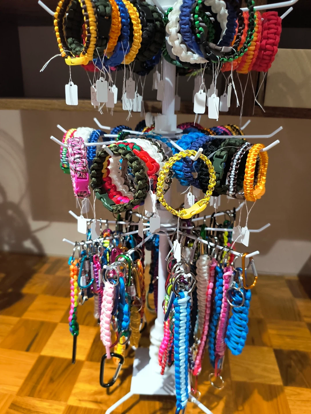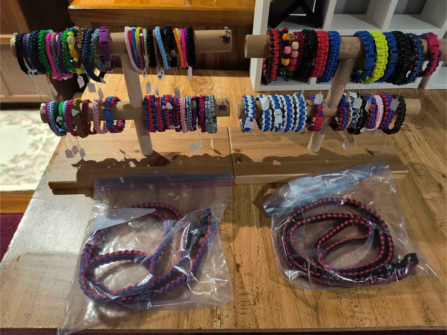Large collection of paracord bracelets/keychains. 1mm, 2mm, and 4mm paracord in sizes 5.5 inches to 8.5 inches. Ideal for selling at a booth for Christmas. Maker unable to man booth due to medical issue. Total of 310 bracelets, 310 keychains plus 6 display trees and 2 smaller display stands. Bracelets in 1 color, 2 color, and 3 color with weaves in cobra design as well as unique custom weaves, some lobster claw bracelet closures. Various colors such as 6 maple leaf and 6 buffalo bills colors Some designs with accent color paracord size and colors such as wrap around heart shapes in contrasting paracord color and size. Most bracelets tagged for size. 2- 4 foot heavy duty dog leashes, $30 each. Booth selling value $2500 to $3000. $1200 firm.