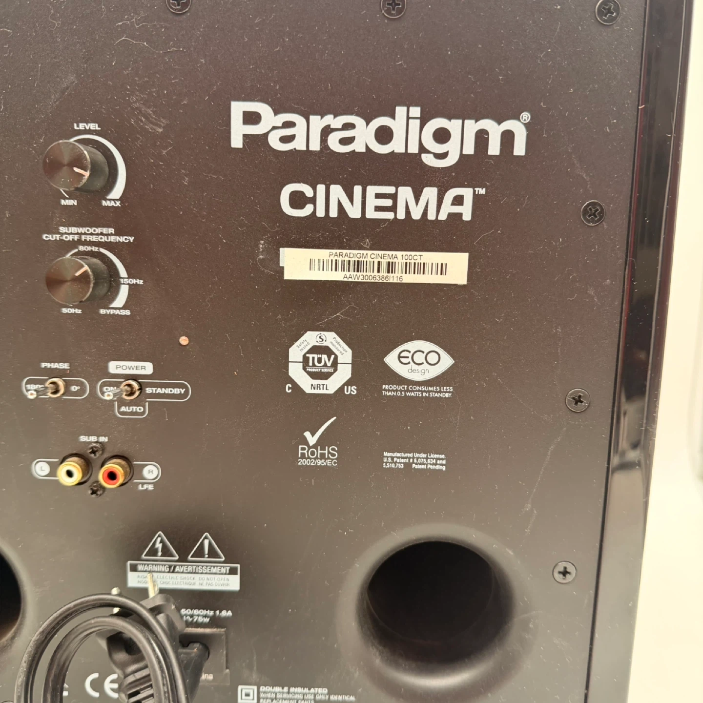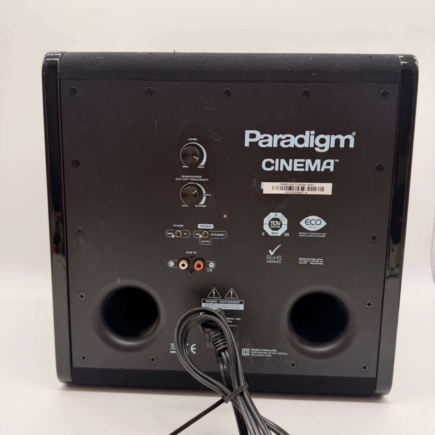 Paradigm Cinema 100CT powered subwoofer in great working condition. Delivers deep, clean bass — perfect for music, movies, or upgrading your existing Paradigm system. ✅ Model: Cinema 100CT ✅ Built-in Amplifier ✅ Dual Ported Design ✅ Controls: Level, Subwoofer Cut-off Frequency, Phase Switch (0° / 180°) ✅ Connections: RCA / LFE Input ✅ Power: 100–240V, 50/60Hz, ~75W ✅ Finish: Gloss black with cloth grille ✅ Condition: Used, tested and working properly (minor cosmetic wear) ✅ Includes: Subwoofer unit + power cord 📍 Pickup: North York (or your location) 🚚 Delivery / Shipping: Available at buyer’s cost 49 up