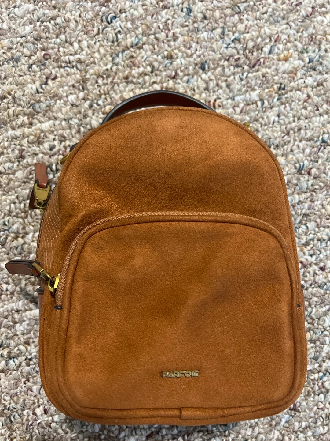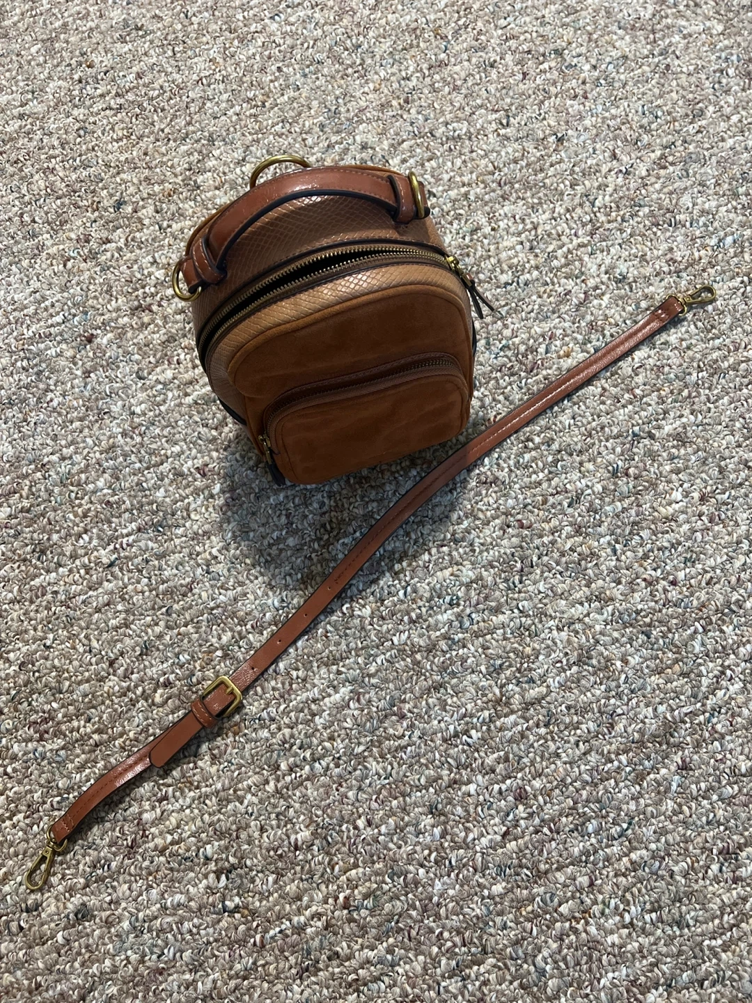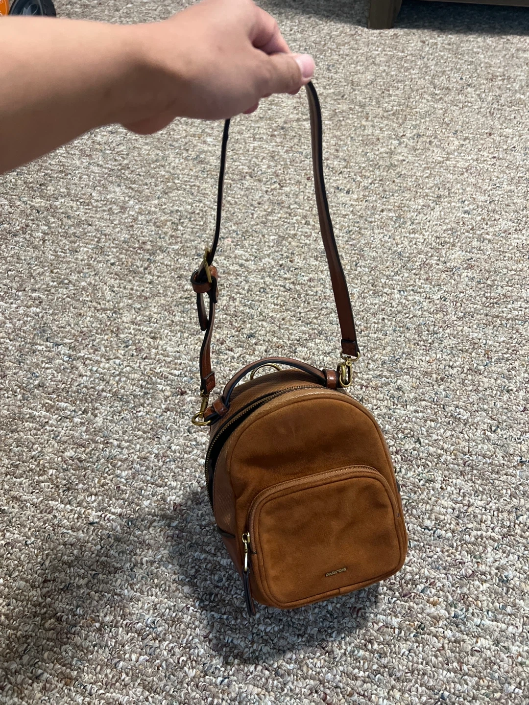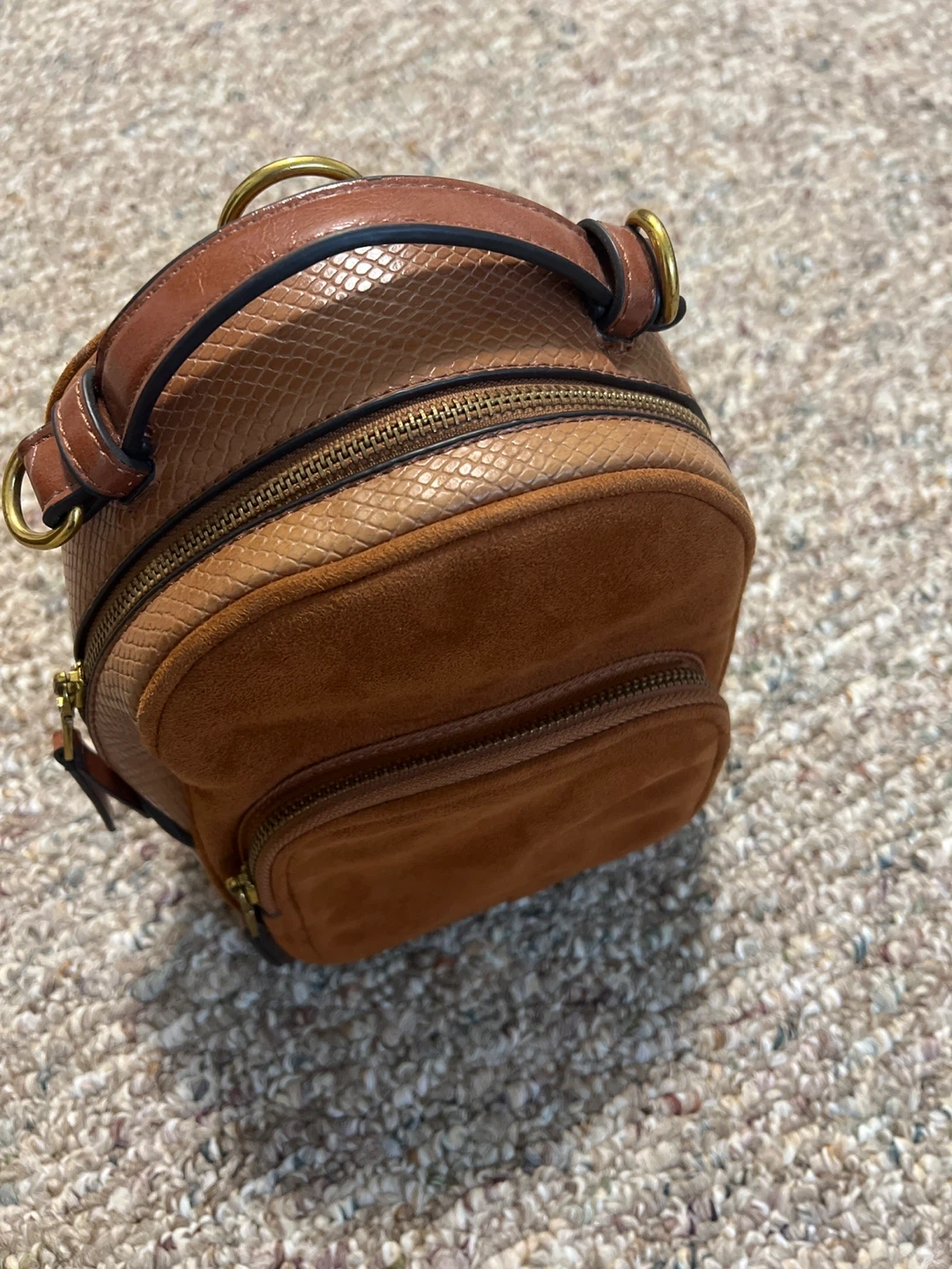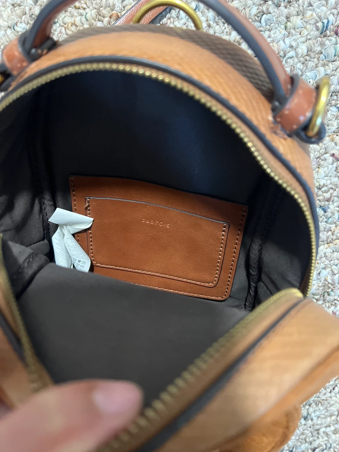 Here's a cute mini backpack from Parfois! It's brown and comes with a shoulder strap. Perfect for carrying your essentials in style!