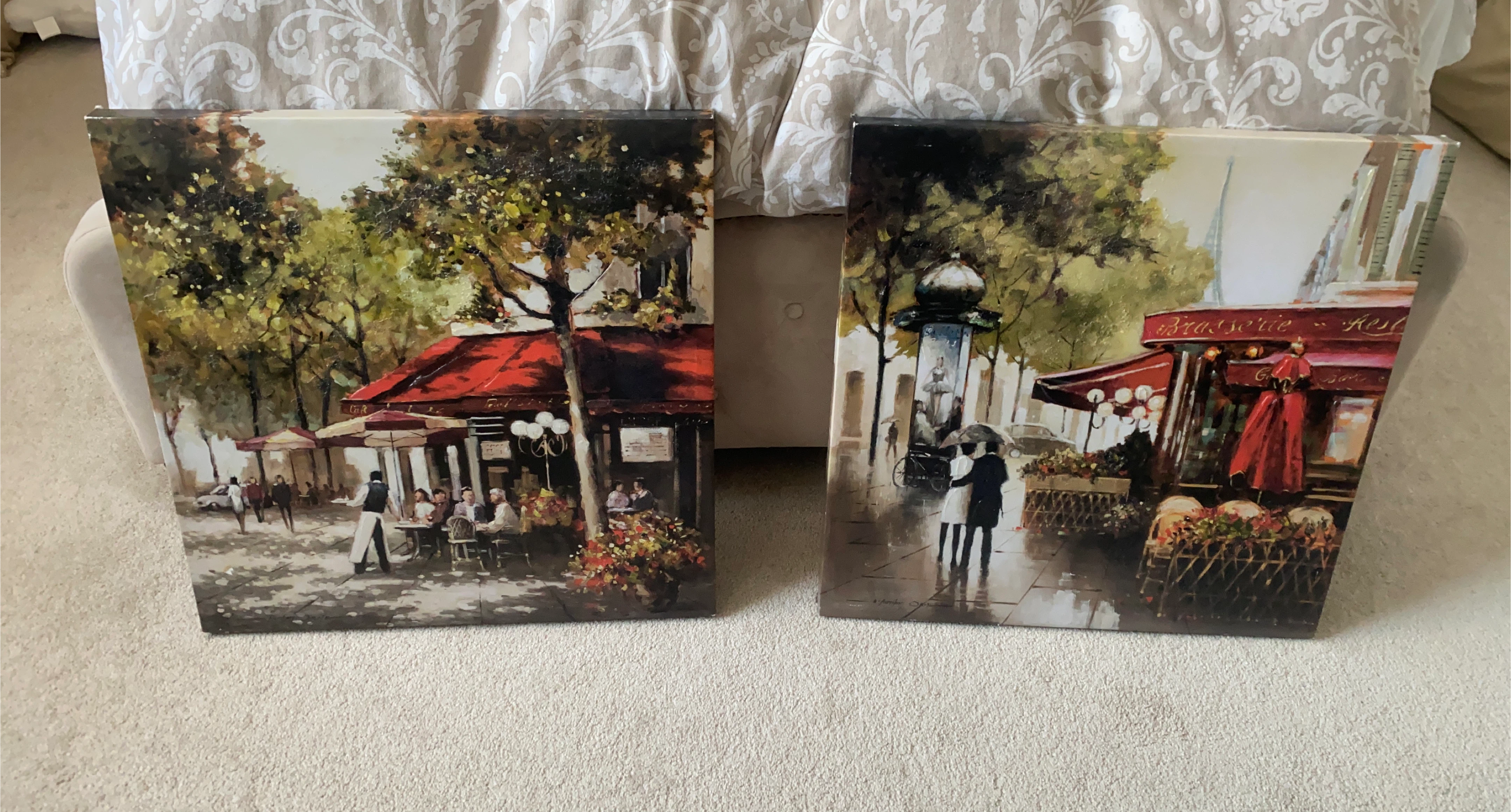 Selling a set of two canvas wall art pieces depicting scenes from Parisian cafes. They add a touch of European charm to any room! The colours are vibrant and the scenes are lively, perfect for creating a cozy atmosphere in your home