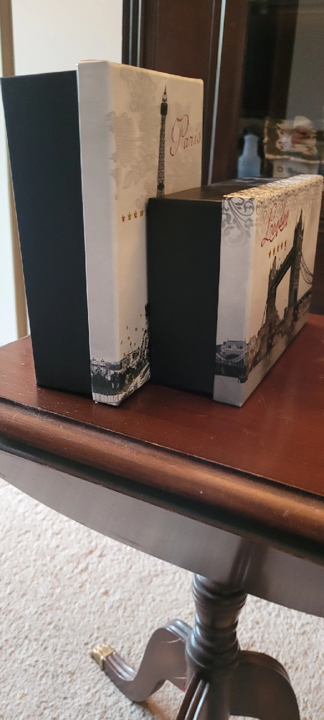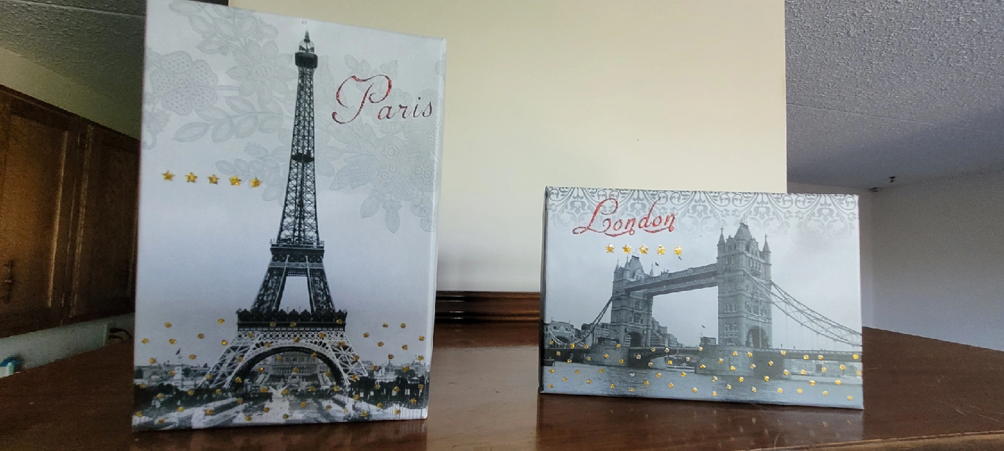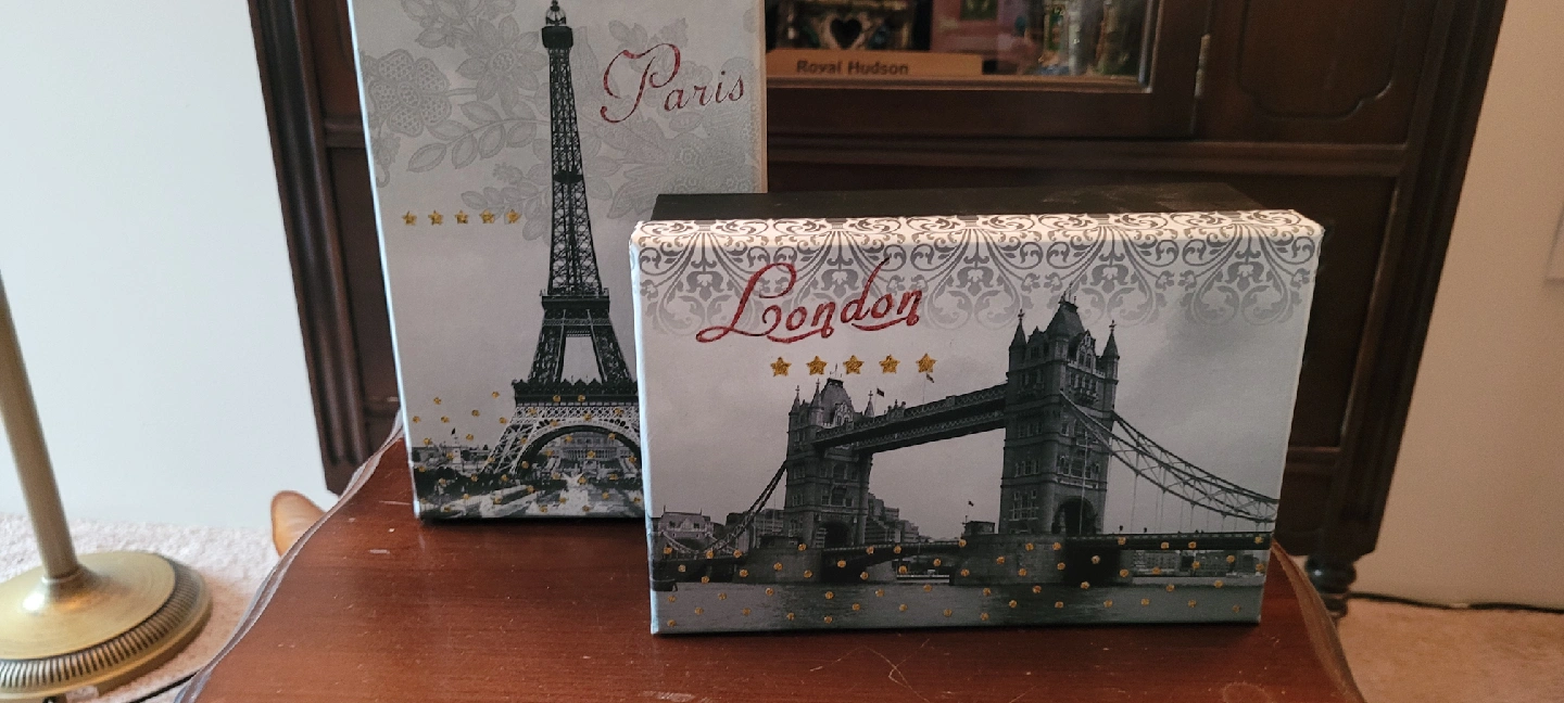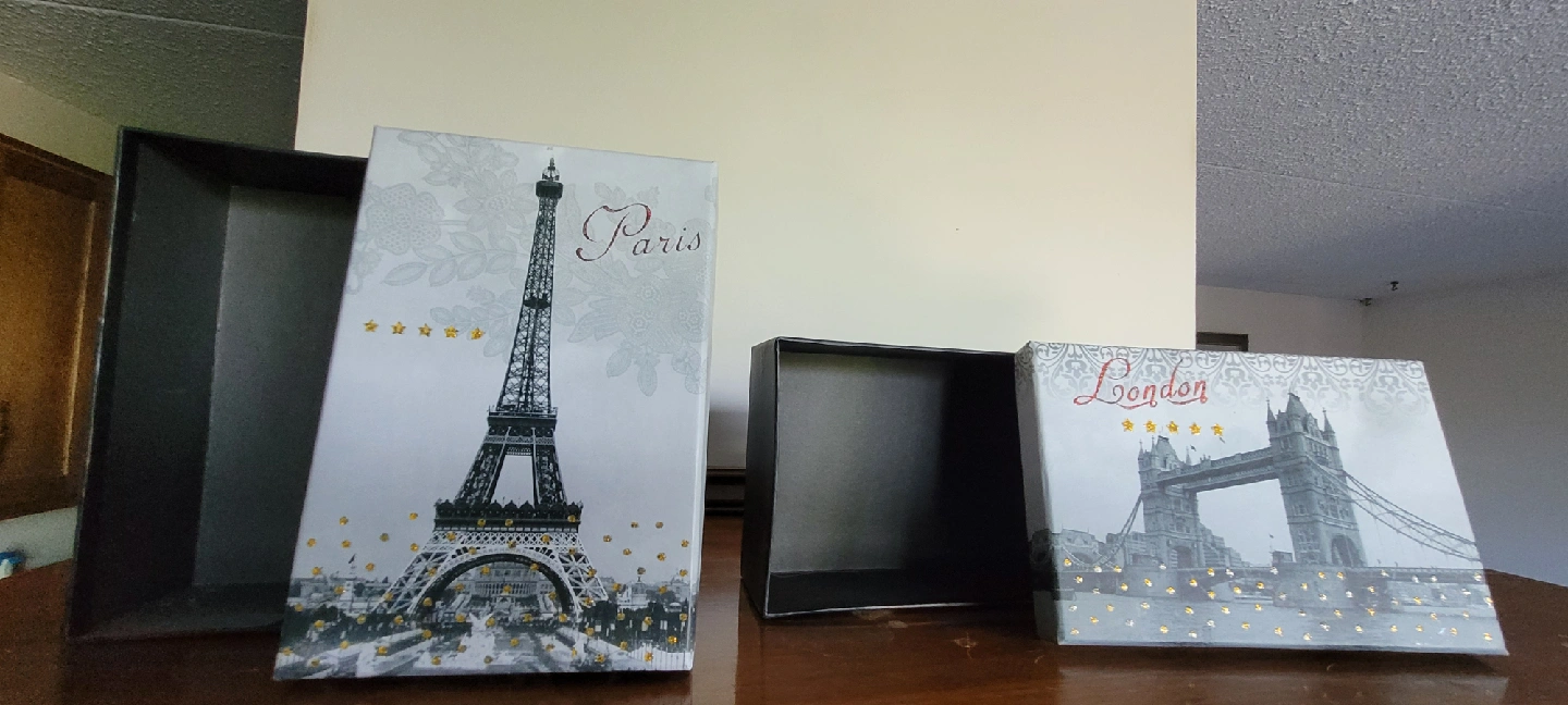 Cute set of decorative boxes featuring Paris and London themes! These boxes are perfect for adding a touch of international flair to your home decor or for storing small items 7.5 x 5 x 3