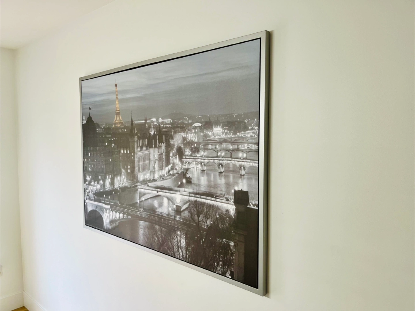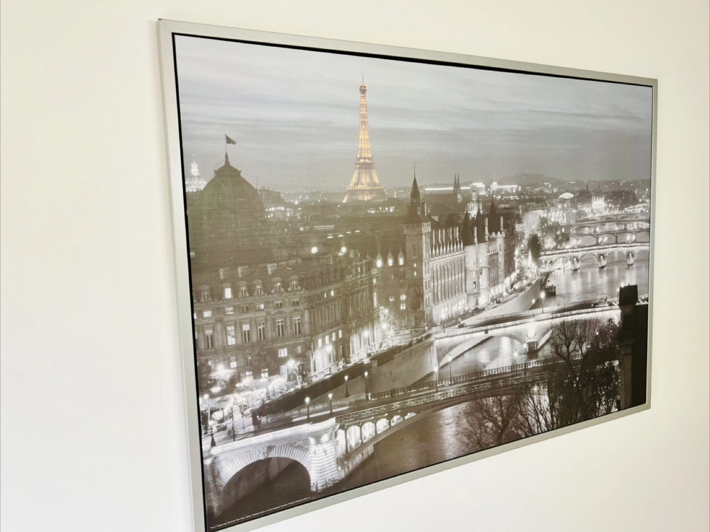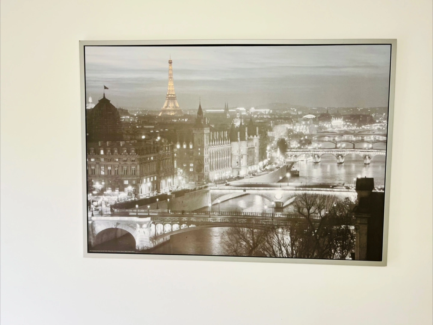Large framed canvas print. Sepia-toned image of Paris at night. Features Eiffel Tower and bridges. Modern silver frame. Great for living room or bedroom.