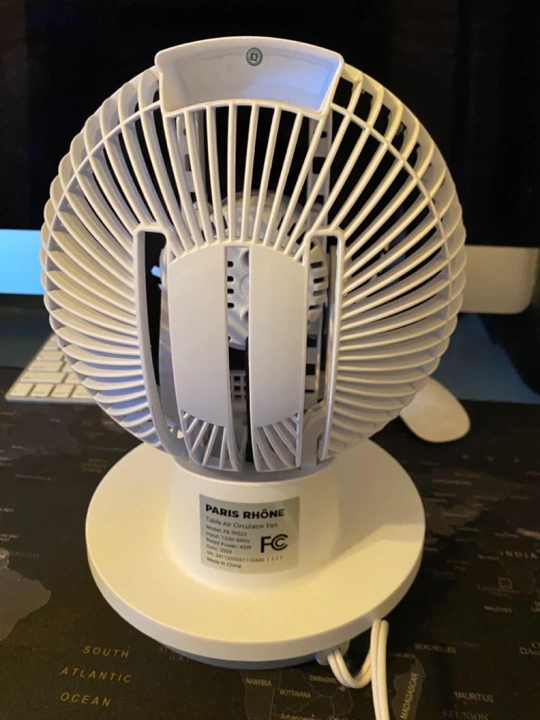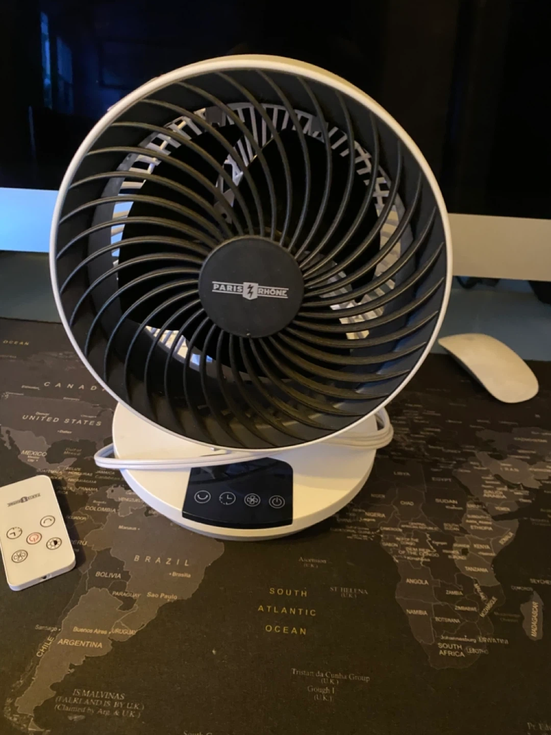 Selling a Paris Rhone table air circulator fan! It's Brand New!! Never been used!. It comes with a remote control for easy adjustments. The model number is PE-TF022. It has a rated power of 45W.