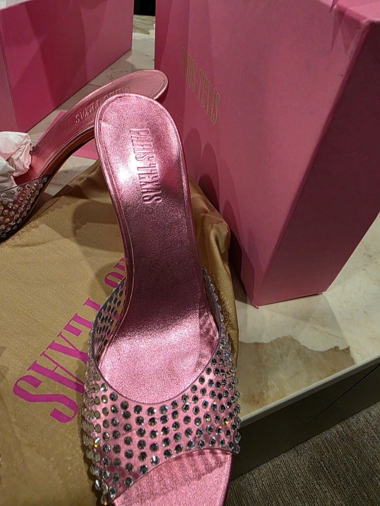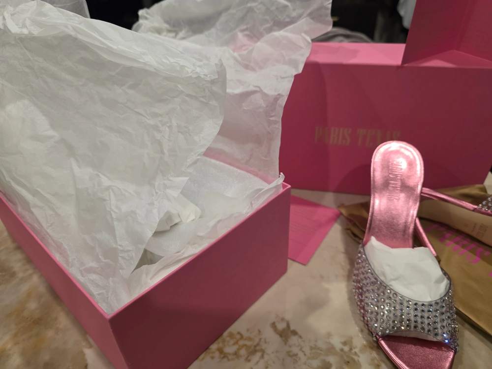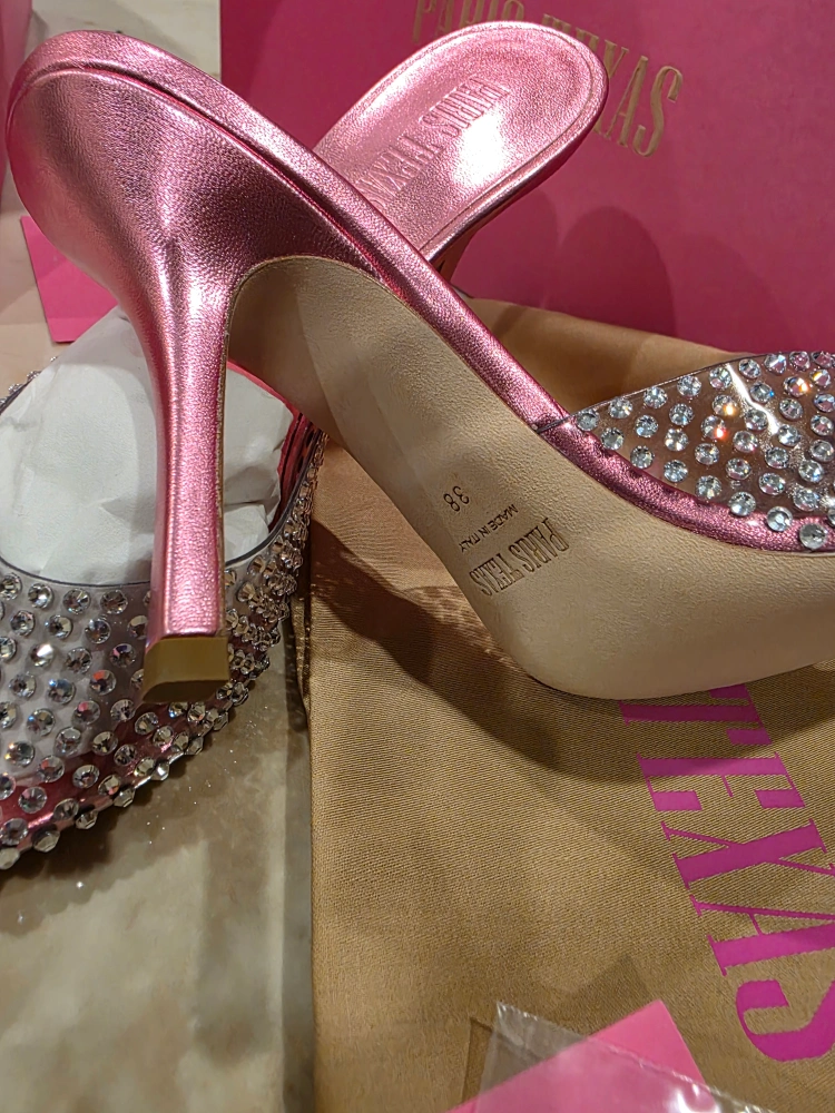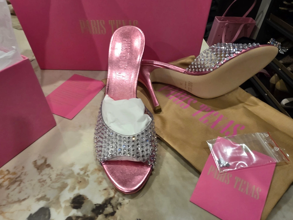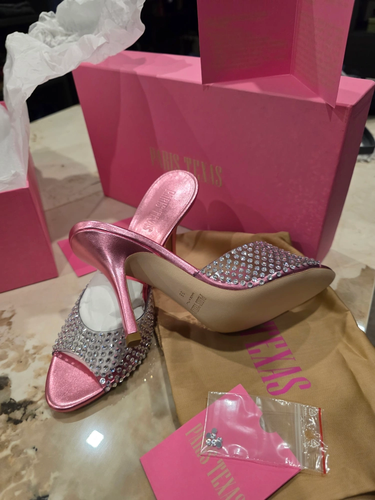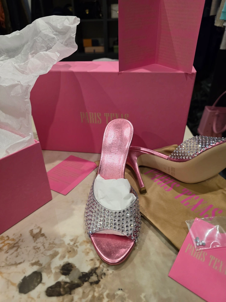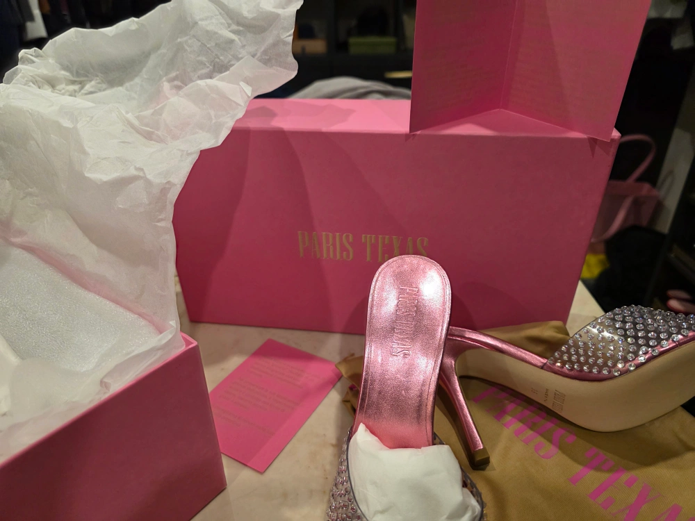 Selling a pair of original Paris Texas mule heels in size 38. They are a beautiful pink colour with rhinestone embellishments. Comes with the original box and dust bag! Brand new never worn!!!!