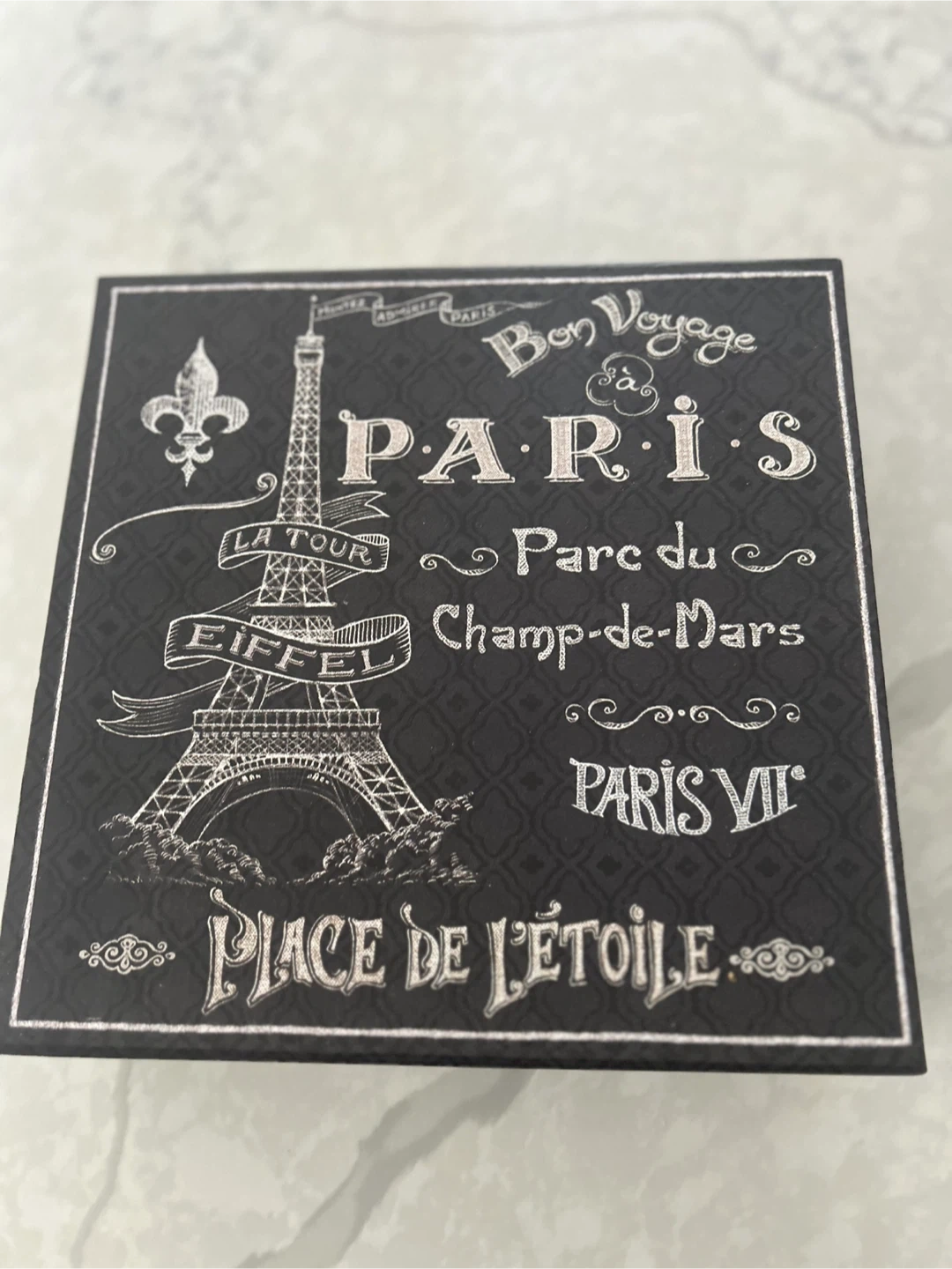 A charming Paris-themed box featuring iconic landmarks like the Eiffel Tower and Place de l'Étoile. Perfect for storing keepsakes or adding a touch of Parisian flair to your decor