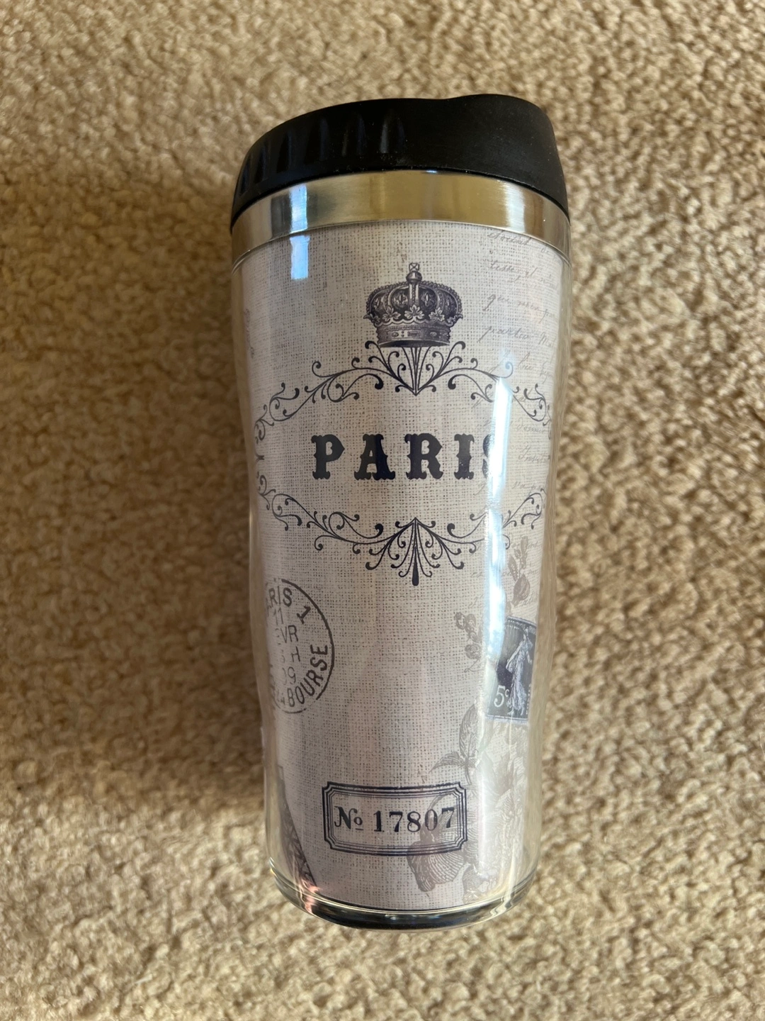 Reusable travel mug. Features Paris design. Keeps drinks hot or cold. Great for travel or everyday use. Smoke free home Brand new Pick up near Glenanna road and Hwy 2