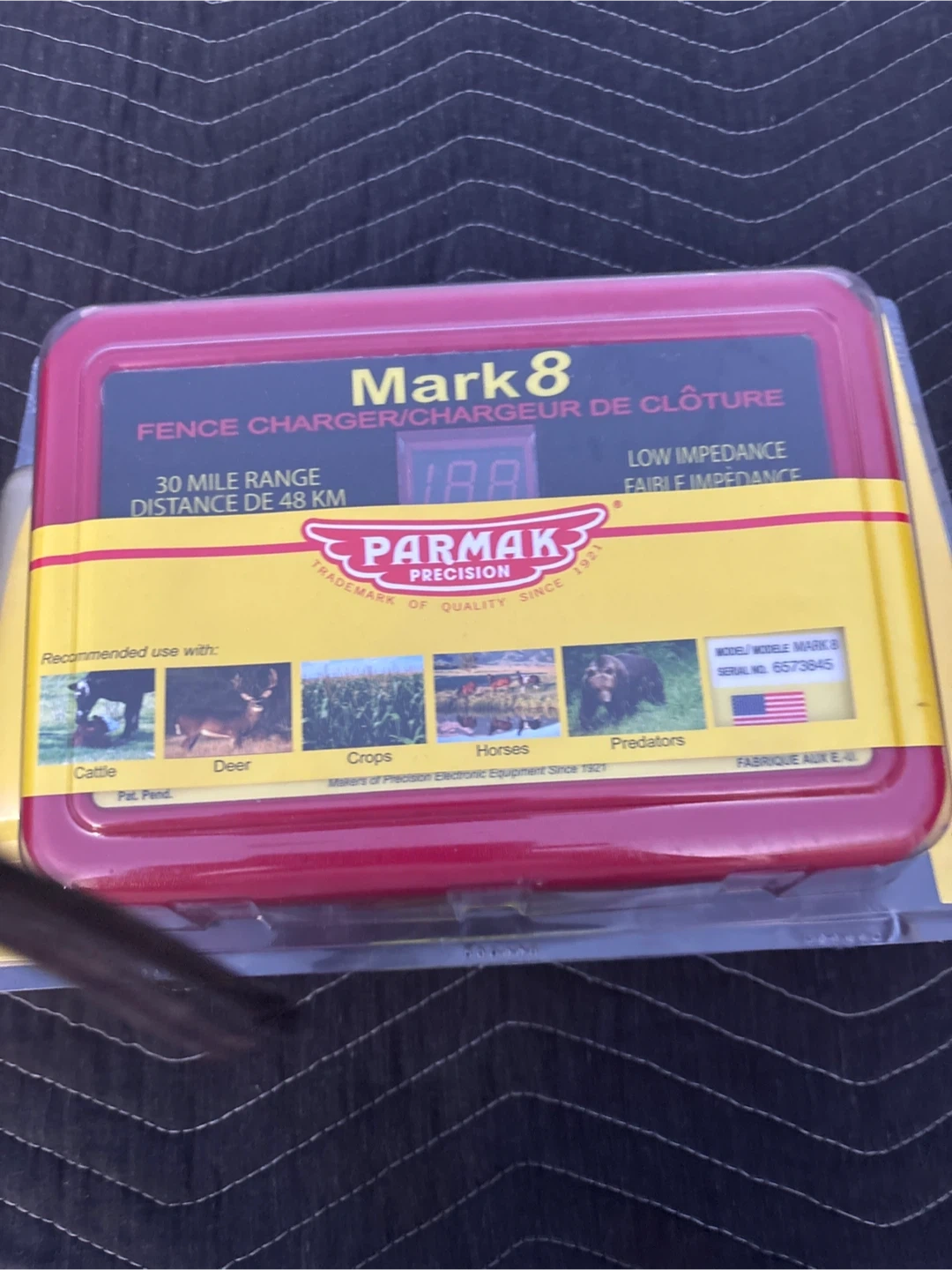 Selling a Parmak Mark 8 Fence Charger! It has a 30-mile range and is recommended for use with cattle, deer, crops, horses, and predators. It also features low impedance.