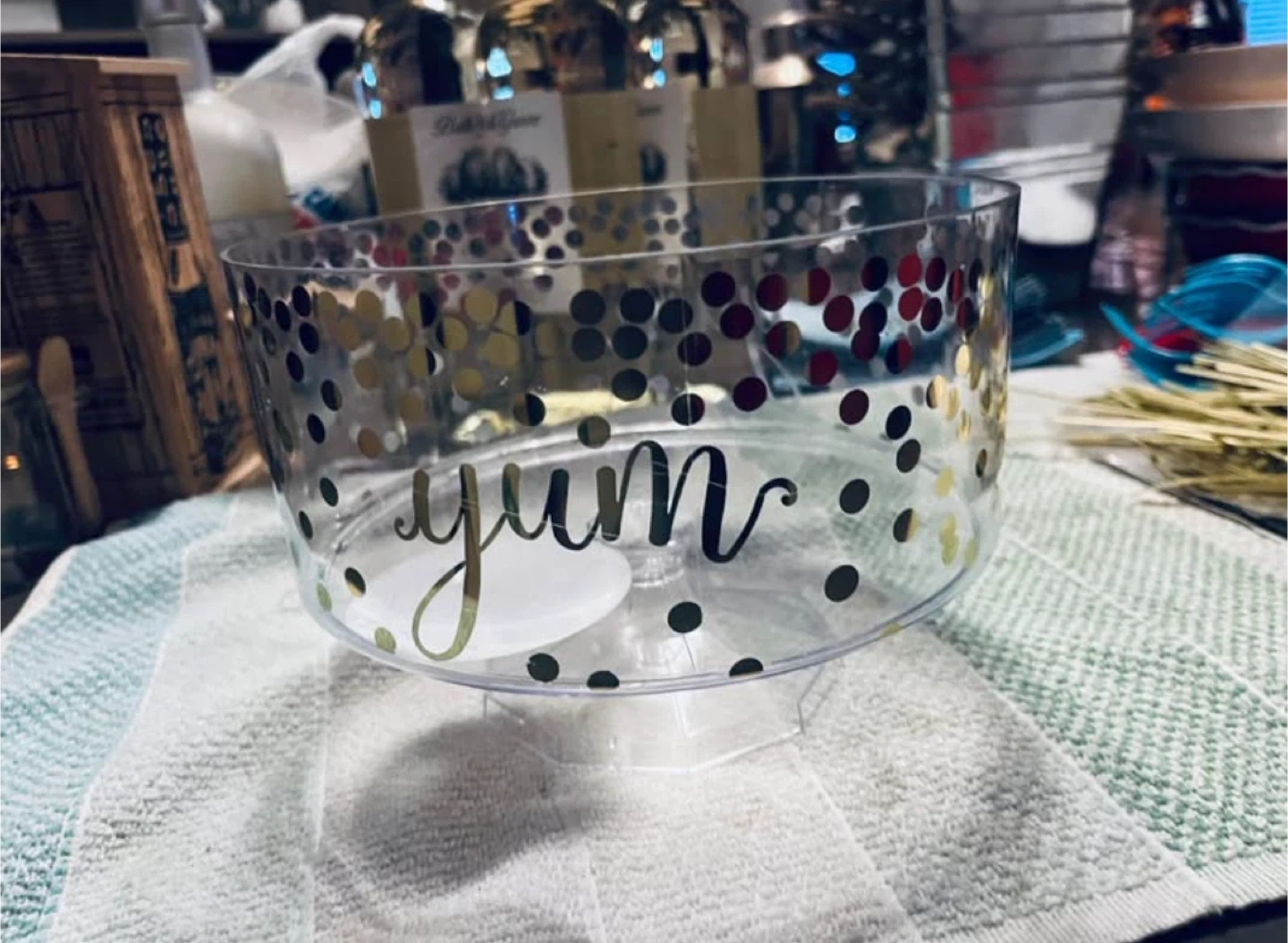 Party supply 2- Enjoy candy bucket 3- yummy candy buckets 2- yummy candy bowl 2 - multi sorted dish 2 - medium black bowls 2- small white bowls 1- white serving tray 3- plastic juice jug 21 - plastic champagne glasses Candy bags with ties Gold plastic cups All sold together, used once and cleaned More pictures if requested