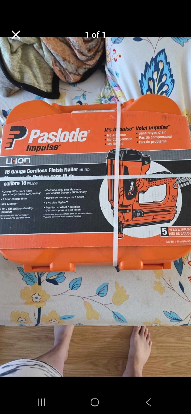 Selling a Paslode Impulse 16 Gauge Cordless Finish Nailer IMLI250. It drives 50% more nails per charge (up to 6,000 nails) and has a 1-hour charge time. It's also 8% lighter than previous models. It also features an on/off battery standby position.