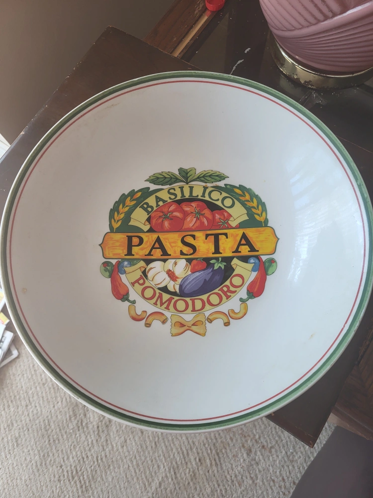 A large white serving bowl. Features a decorative pasta design in the centre. The rim has a red and green border. A great bowl to use for a cozy pasta night.
