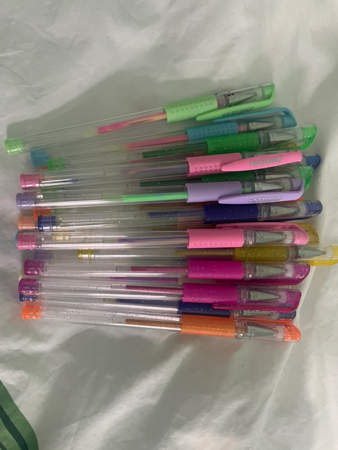 Bulk lot of pastel coloured glitter gel pens. Clear barrels, various colours. Great for journaling, art, and more.