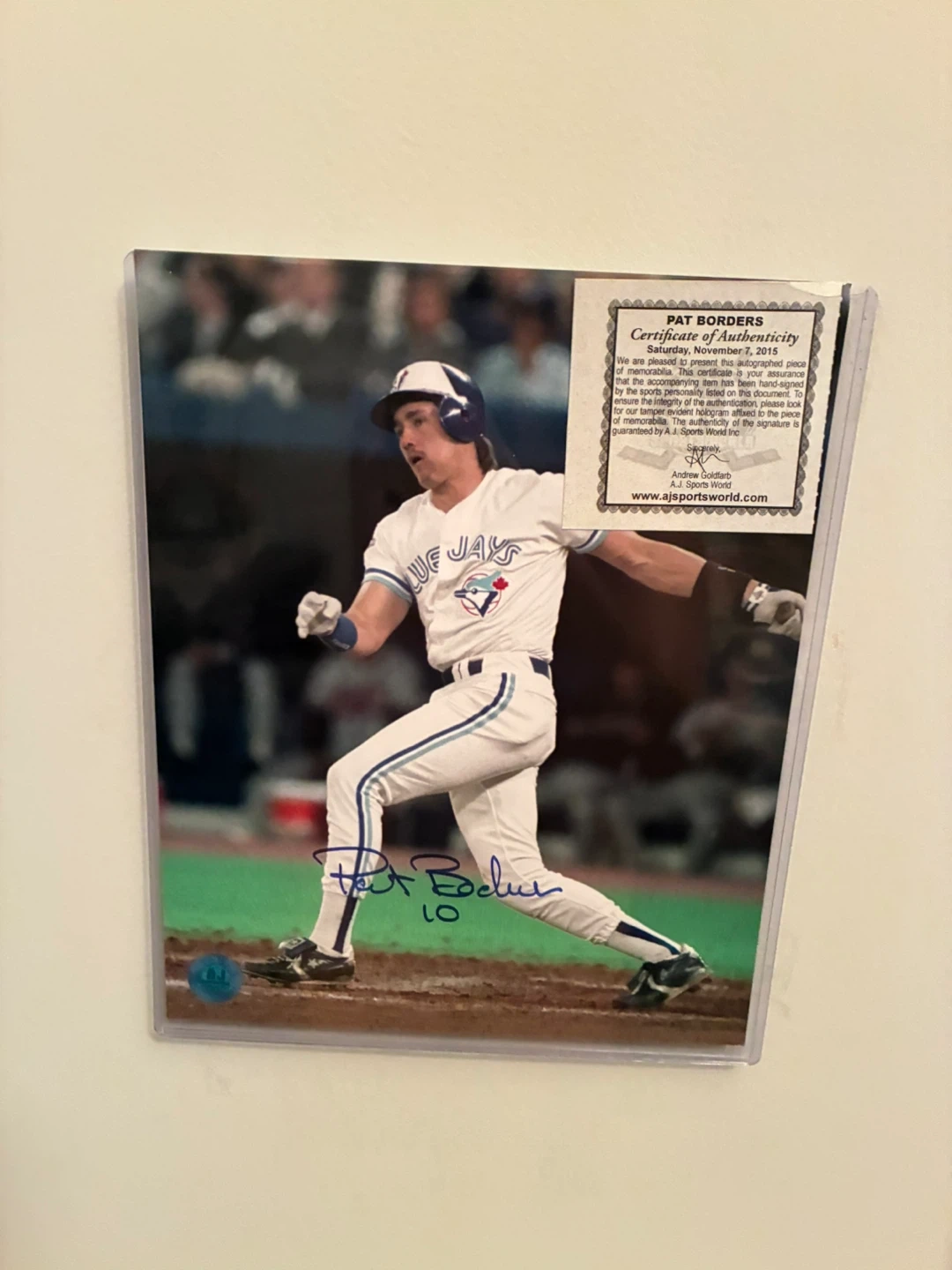 Selling a Pat Borders autographed photo of him playing for the Blue Jays. It comes with a Certificate of Authenticity from A.J. Sports World, dated November 7, 2015. A great piece for any Blue Jays fan!
